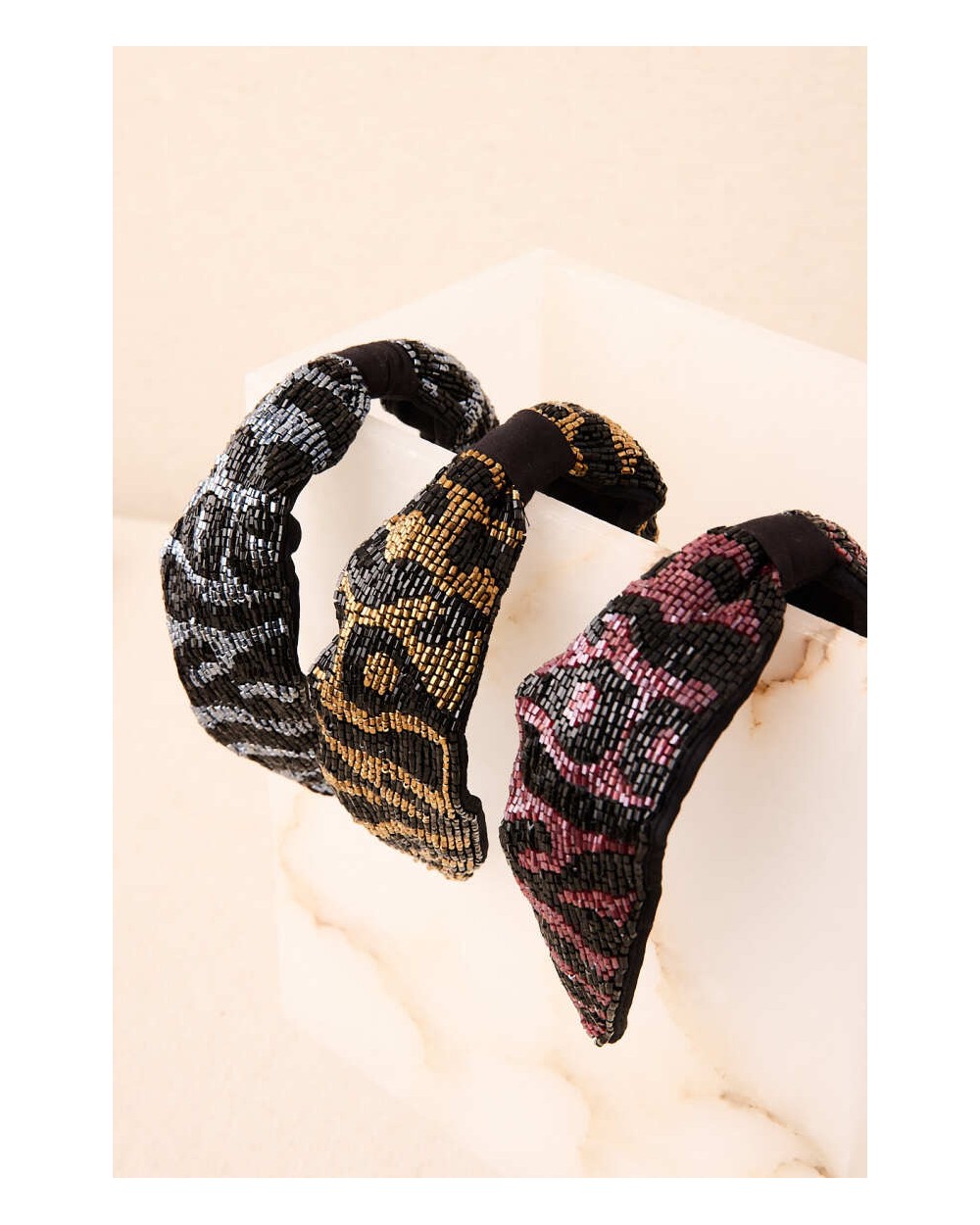 Diadema de abalorios cosidos a mano con cuentas de colores sobre una base de tejido natural.