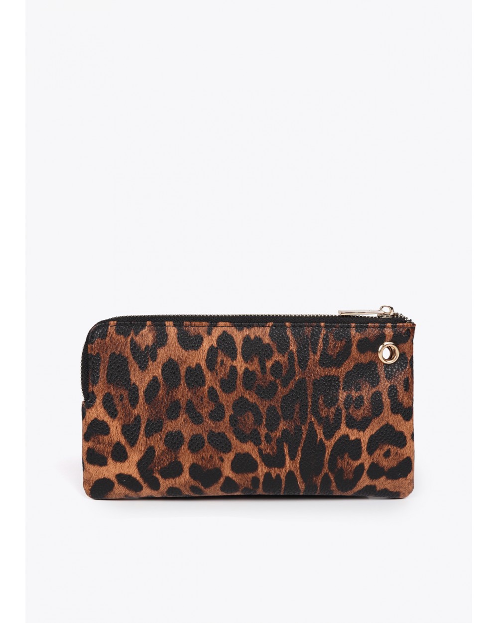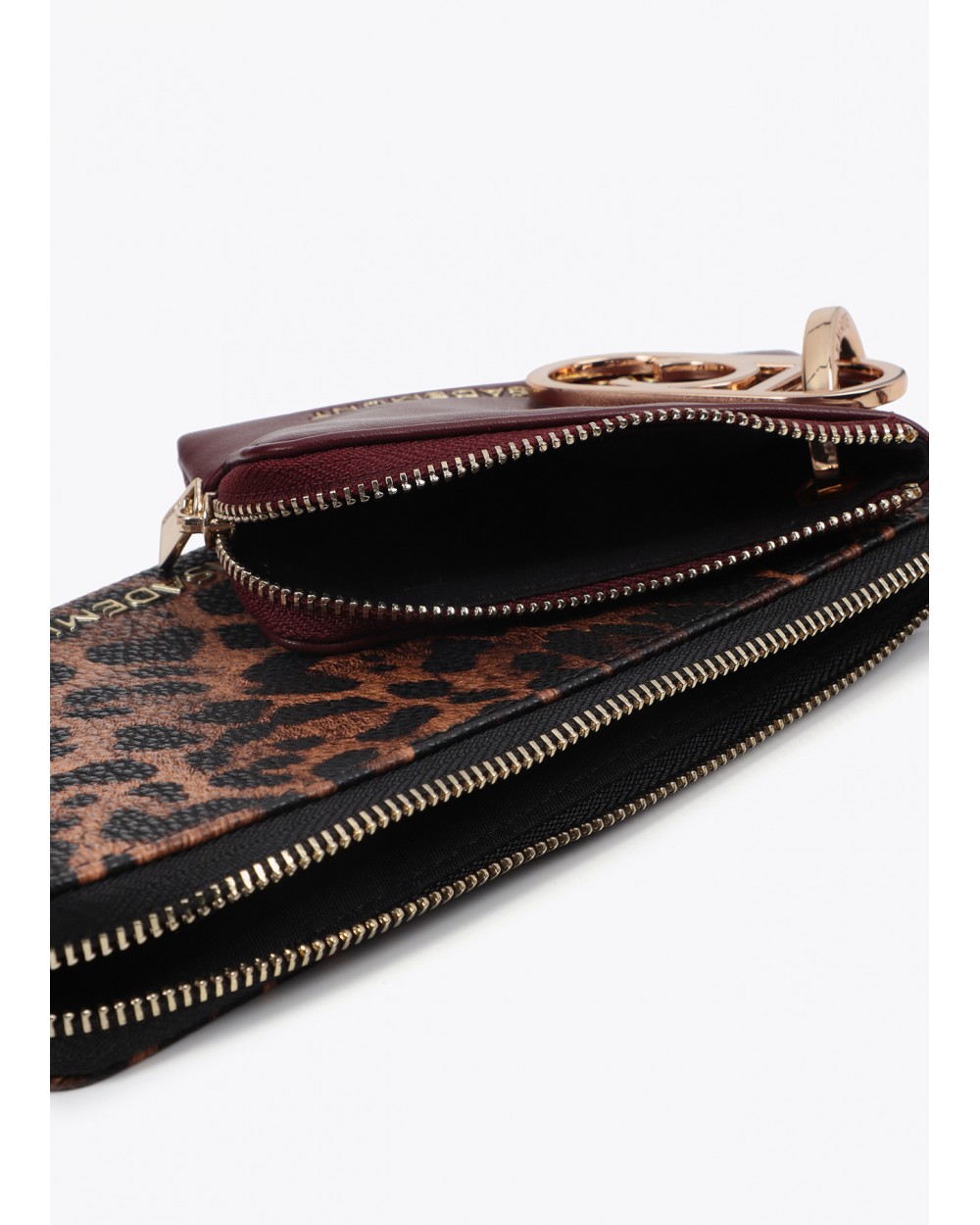 Cartera en tono bicolor, uno en estampado leopardo y otro màs pequeño en color marròn, con logo en metal ovalado de la marca a modo de charm, logo en dorado en la parte de delante de cada billetera. Cierre con cremallera y correa para muñeca.