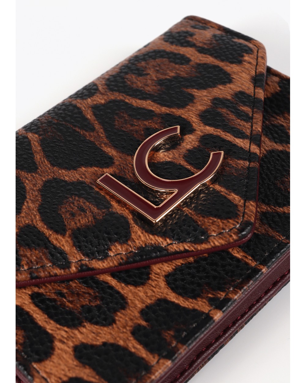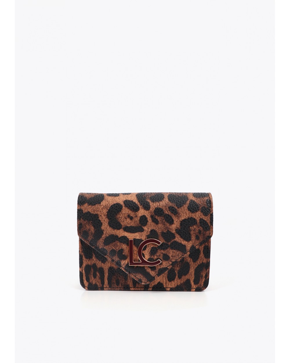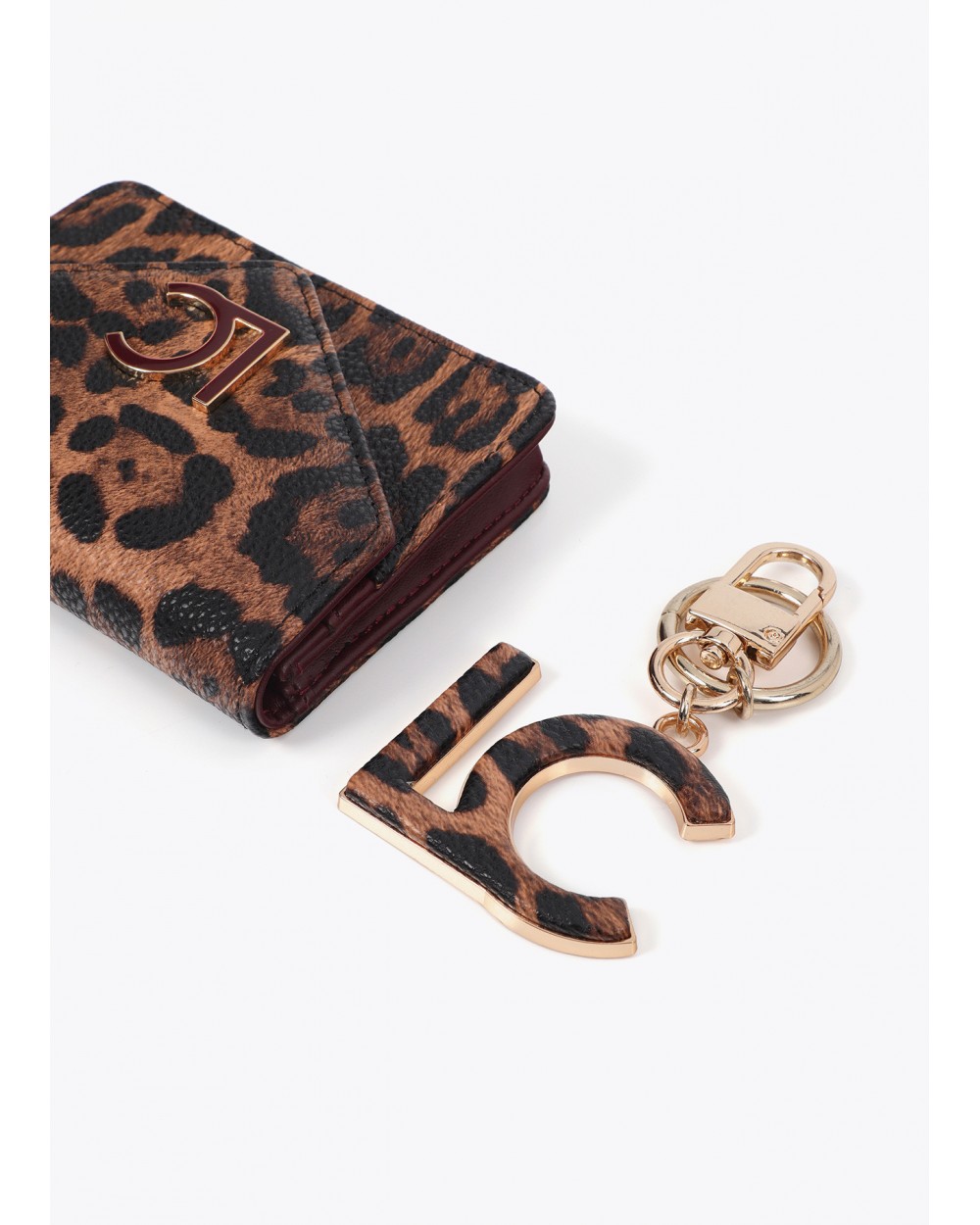 Set de monedero y llavero en estampado animal print marròn. El monedero está forrado y presenta un cierre a presión. Llavero con detalle metálico dorado.