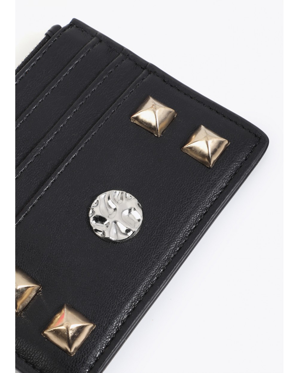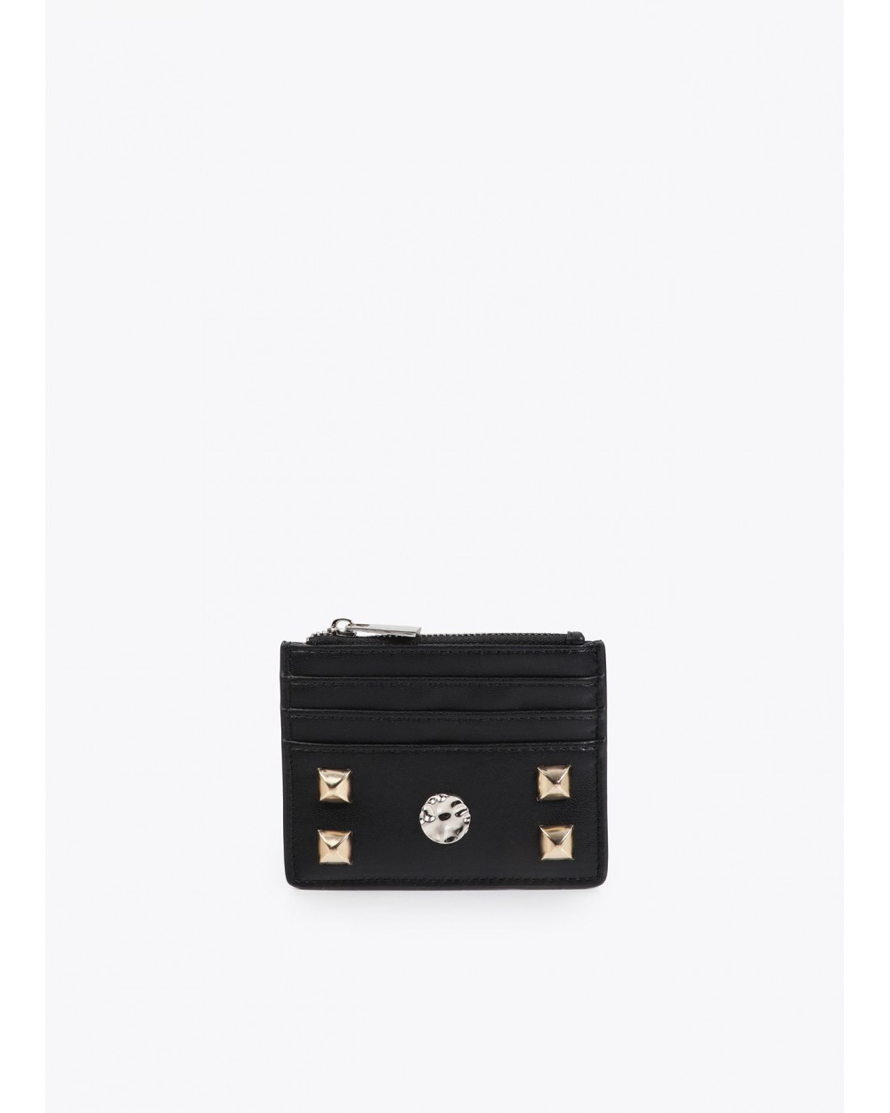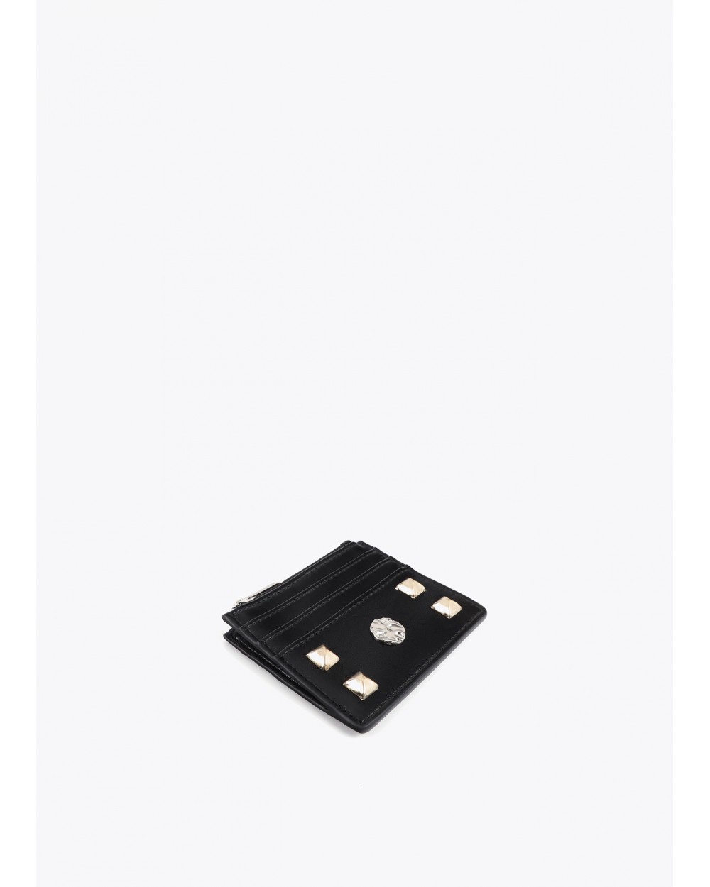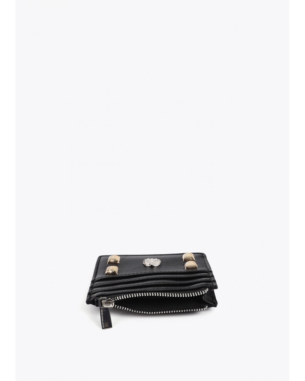 Tarjetero de diseño sofisticado con tachas en oro y brillantes. Cuenta con múltiples ranuras para tarjetas y un pequeño compartimento con cremallera. Fabricado en material de alta calidad con un acabado elegante y moderno. Ideal para mantener tus tarjetas organizadas con estilo.