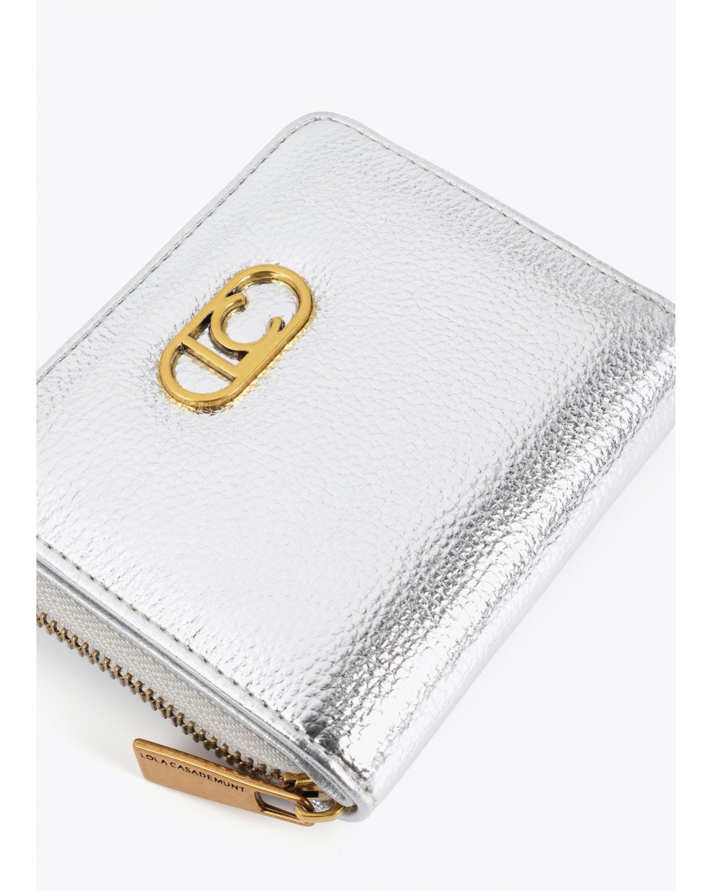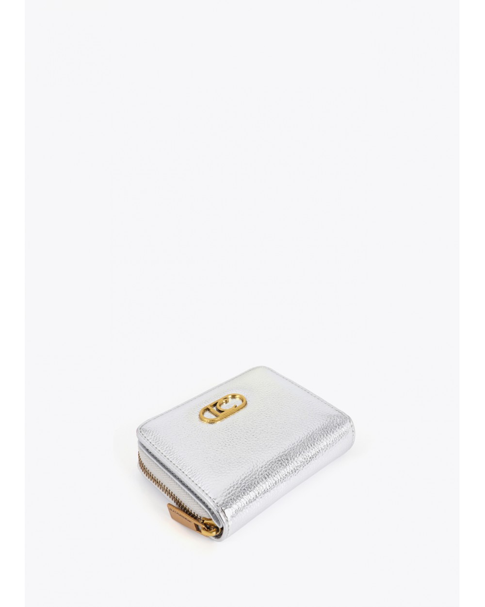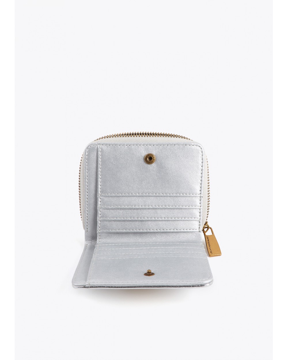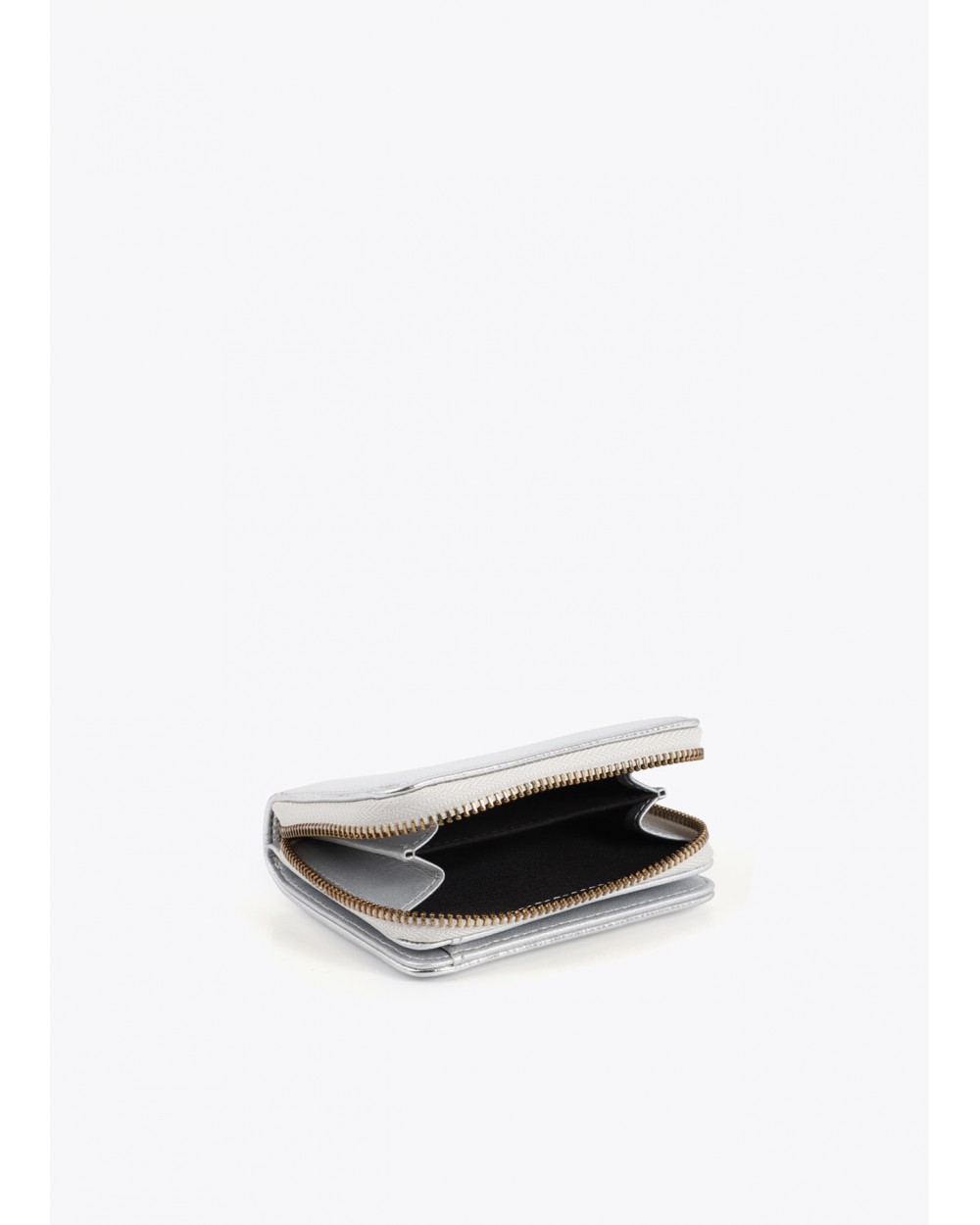 Monedero compacto con acabado metalizado en color plata o dorado , incluye cierre de cremallera y detalle de logotipo dorado. Interior organizado con compartimentos para tarjetas y billetes. Ideal para llevar en pequeños bolsos o clutchs.