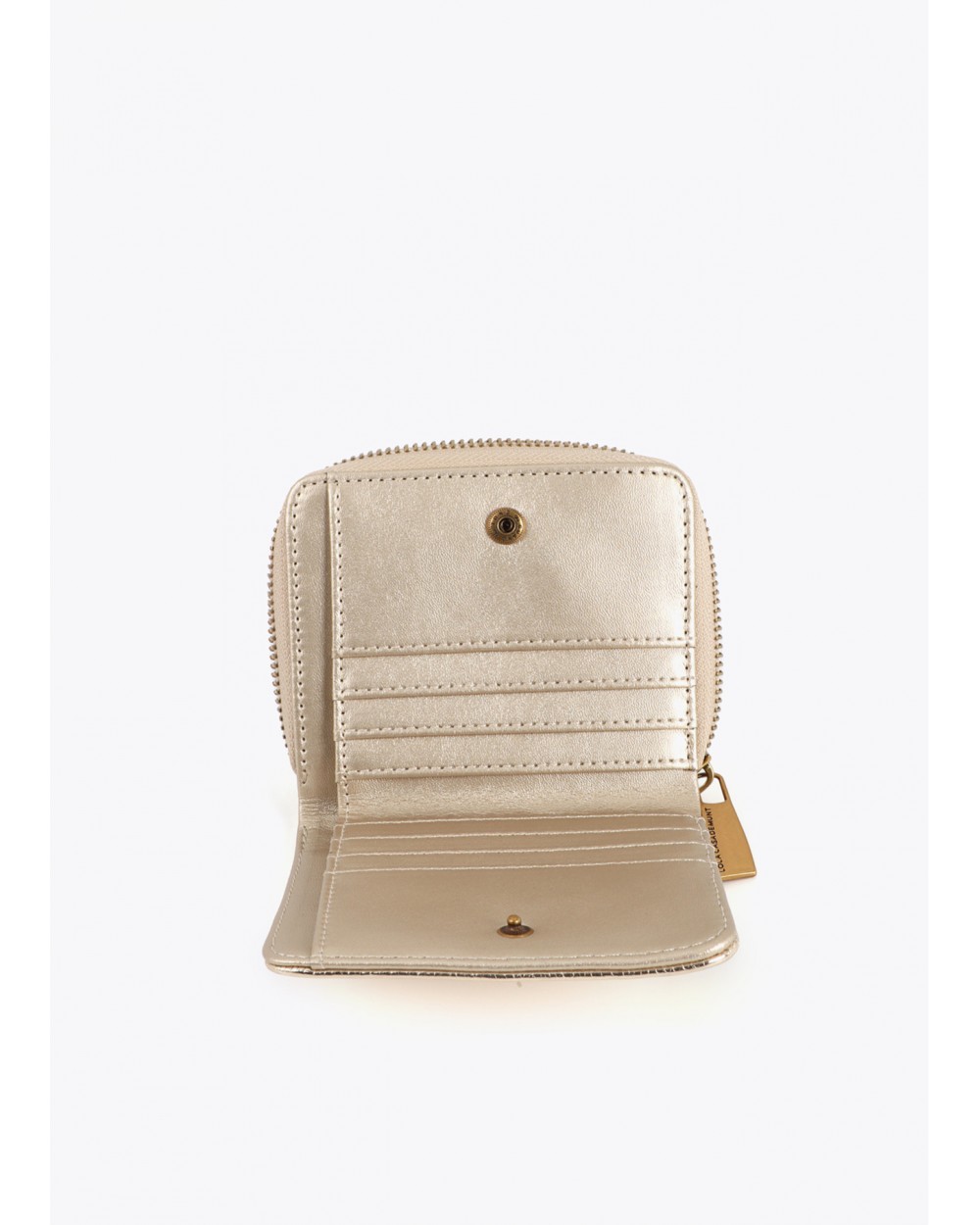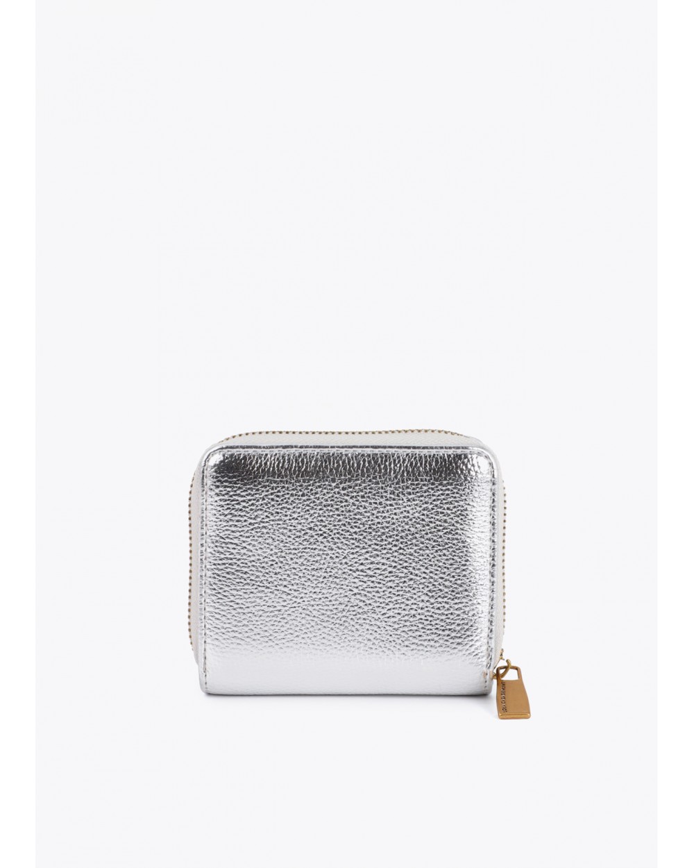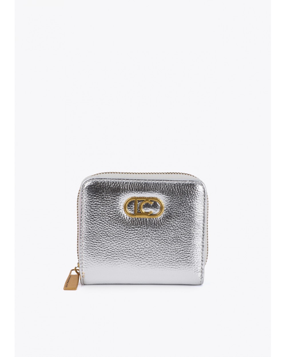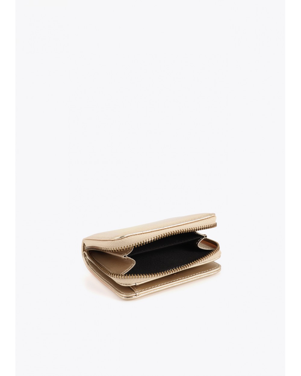 Monedero compacto con acabado metalizado en color plata o dorado , incluye cierre de cremallera y detalle de logotipo dorado. Interior organizado con compartimentos para tarjetas y billetes. Ideal para llevar en pequeños bolsos o clutchs.