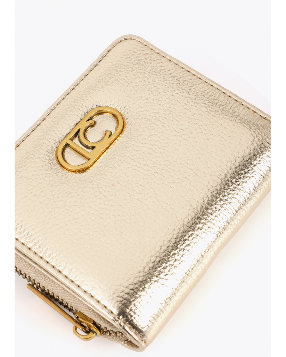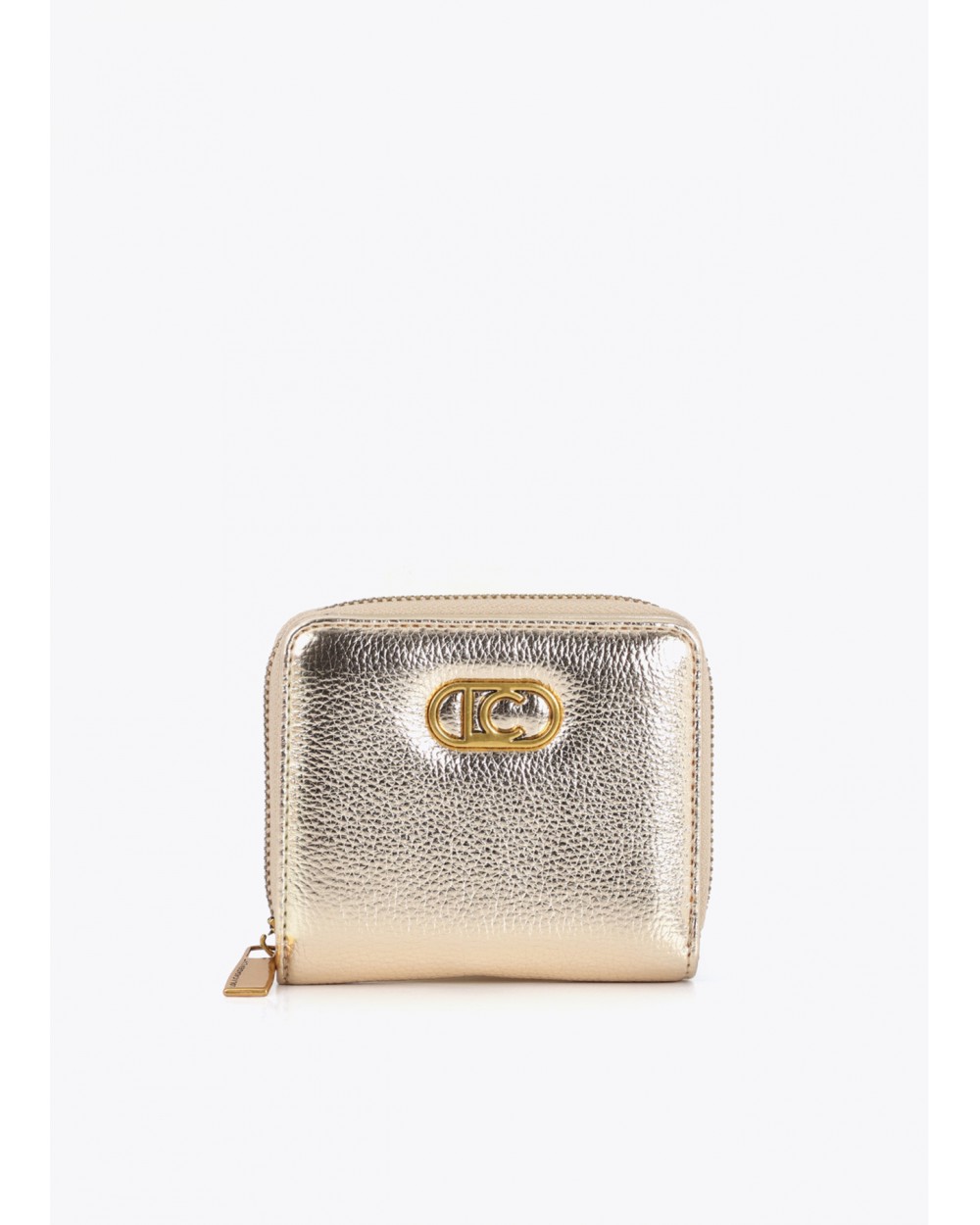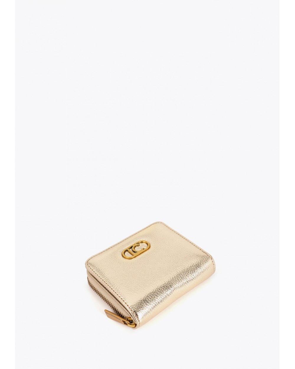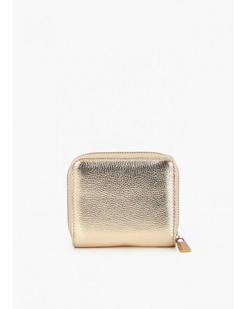 Monedero compacto con acabado metalizado en color plata o dorado , incluye cierre de cremallera y detalle de logotipo dorado. Interior organizado con compartimentos para tarjetas y billetes. Ideal para llevar en pequeños bolsos o clutchs.