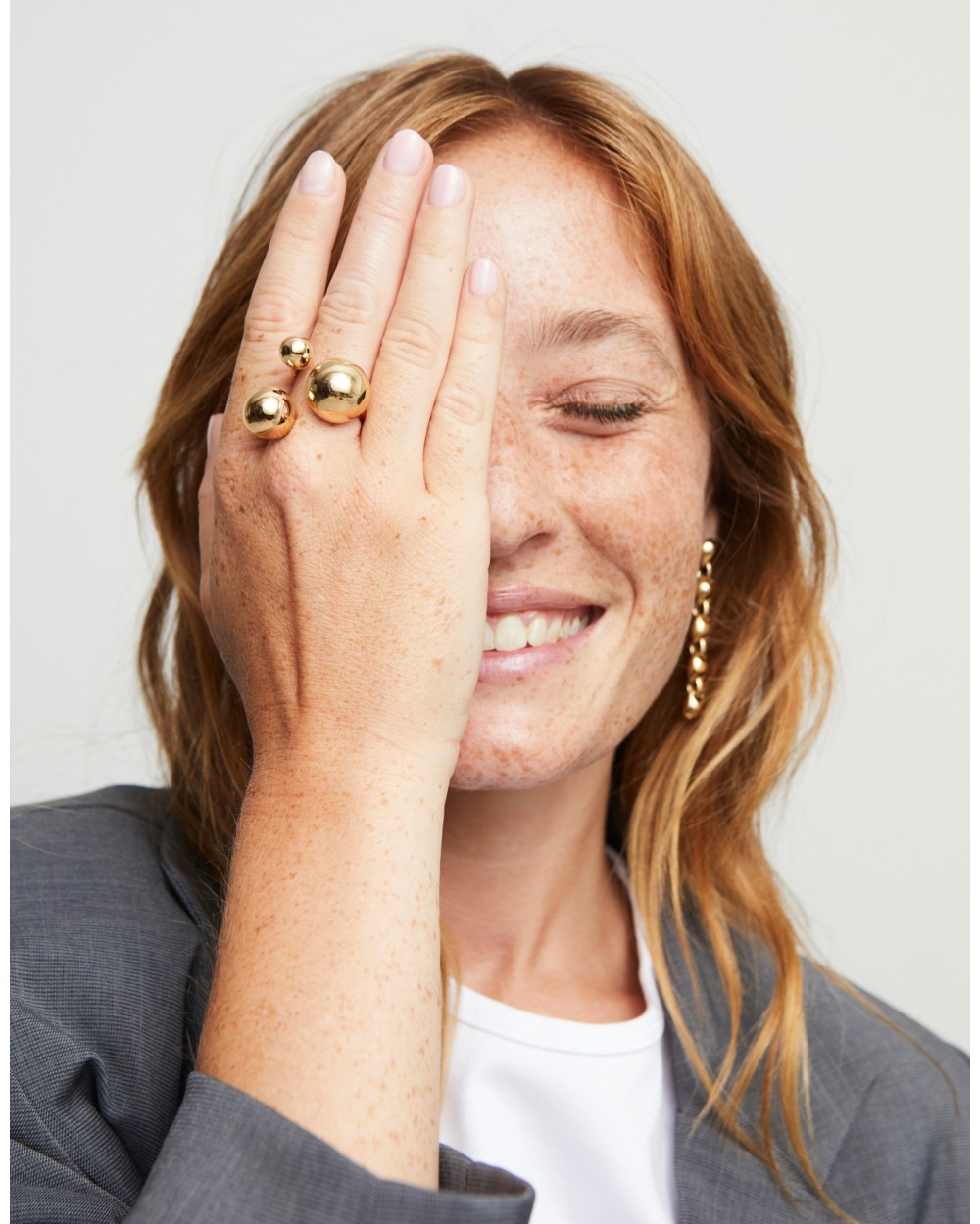 Anillo bañado en oro 18k y tres bolas de diferentes tamaños.Ser intrépida es vivir con valentía y determinación. Pasar un poco de lo que opinen y lo que digan. Perder el miedo a salir de tu zona de confort. Mezclar plata y oro sin miedo. Decir que sí a (casi) todo. Vivir aventuras. Atreverte a reinterpretar los clásicos. Llenarte el cuello y los brazos de burbujas. Aprovechar las oportunidades. No dejar que el fracaso te intimide. El momento de Ser Intrépida es ahora.
