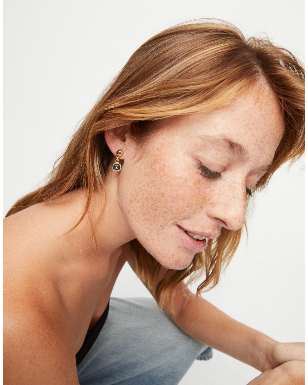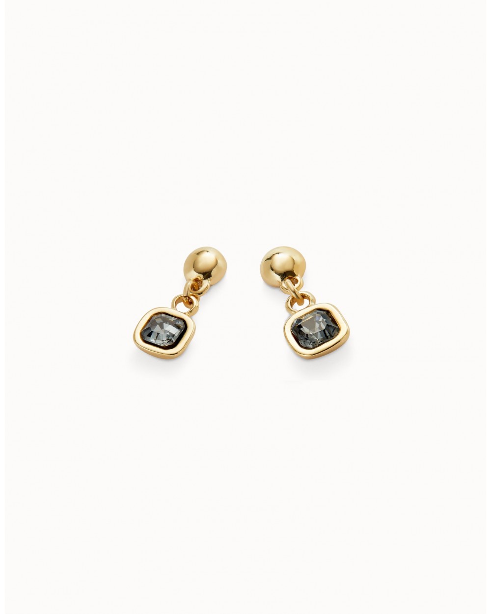Pendientes dorados bañados en oro 18k con cristal facetado colgante gris oscuro. Tamaño pequeño.