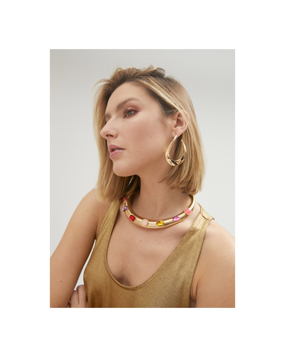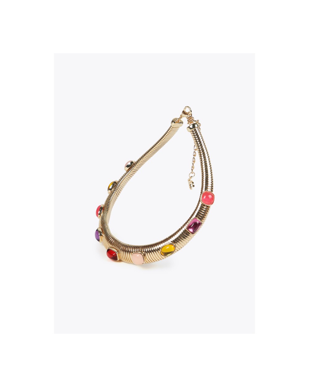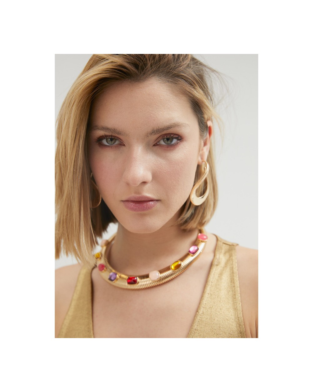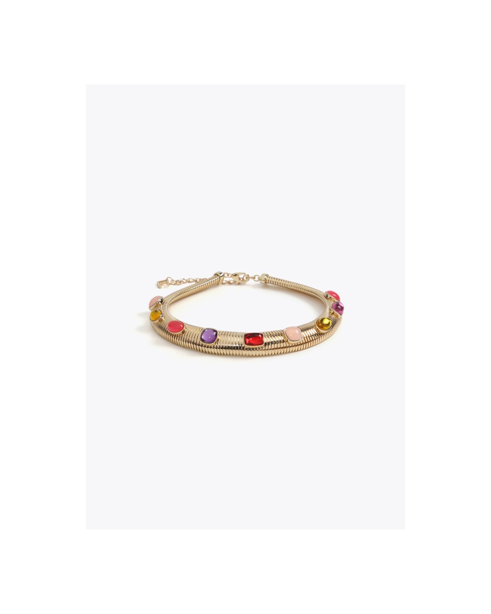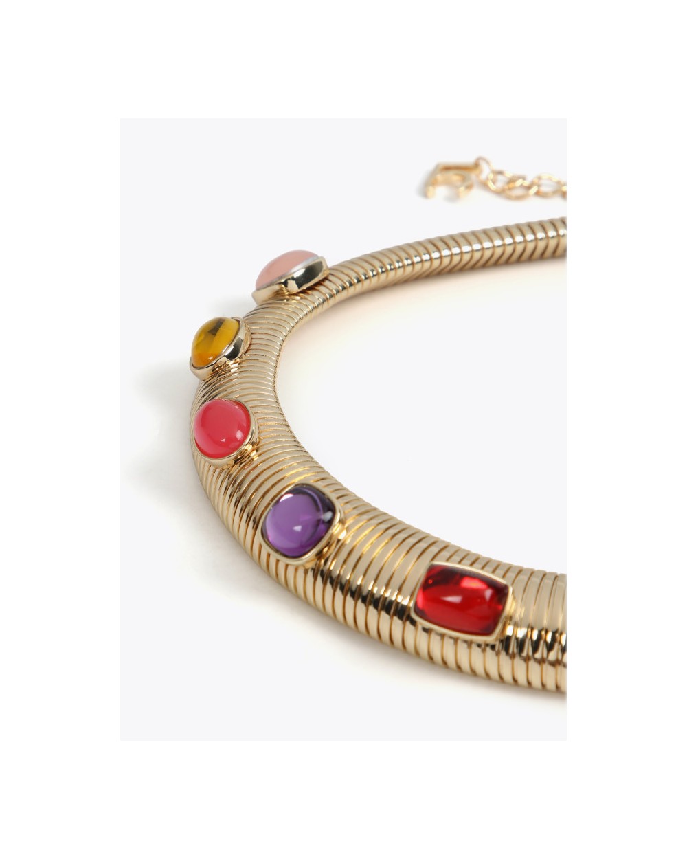 Collar elástico en metal con incrustaciones. Cierre regulable con mosquetón. No contiene níquel.