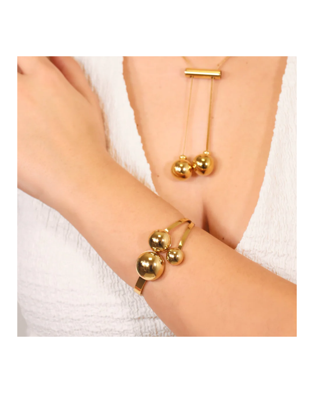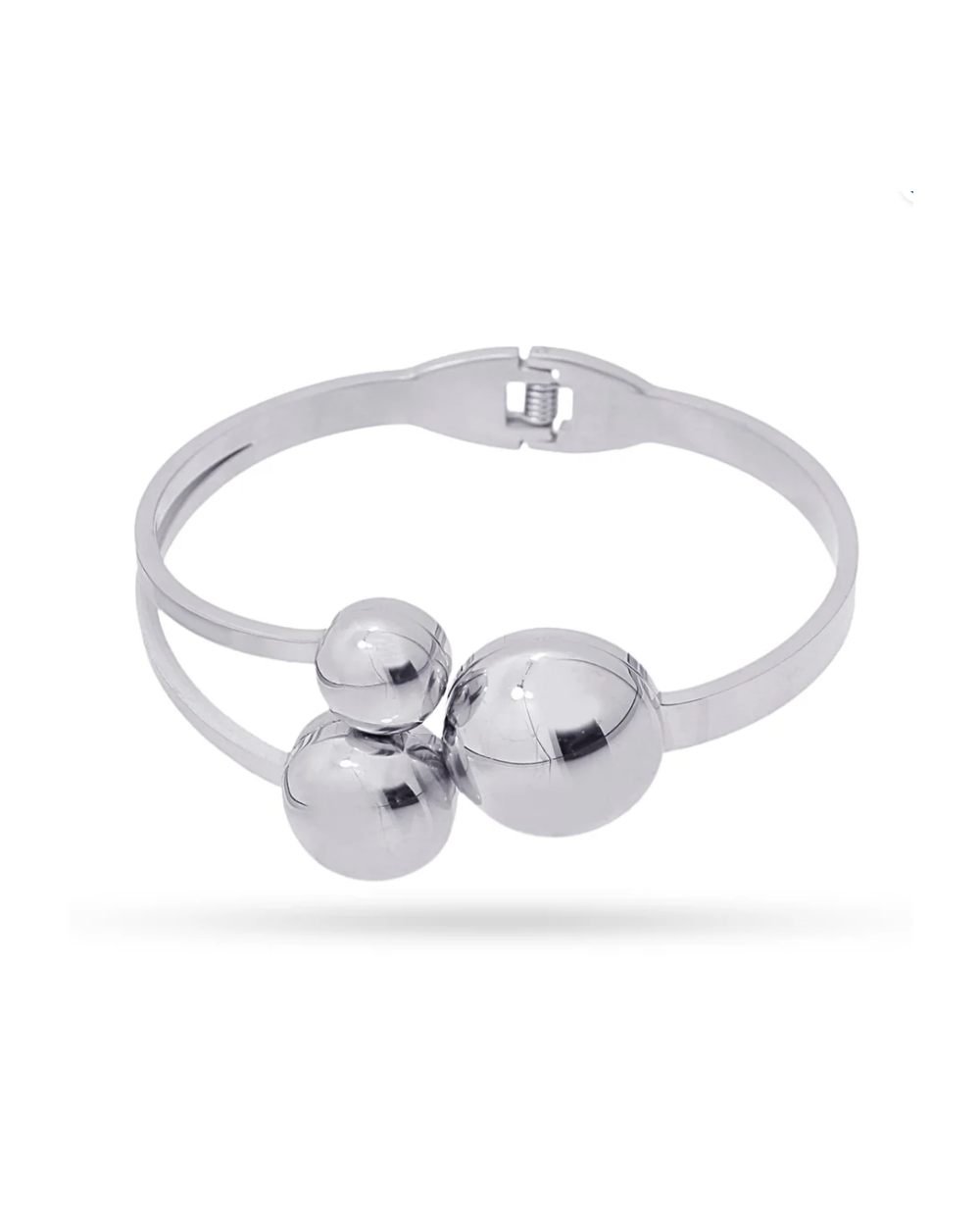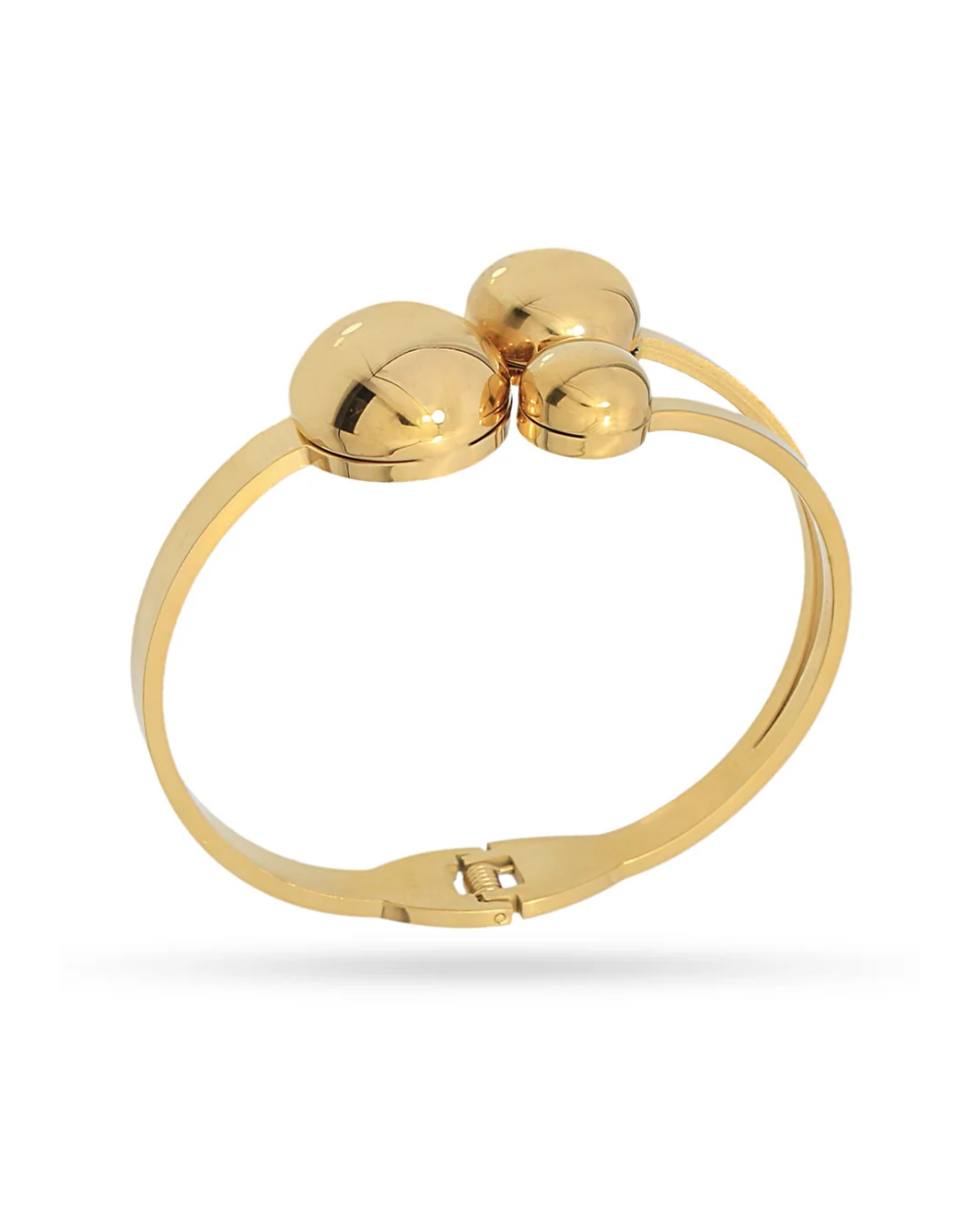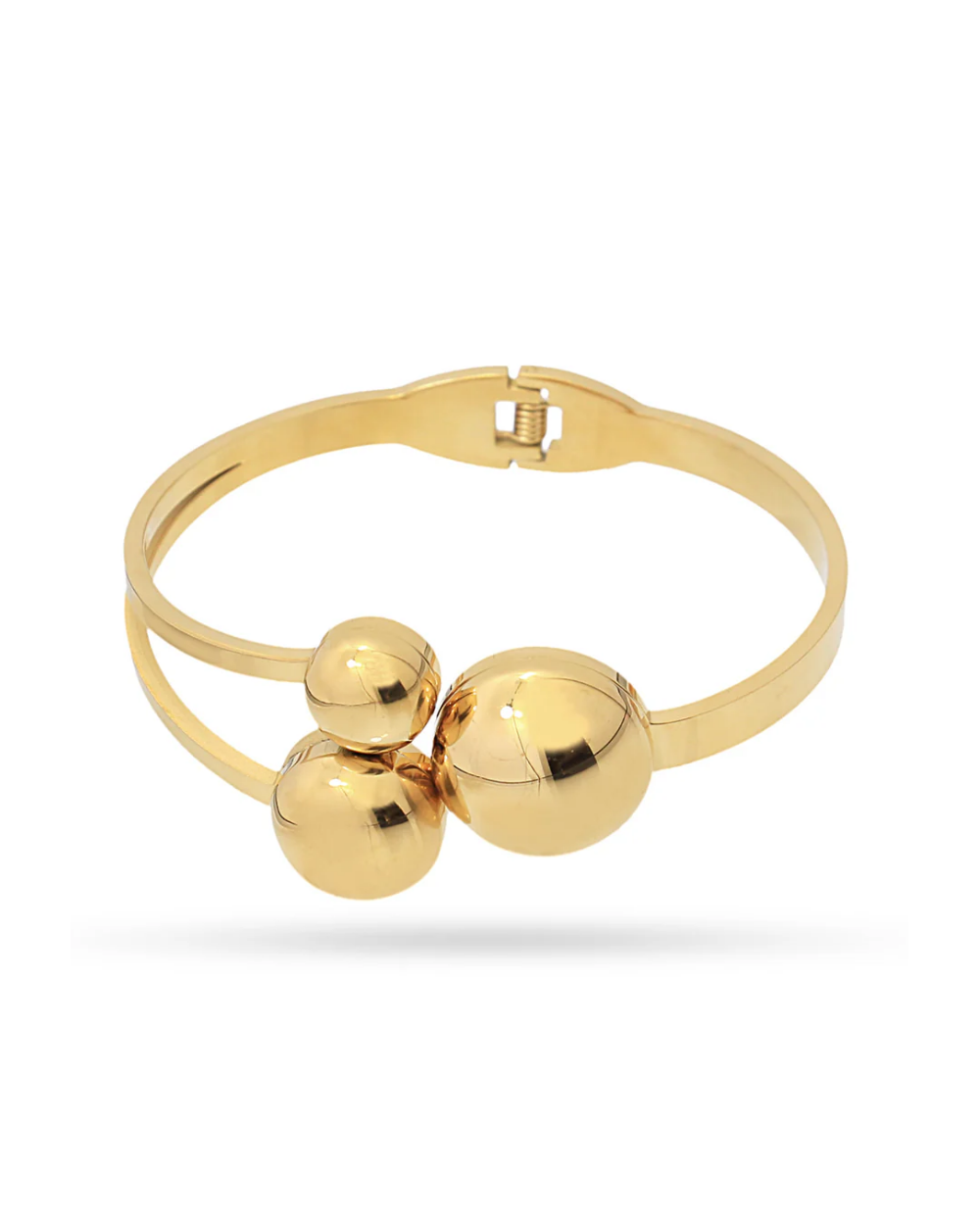 Confeccionada en acero quirúrgico color oro o plata y detallada con semiesferas, este brazalete rígido se abre fácilmente gracias a su sistema de muelle, es hipoalergénica.