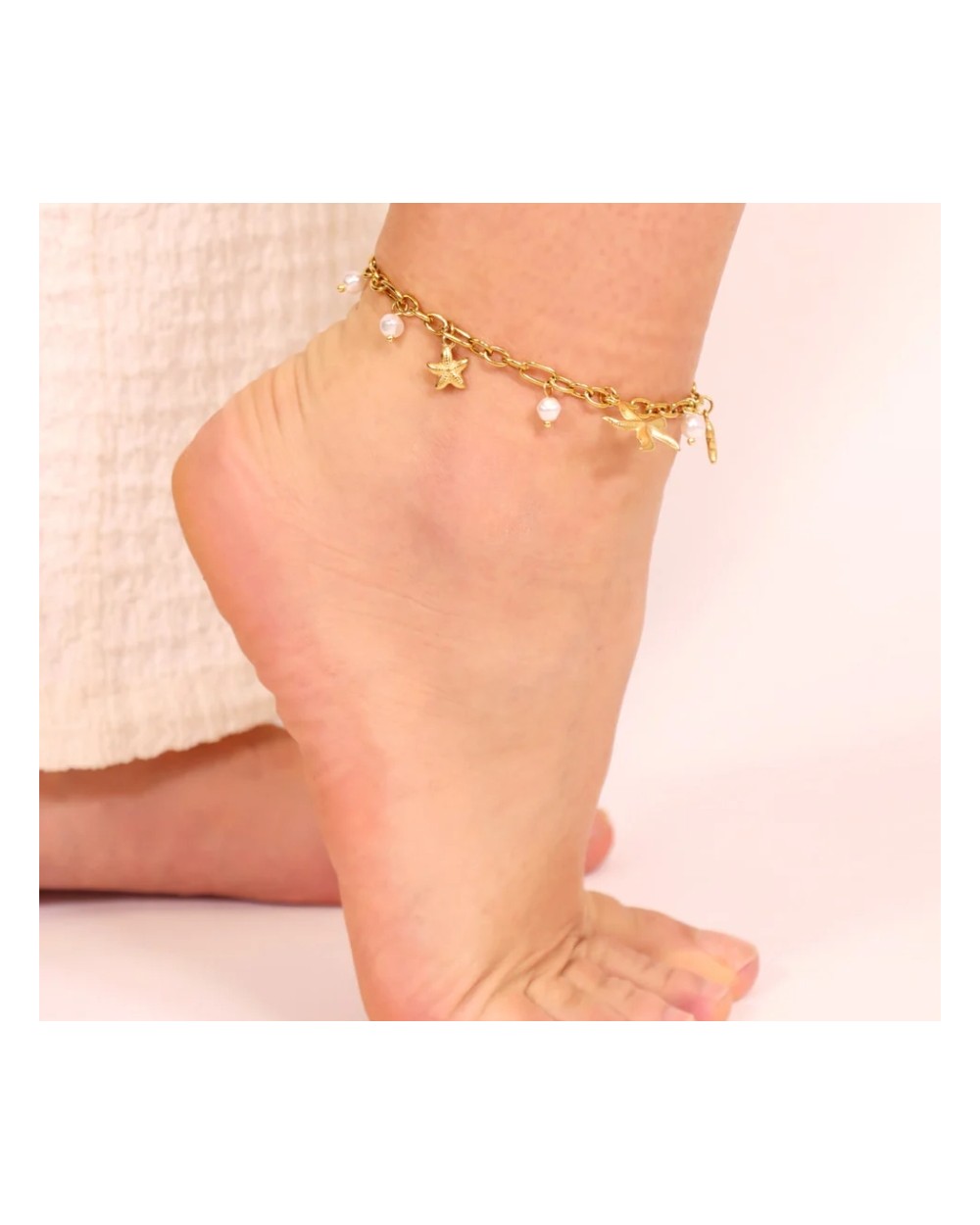 Dale un toque de elegancia y estilo a tus tobillos con la deliciosa Tobillera Sands. Realizada en acero quirúrgico de alta calidad, su diseño de eslabones y abalorios veraniegos como estrellas de mar y perlas la convierten en el accesorio perfecto para lucir en la playa, piscina o con tus sandalias favoritas. Su comodidad y la ausencia de alergias la hacen ideal para ti.