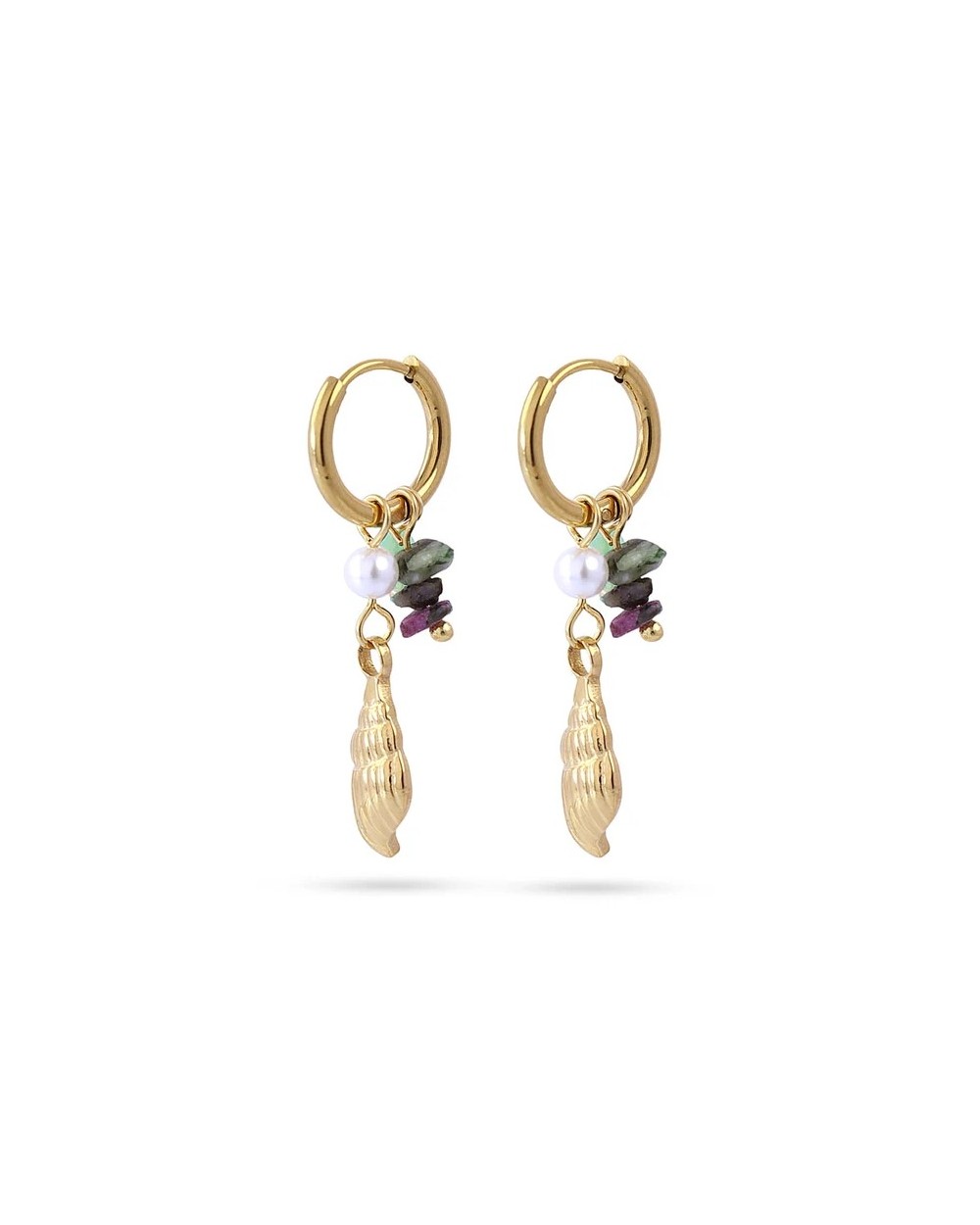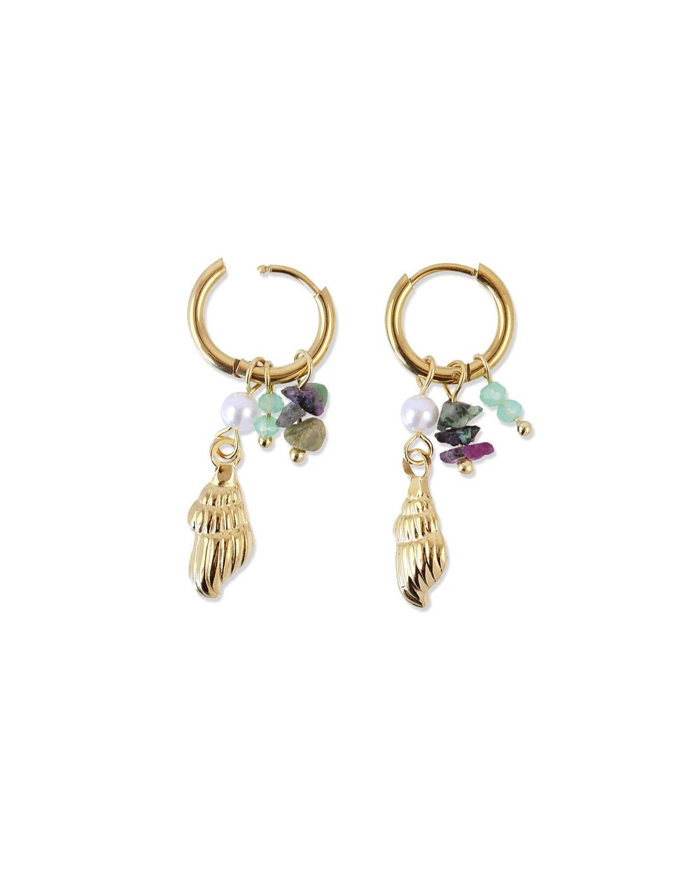 Pendientes mini aros con abalorios colgantes inspirados en las playas y el verano. Hechos de acero quirúrgico, piedra natural, cristal y perlas en tonos perfectos para combinar en verano. Aro cerrado para màs comodidad. Realizado en acero quirùrgico.