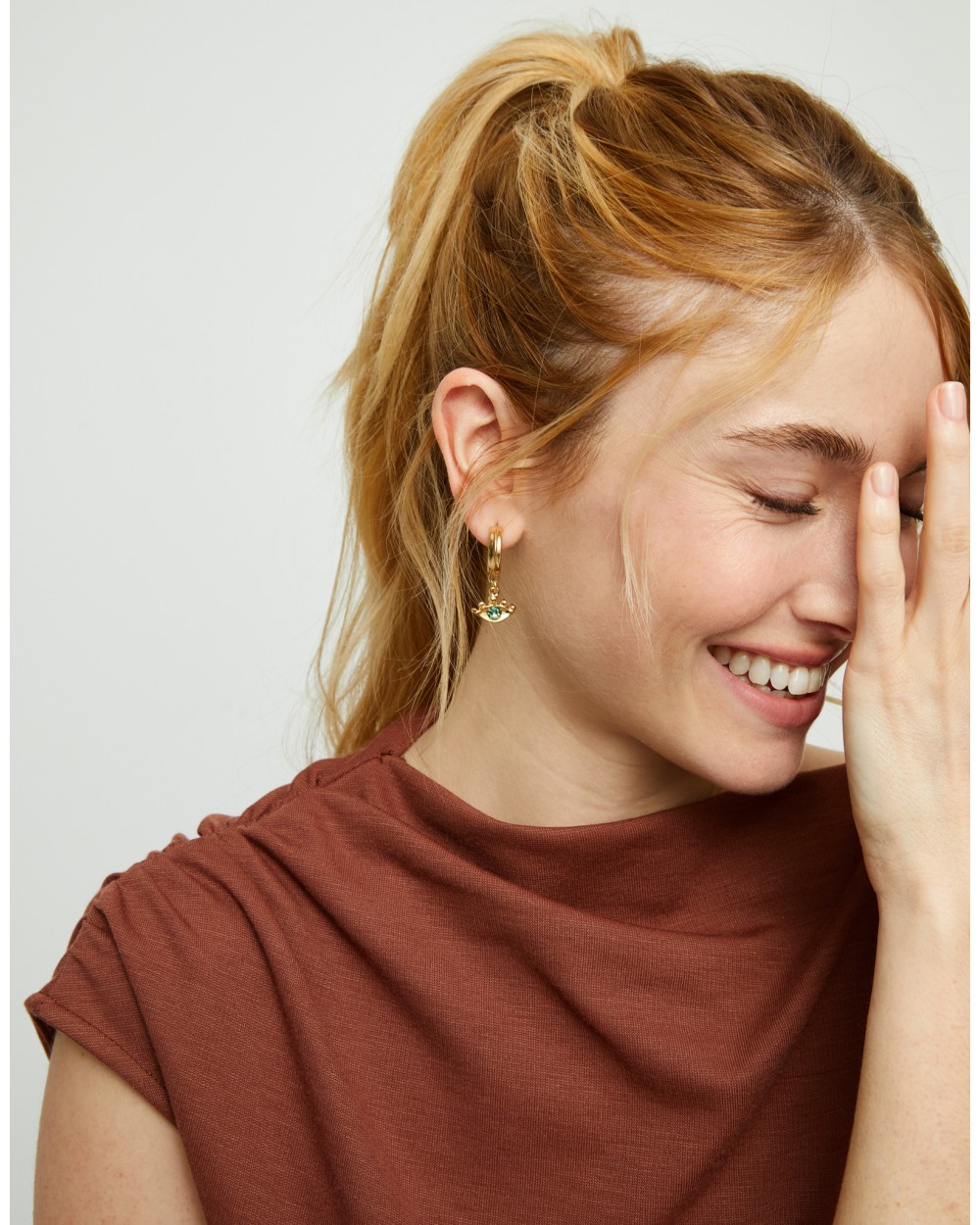 Pendientes con aro y colgante en forma de ojo, bañado en oro de 18K y cristal verde facetado.