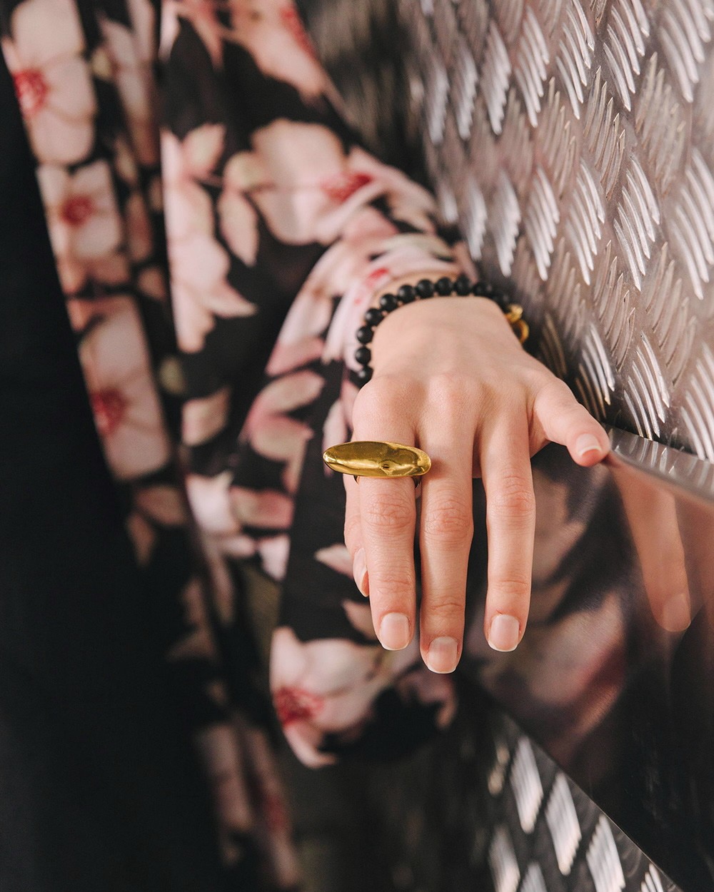 Anillo dorado con forma de barra, ajustable, bañado en oro de 18k y la ùltima capa de 24k.