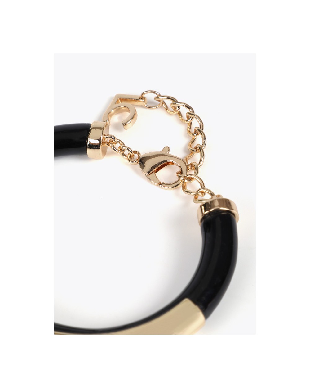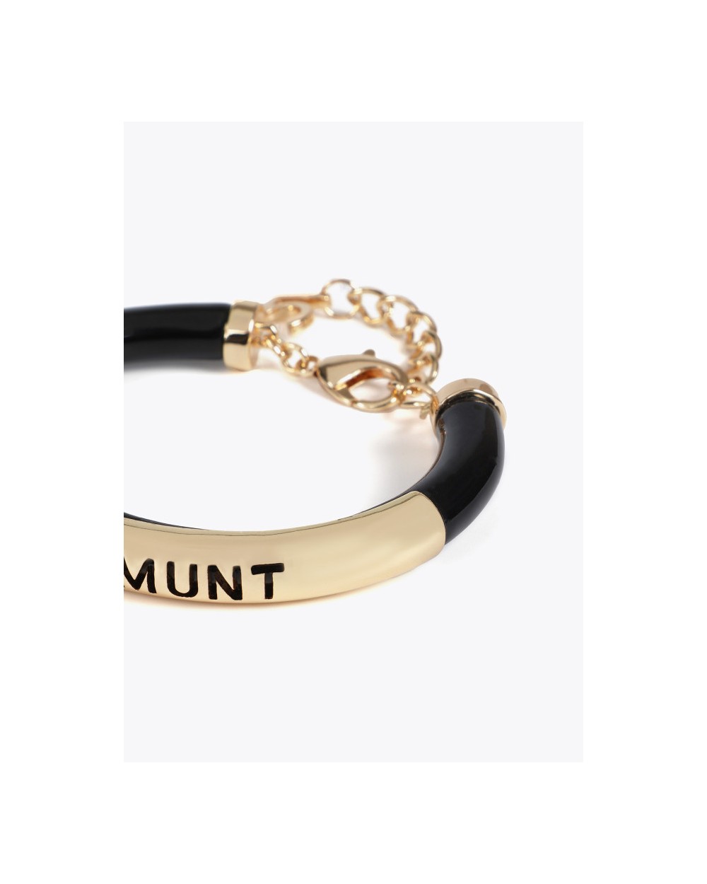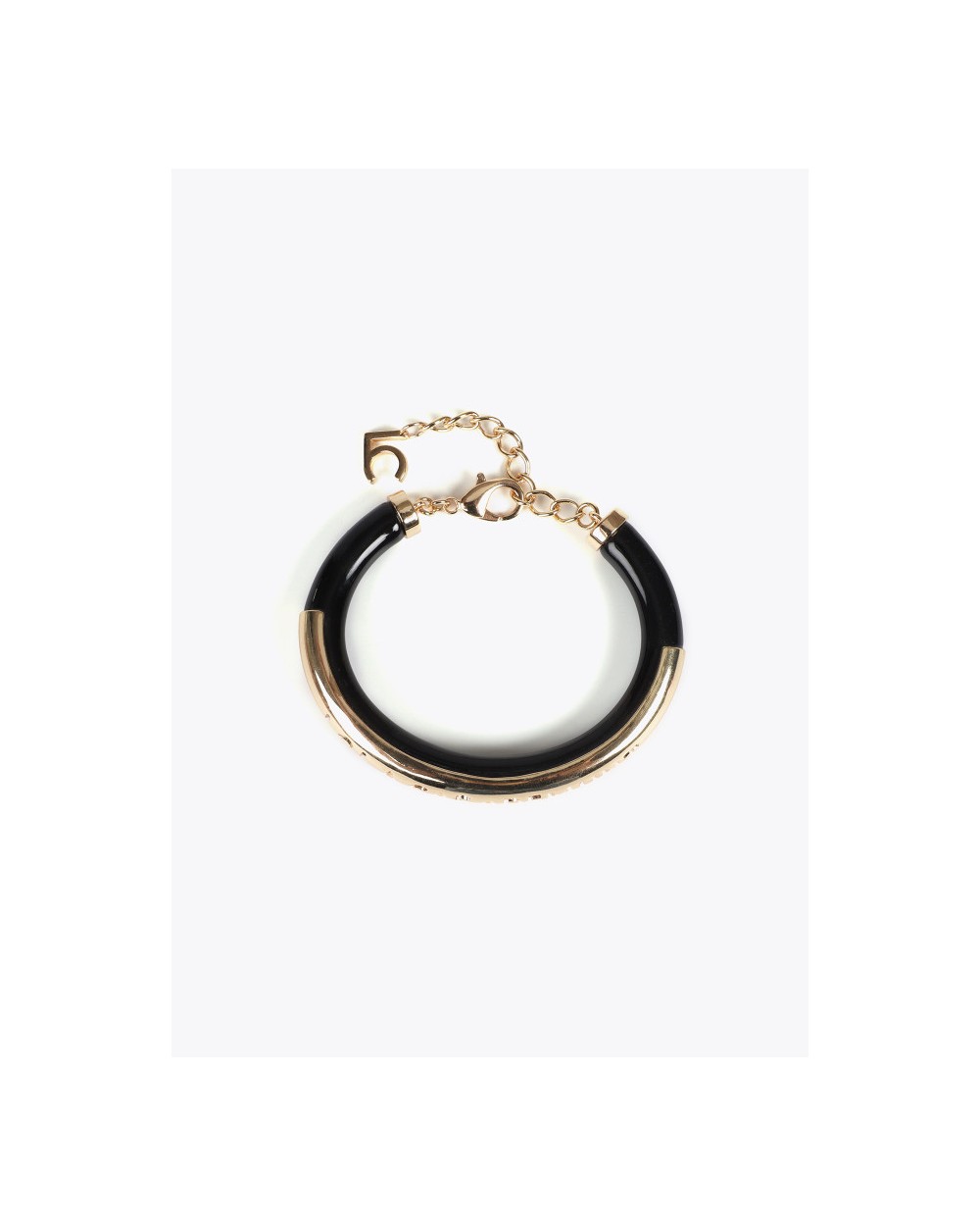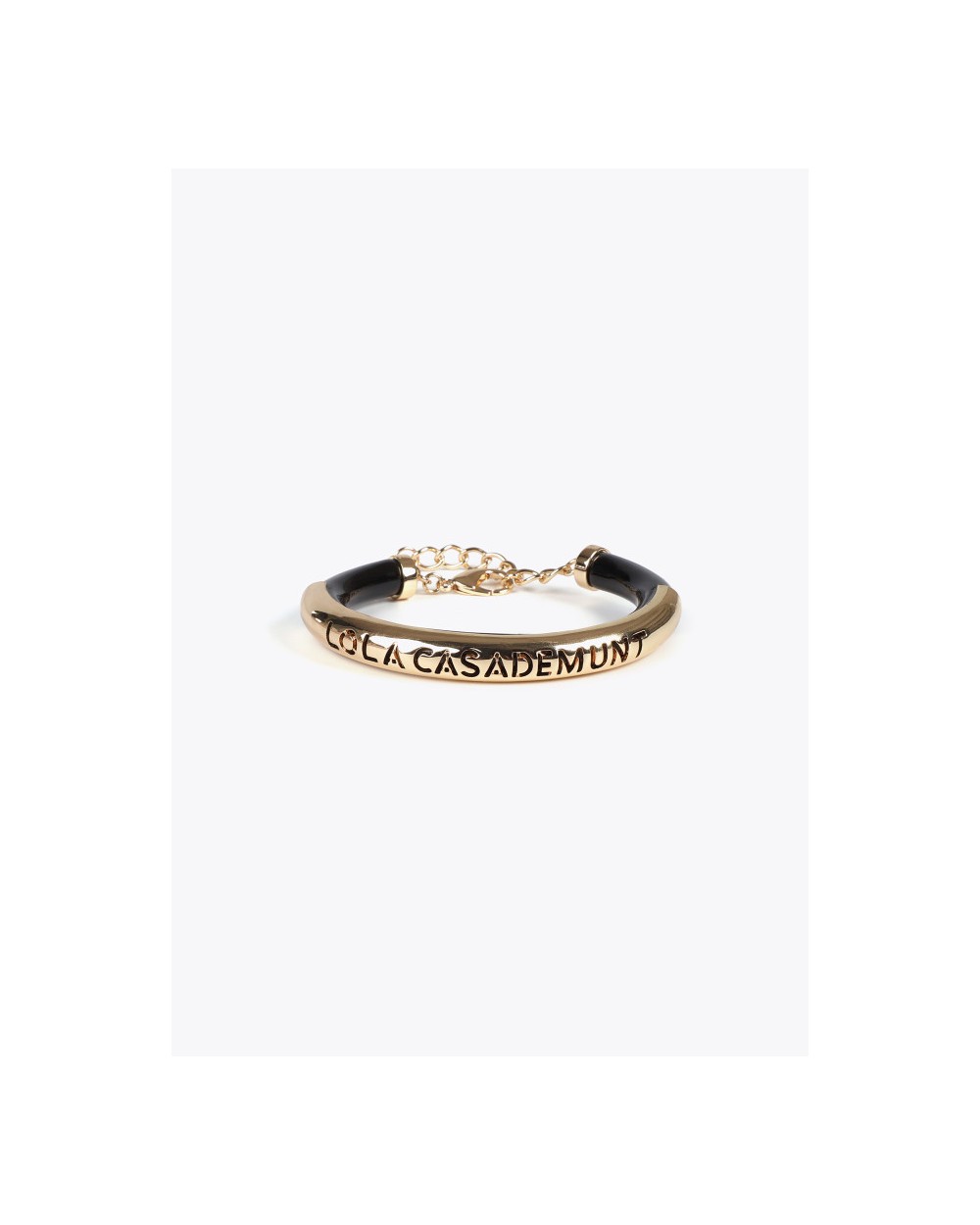 Pulsera en metal dorado con detalles en negro, logo troquelado lola casademunt y cierre ajustable.