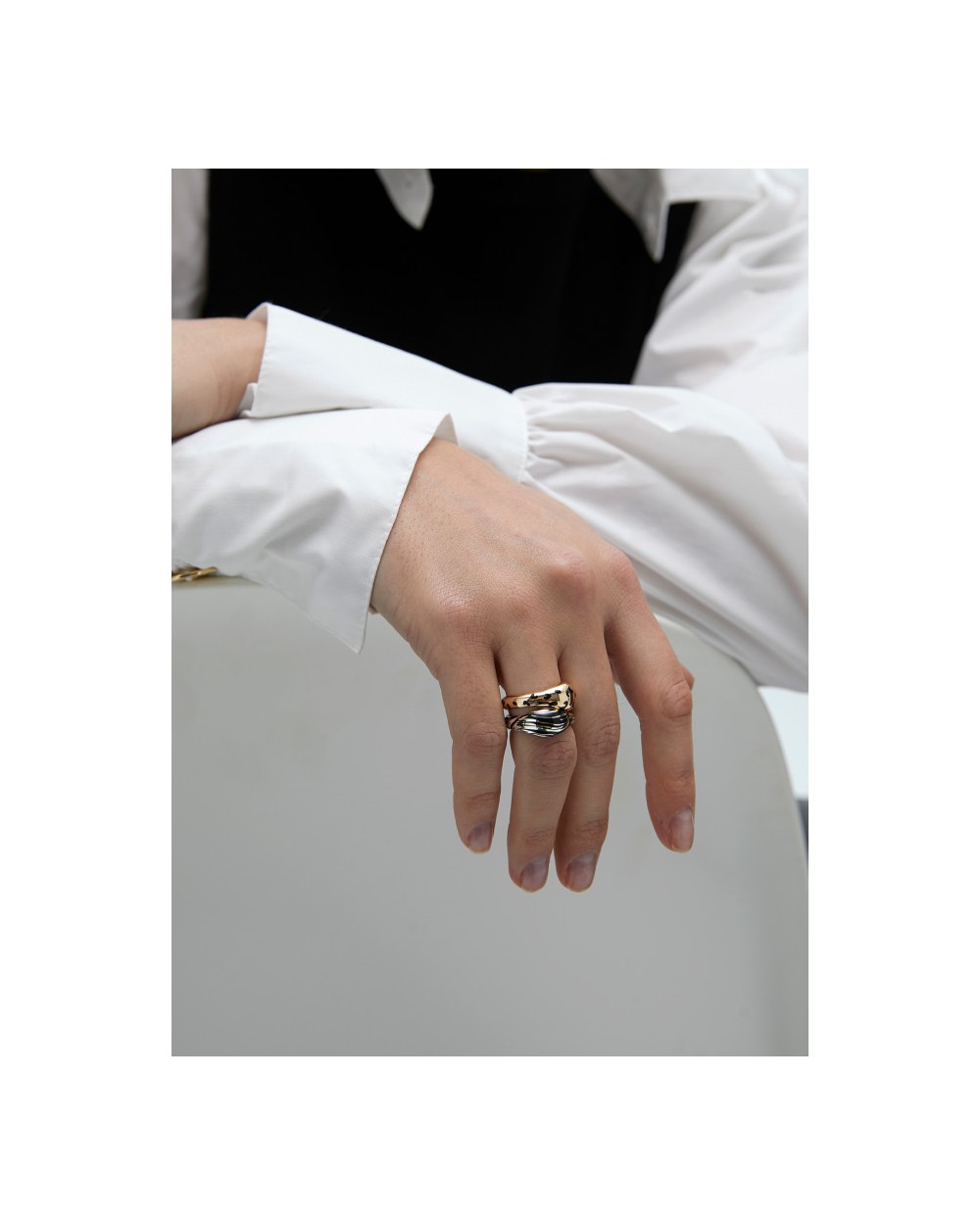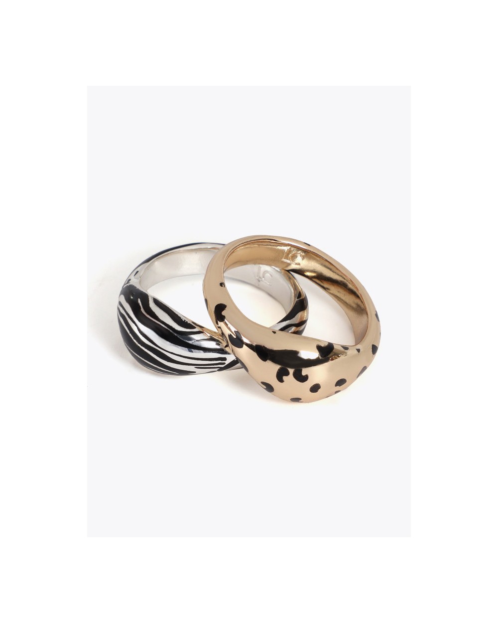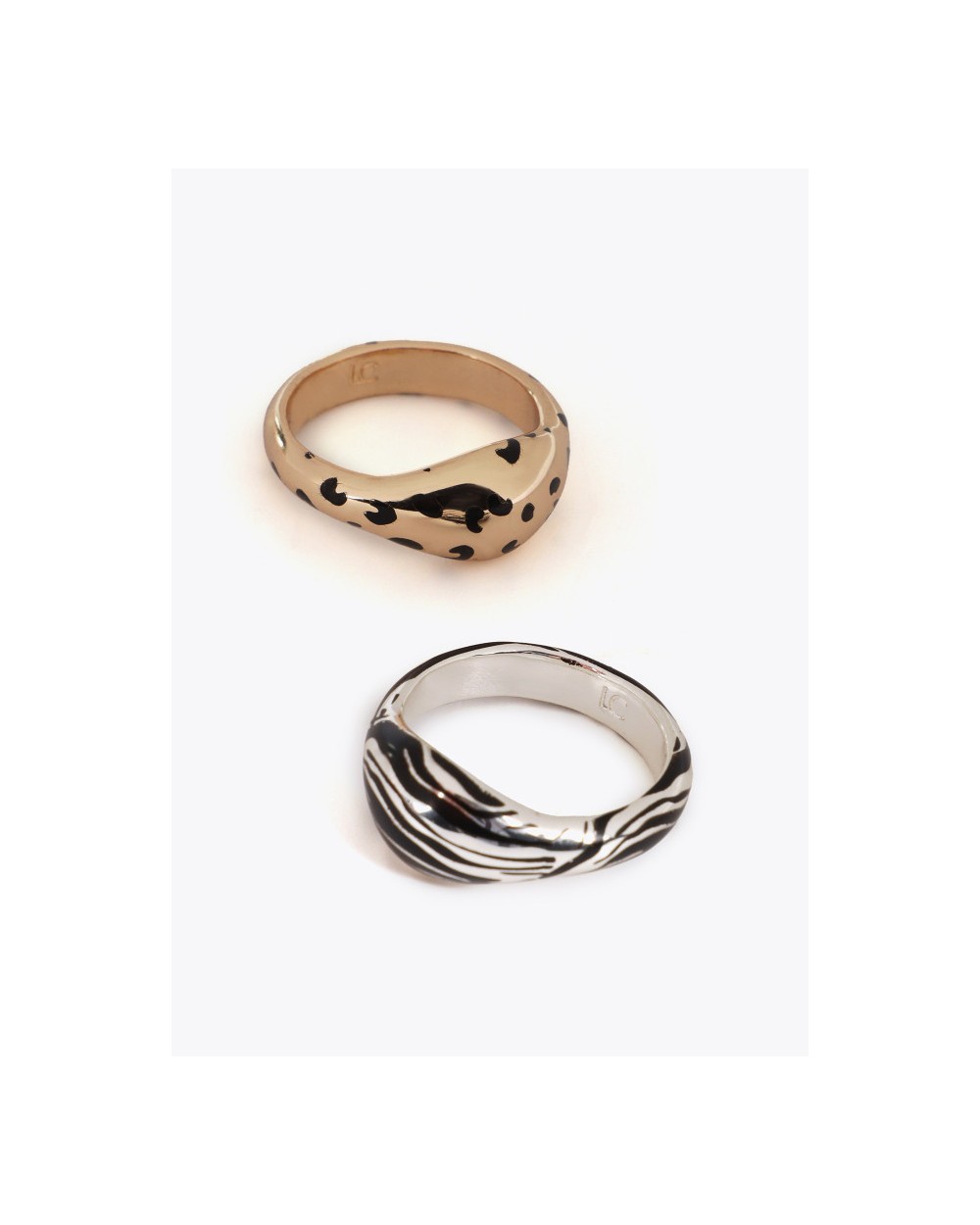 Par de anillos bicolor en estampado animal, dorado y plateado con manchas negras. Uno dorado con print de leopardo y otro plateado con print de cebra. Fabricados con materiales resistentes y ligeros.