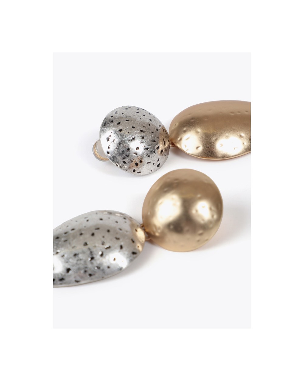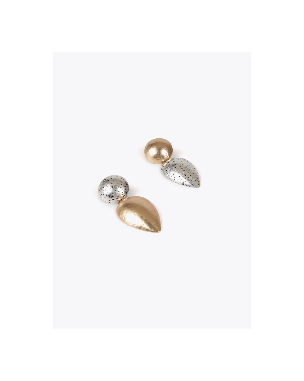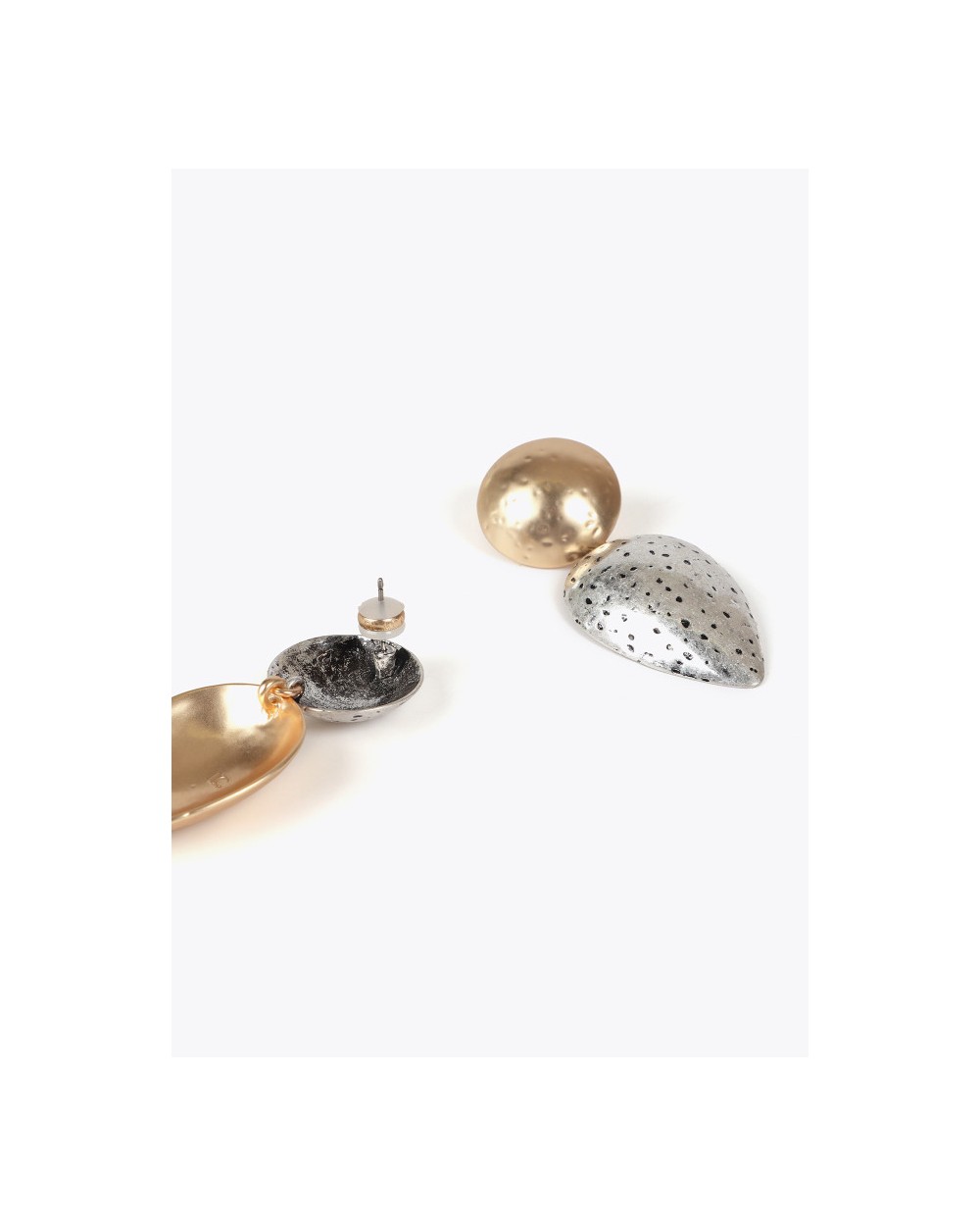 Pendientes con forma de làgrima en tonos dorado y plateado, textura martillada y cierre de presiòn con tuerca.