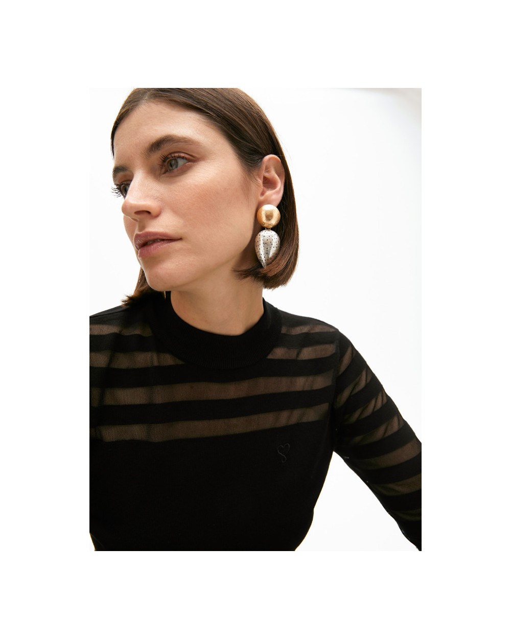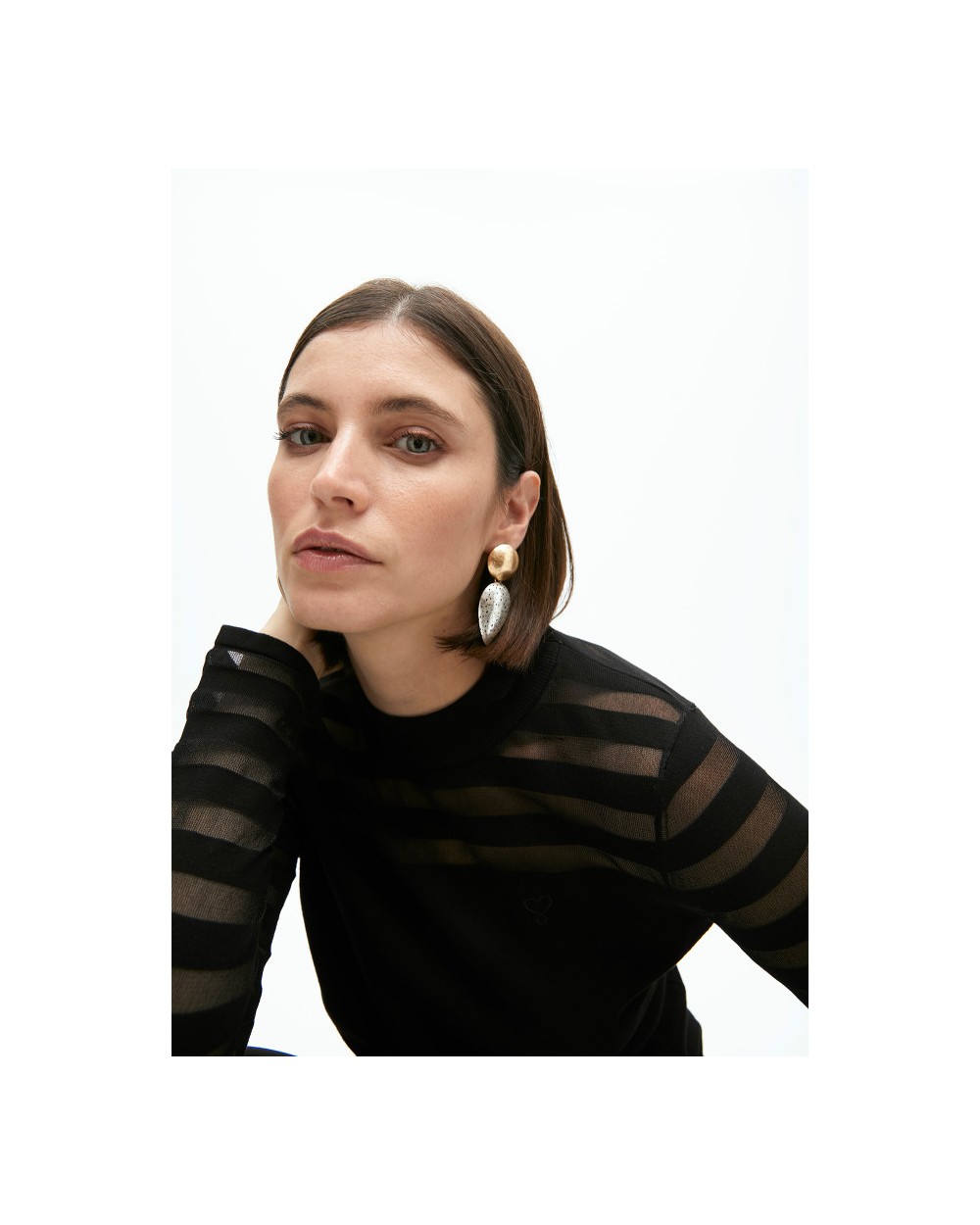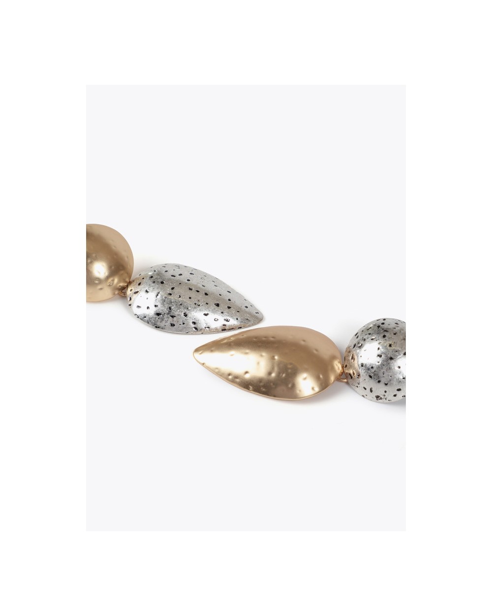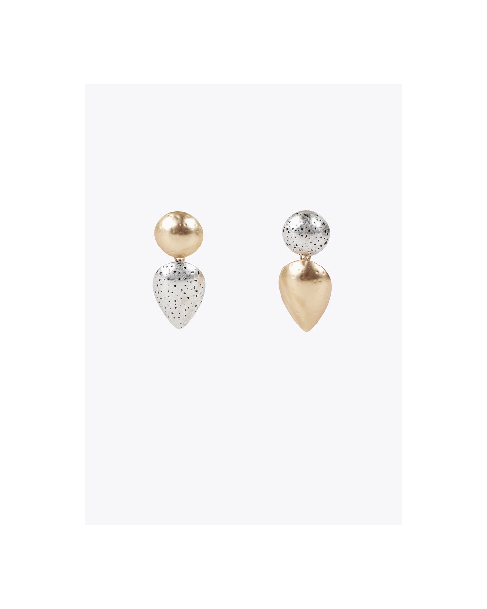 Pendientes con forma de làgrima en tonos dorado y plateado, textura martillada y cierre de presiòn con tuerca.