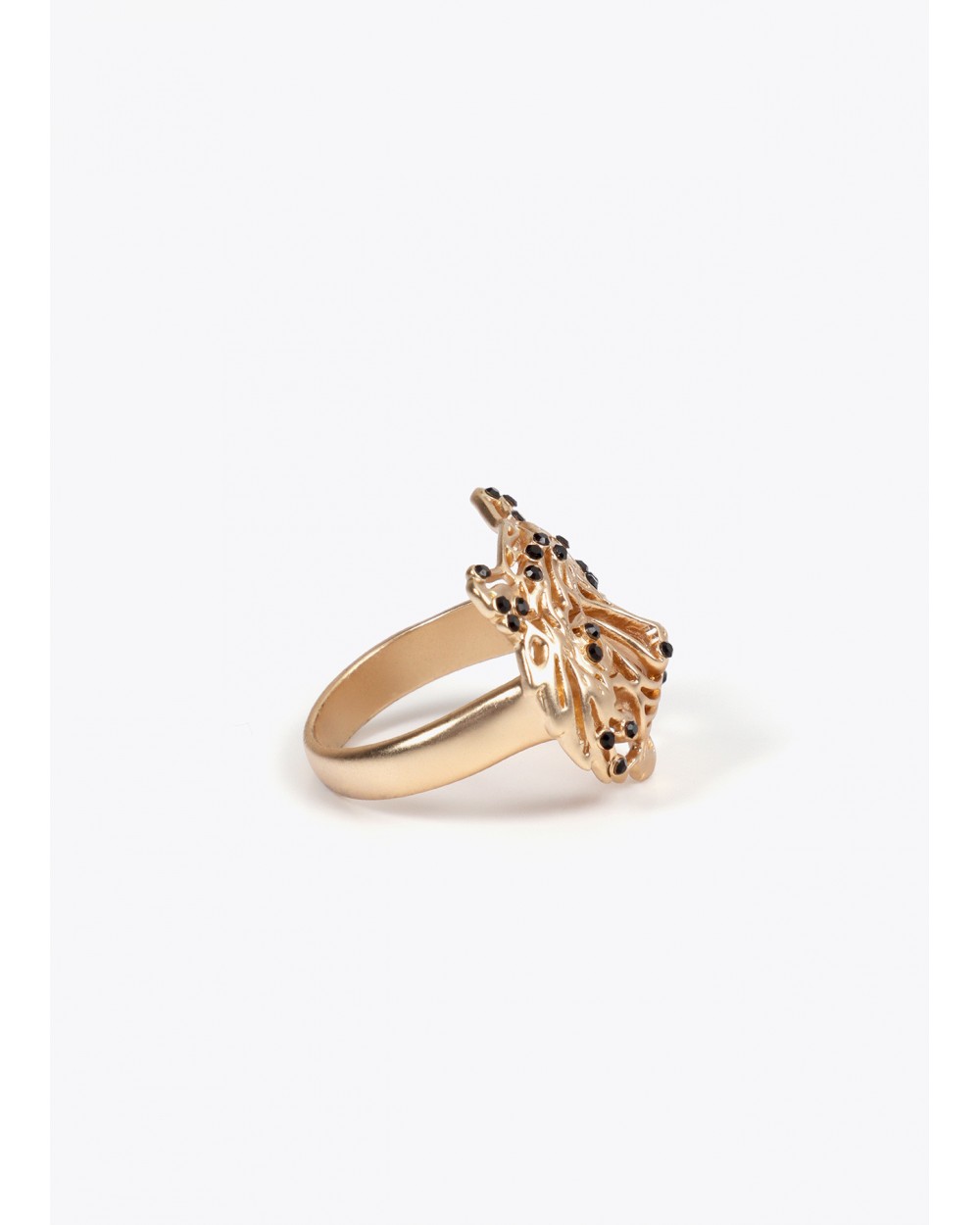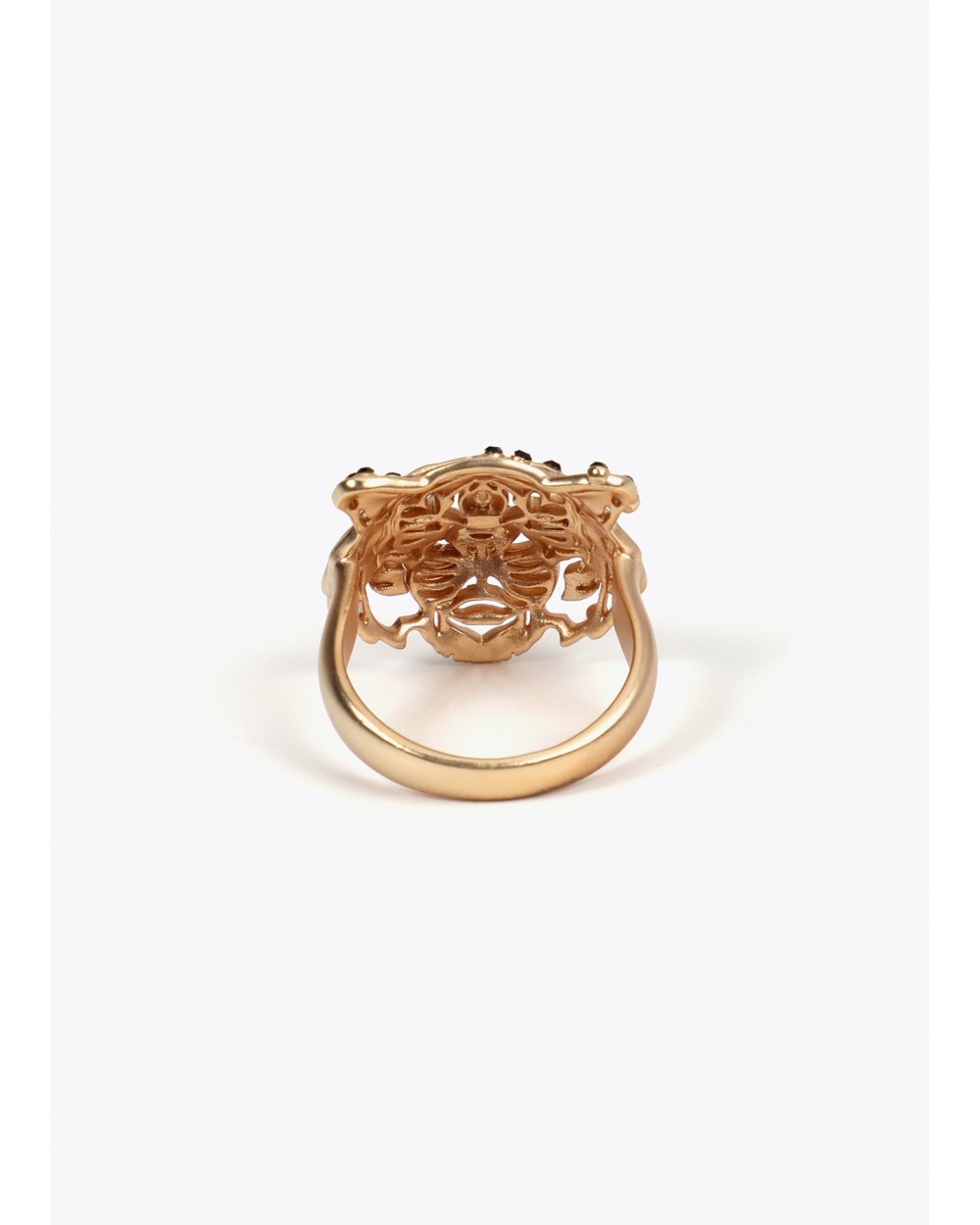 Anillo cabeza de tigre en dorado y adornado con cristales negros.