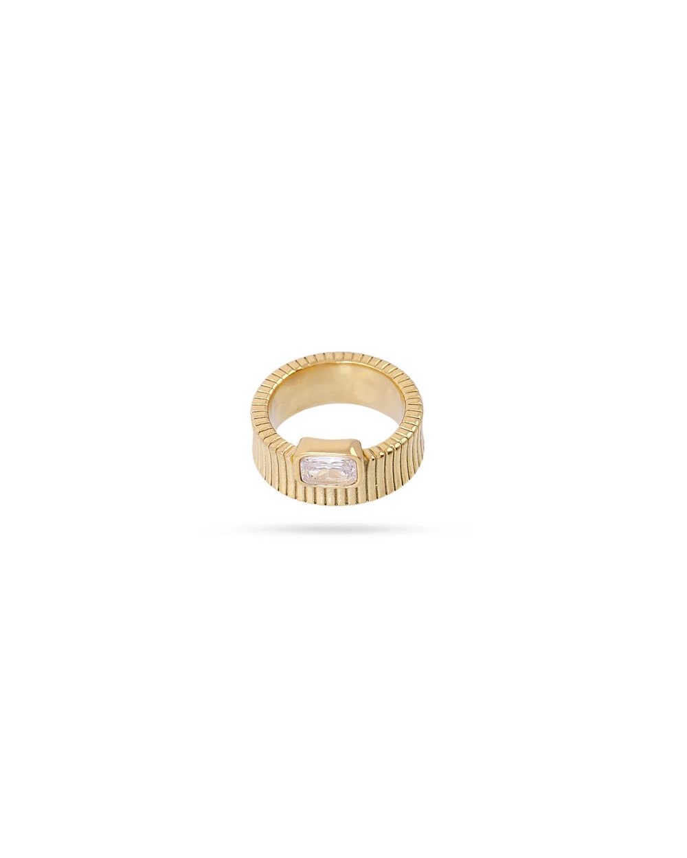 Anillo Essentials Orli de acero quirúrgico con diseño estriado brillante detalle de circonita blanca, siendo hipoalergénico y apto para mojar.