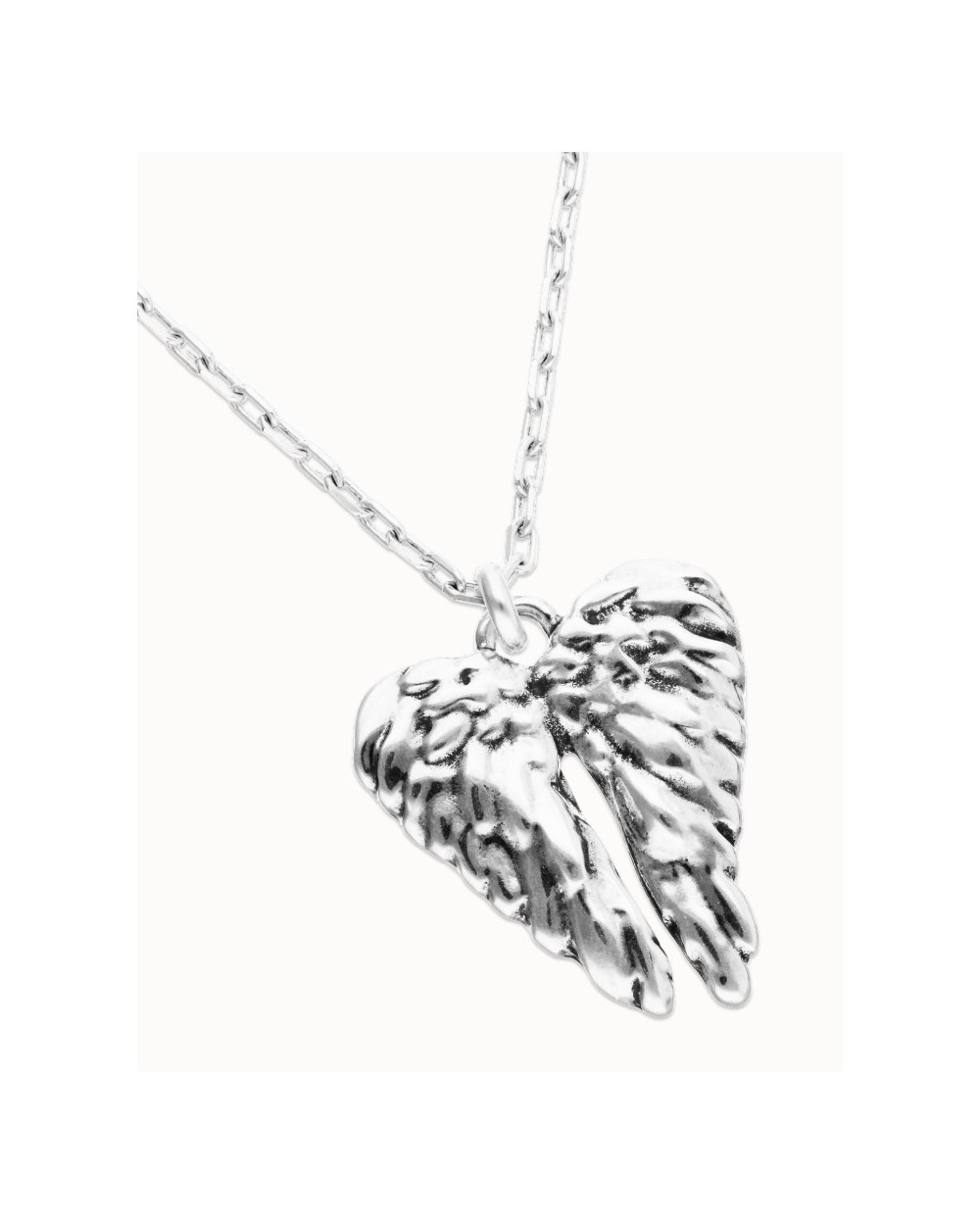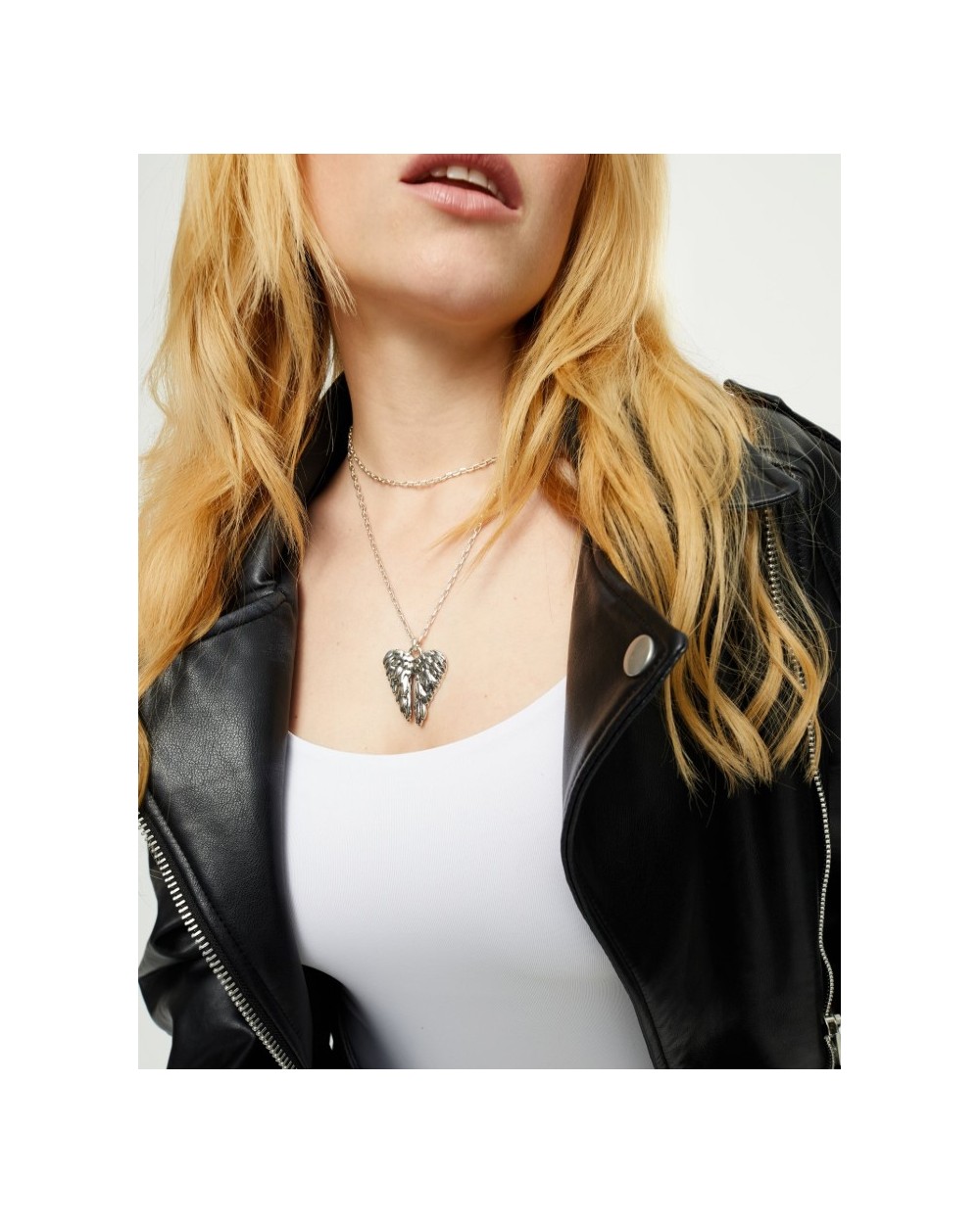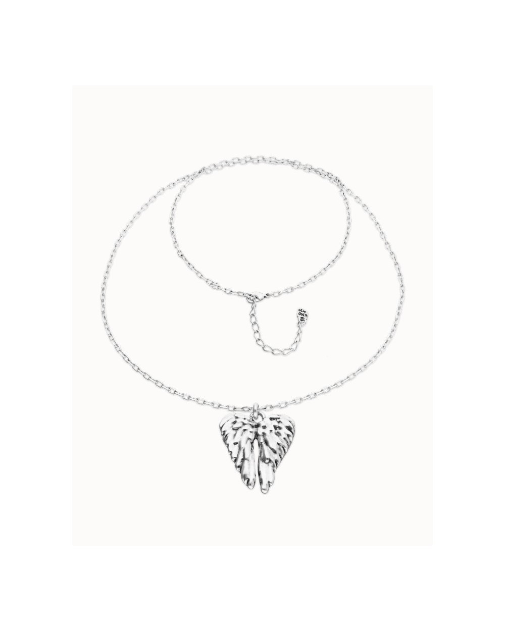 Collar con un diseño de cadena larga y colgante en forma de alas, acabado en plata de ley.
