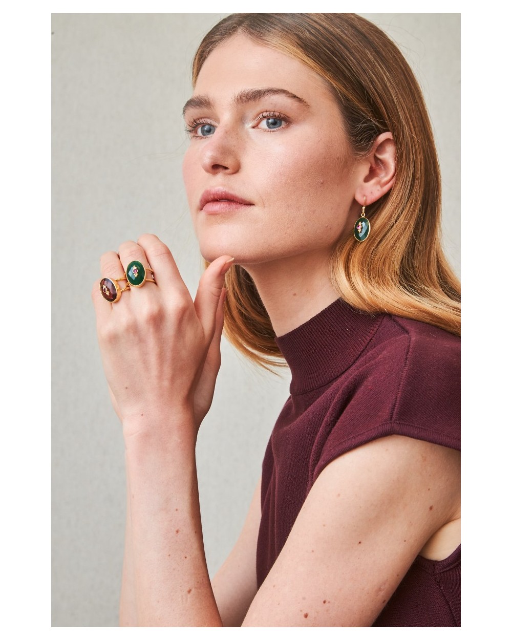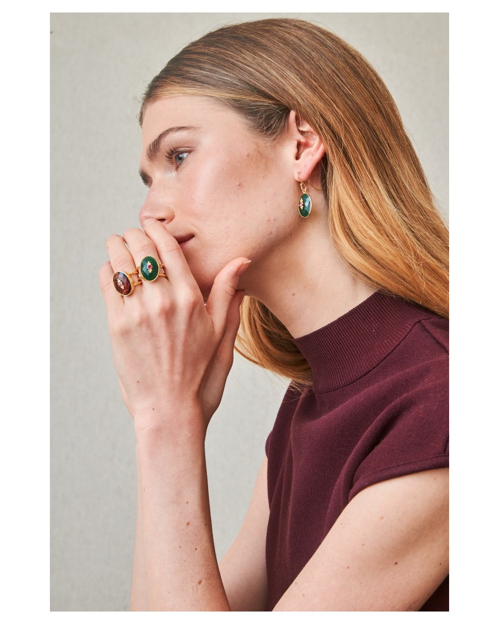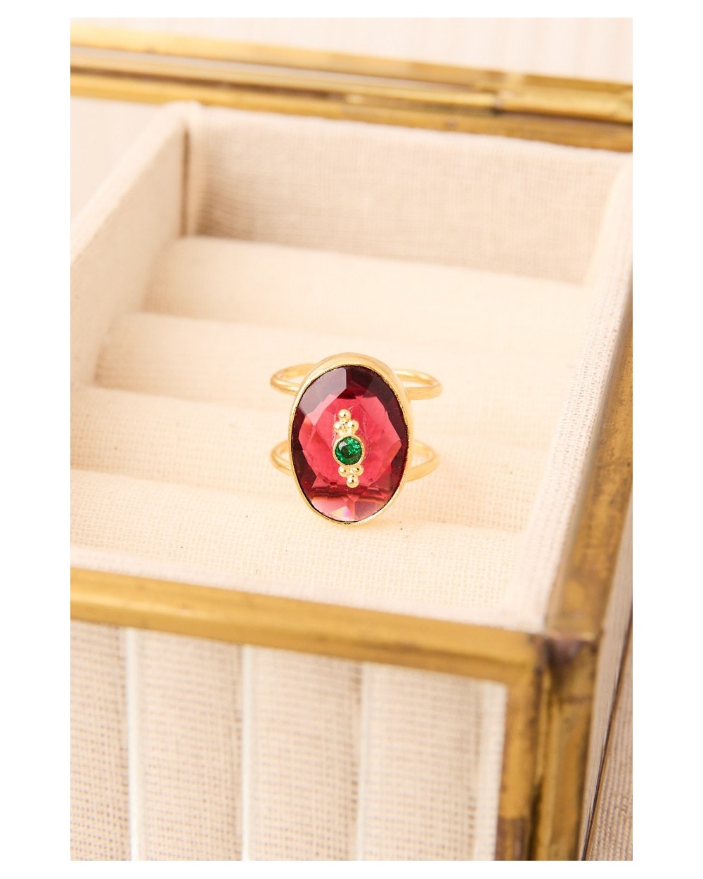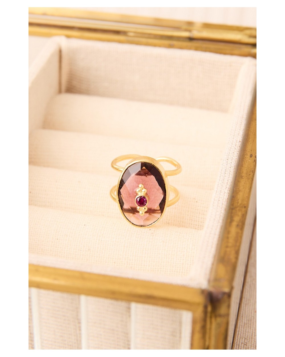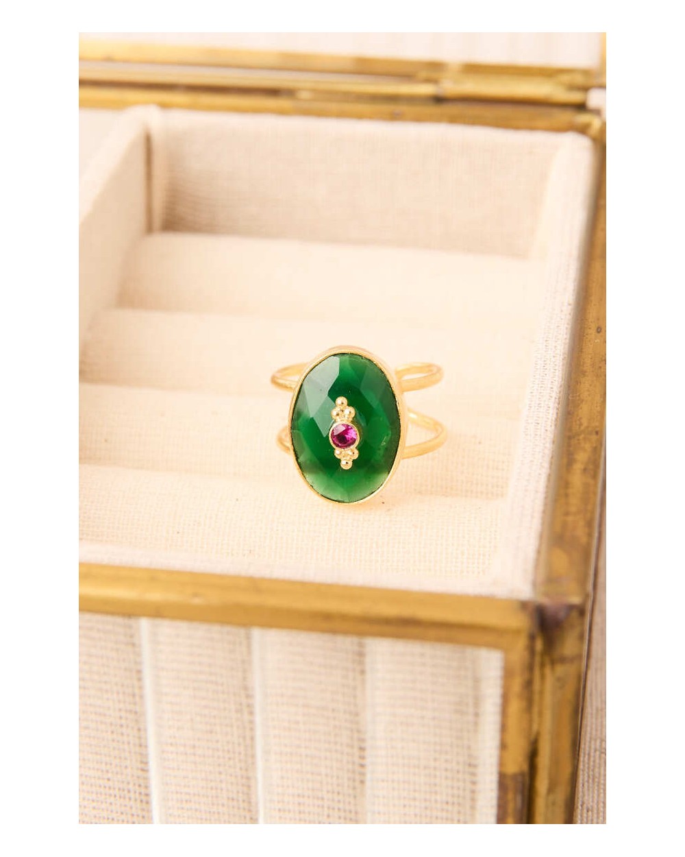 Anillo de latón bañado en oro con piedra semipreciosa facetada y detalle central en contraste. Un diseño elegante con un toque joya que eleva cualquier estilismo.