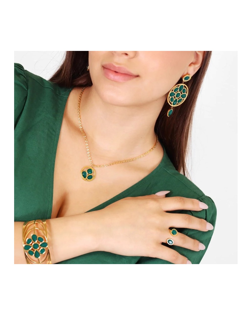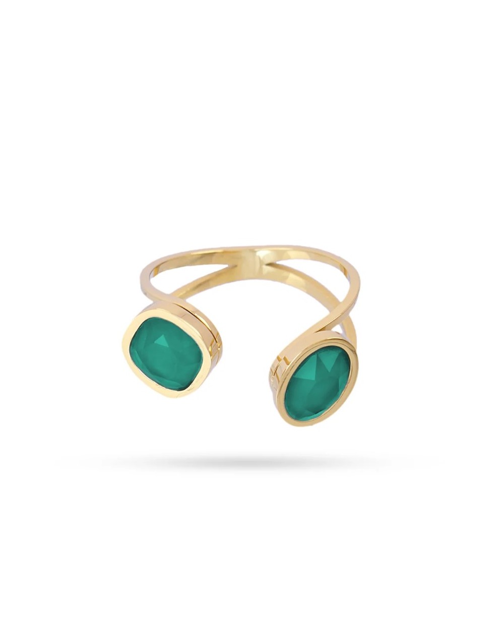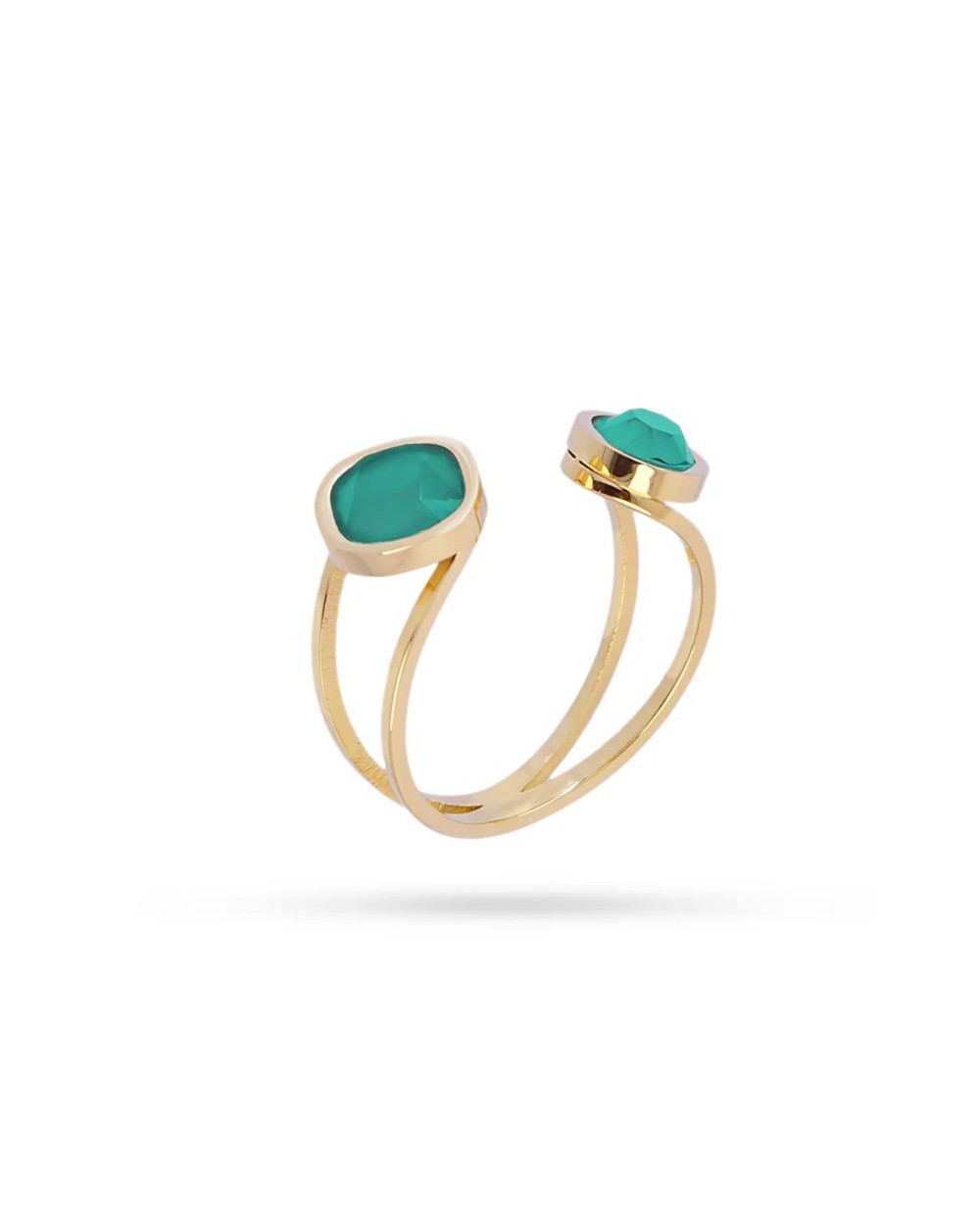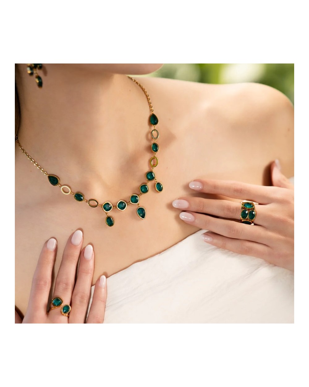 Anillo Drops Glade combina acero quirúrgico dorado co cristales coloreados en tonos verde. Elegante y hipoalergénico, es resistente al agua, ideal para acompañarte en noches, fiestas o eventos especiales.