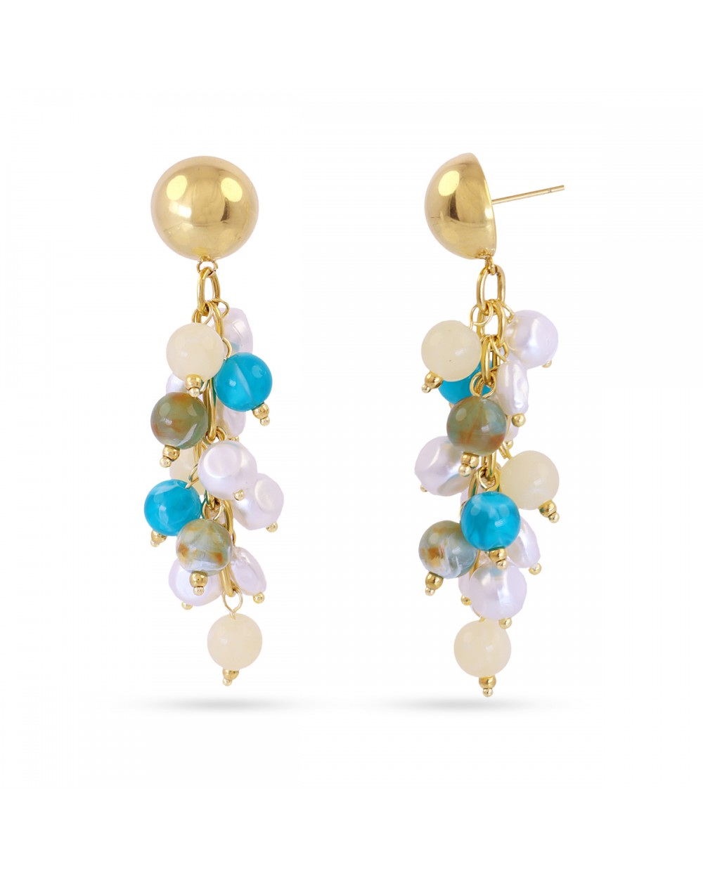 Pendientes largos en forma de racimo con bolas de materiales reciclados y acero.