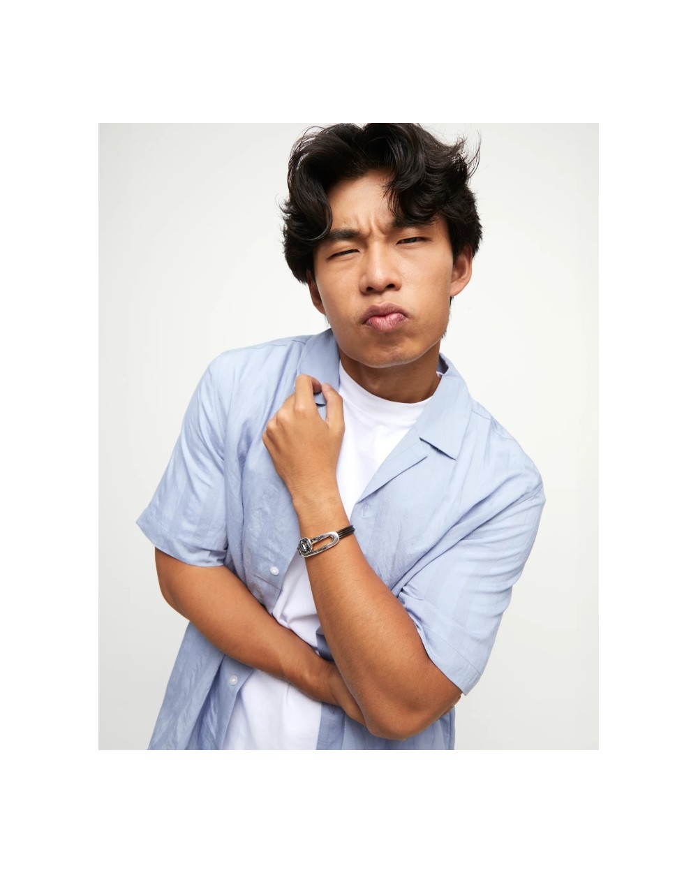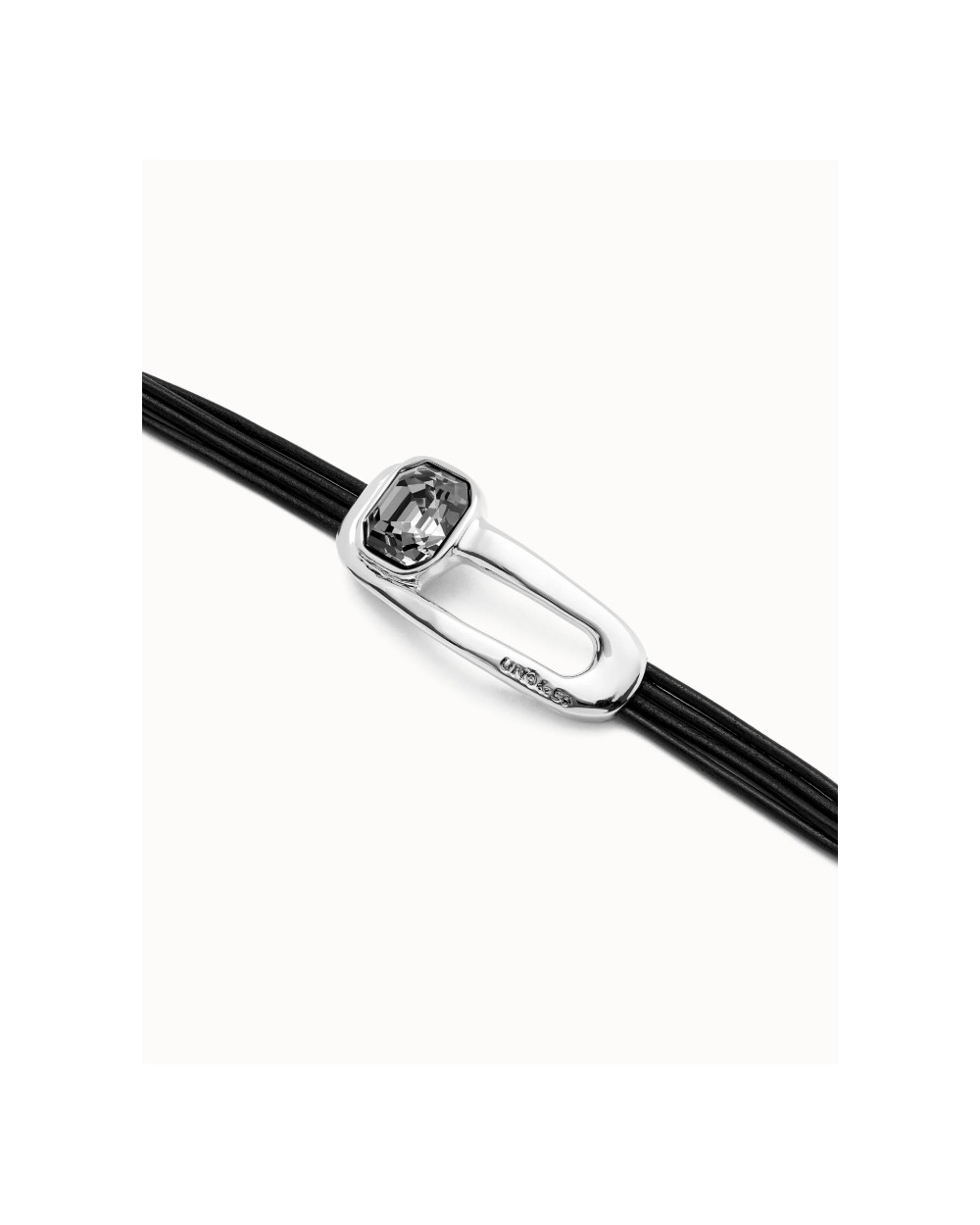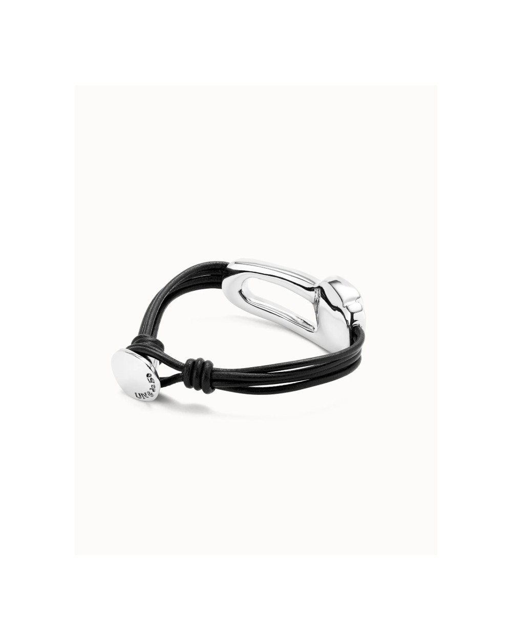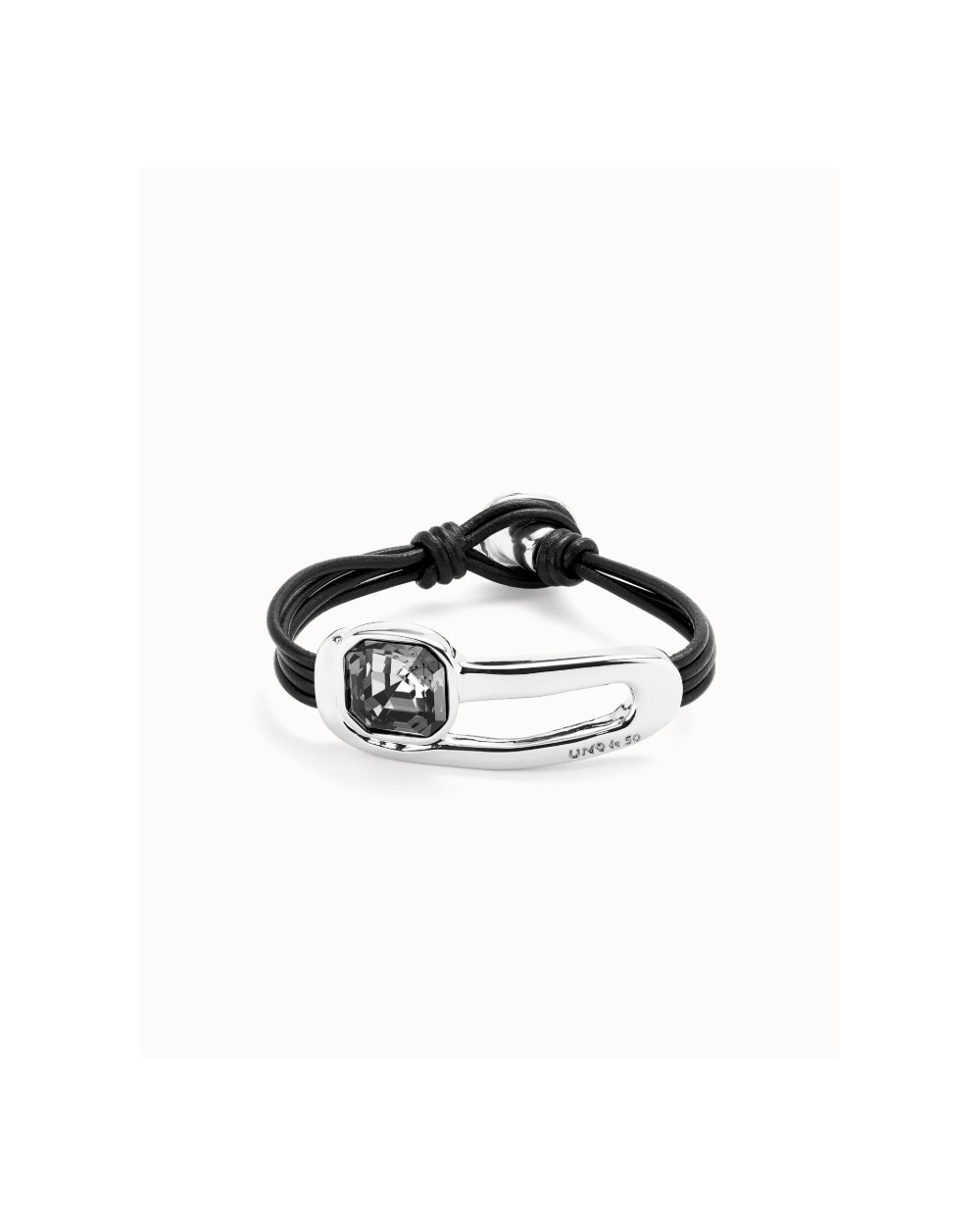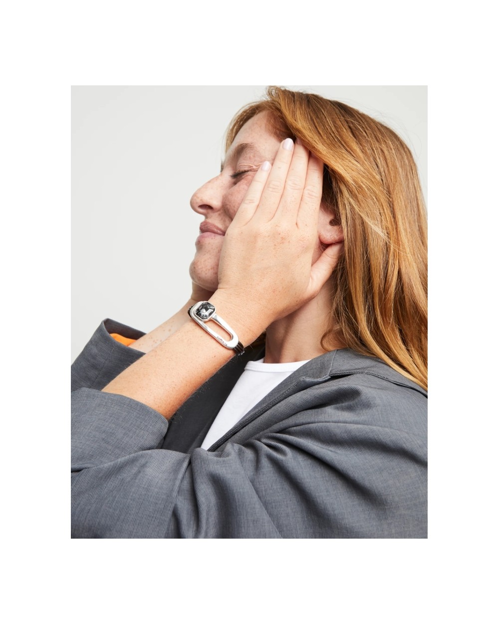 Expresa tu personalidad con esta pulsera de cuero, que combina fuerza y sofisticación con una pieza central bañada en plata y un cristal facetado gris lleno de carácter.