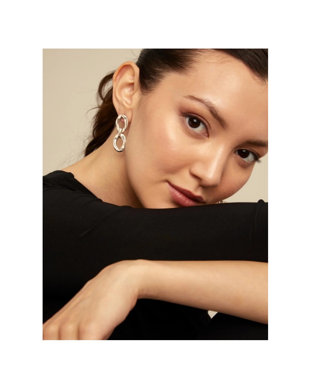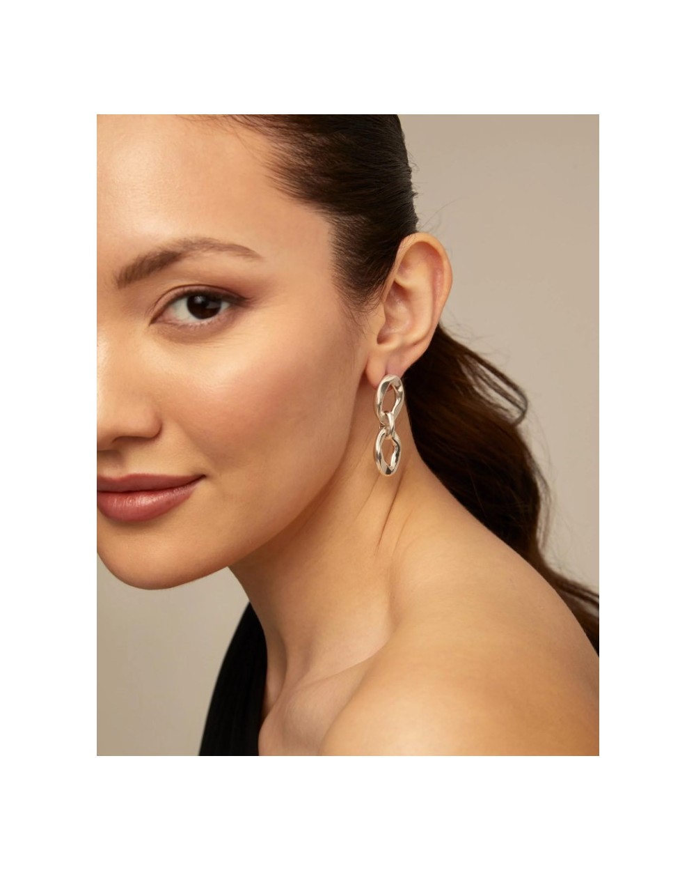 Pendientes bañados en plata de ley con un diseño de dos eslabones del mismo tamaño, unidos entre sí por una pequeña anilla con cierre de tuerca con el logo de UNOde50 grabado.