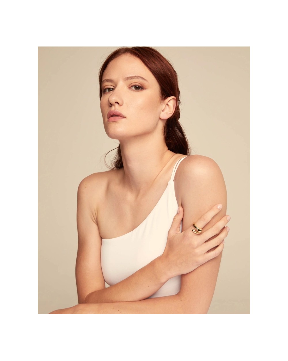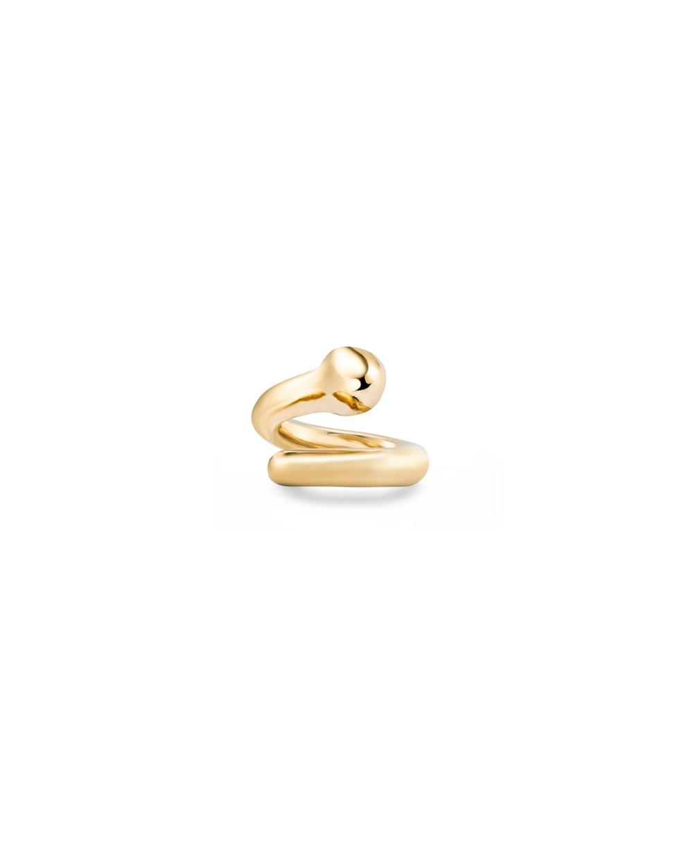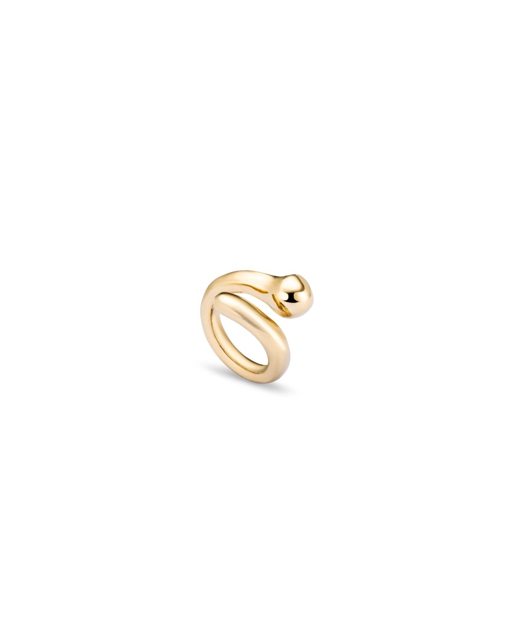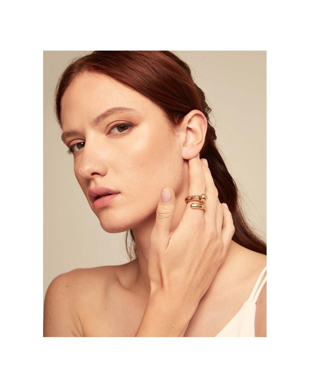 Anillo de aleación de metales bañada en oro de 18k y de diseño irregular que termina con una esfera. Joyas hechas en España, elaborada 100% artesanalmente, consiguiendo así un acabado de diseño único. Colección Youthful. Joyas inspiradas en almas jóvenes, libres y desenfadadas que terminarán enlazando experiencias hasta llegar a la madurez. Eslabones de diferentes tamaños que en ocasiones se unen para formar especiales cadenas y pulseras, mientras que en dedos y orejas se desenlazan enroscándose de manera natural y sensual. Una colección actual que puede lucirse en cualquier momento o situación.