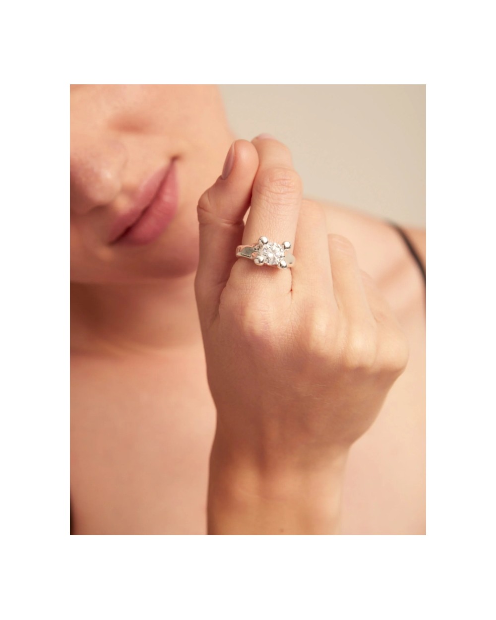 Anillo de aleación de metales bañado en plata de ley con circonita blanca tipo solitario. Joyas hechas en España, elaborada 100% artesanalmente, consiguiendo así un acabado de diseño único. Colección Spiritual, el alma y su espiritualidad. La liberación que cada uno de nosotros busca. Una introspección para poder sentirnos felices, en paz, en calma. Joyas femeninas y elegantes que combinan el metal con cristales artesanales de pequeño formato en blanco y azul, representando así el cosmos, lo divino. Garras de gran tamaño que sujetan los cristales y destacan la importancia de la plata o el oro.