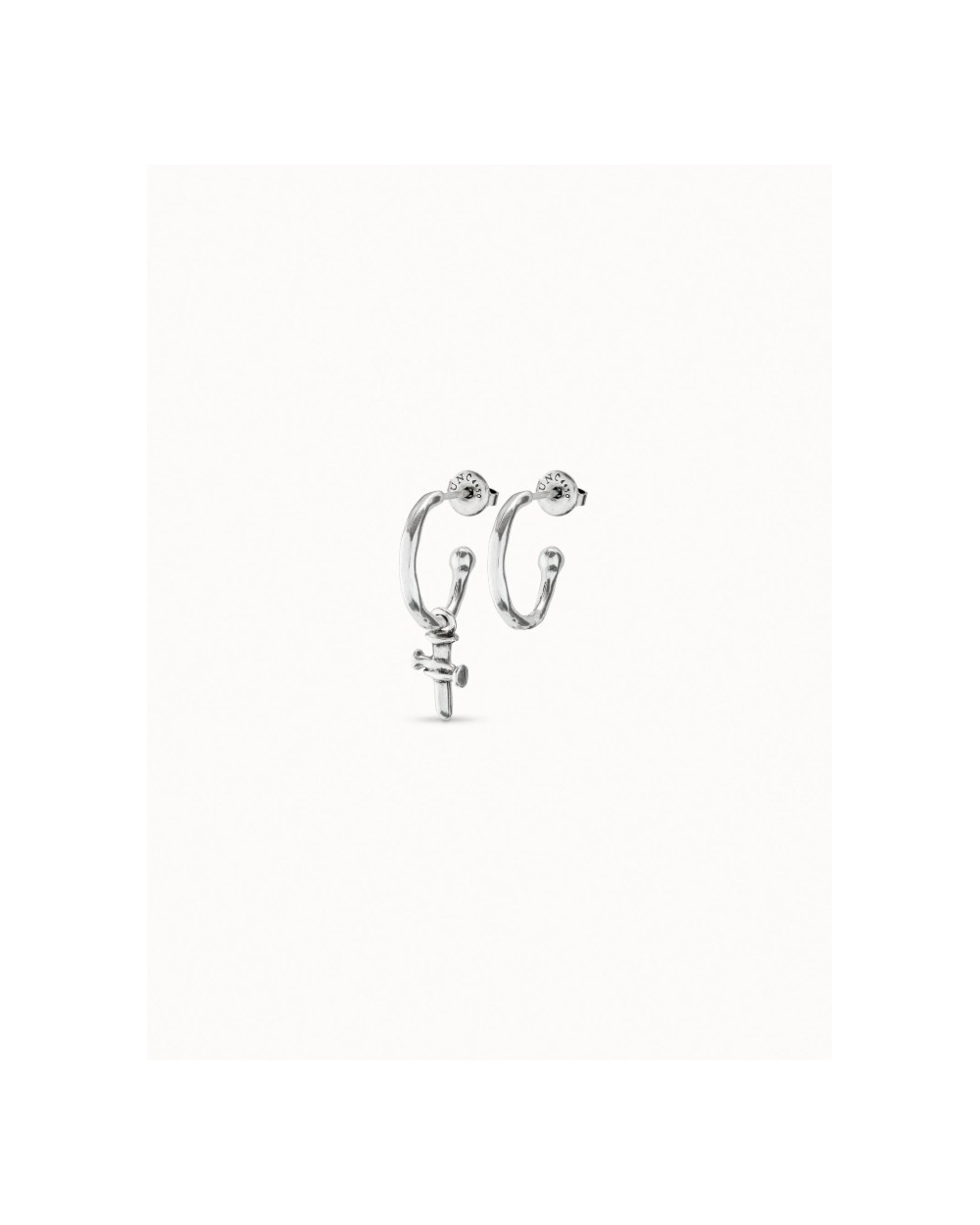 Llamativos aros de diseño abierto y forma irregular que otorgan naturalidad a todos los conjuntos con los que quieras combinarlos. Esta joya, elaborada en España, está hecha de metal bañado en plata y dispone de un cómodo cierre de presión. Hazte con este original complemento, hecho a mano al 100% por UNOde50.