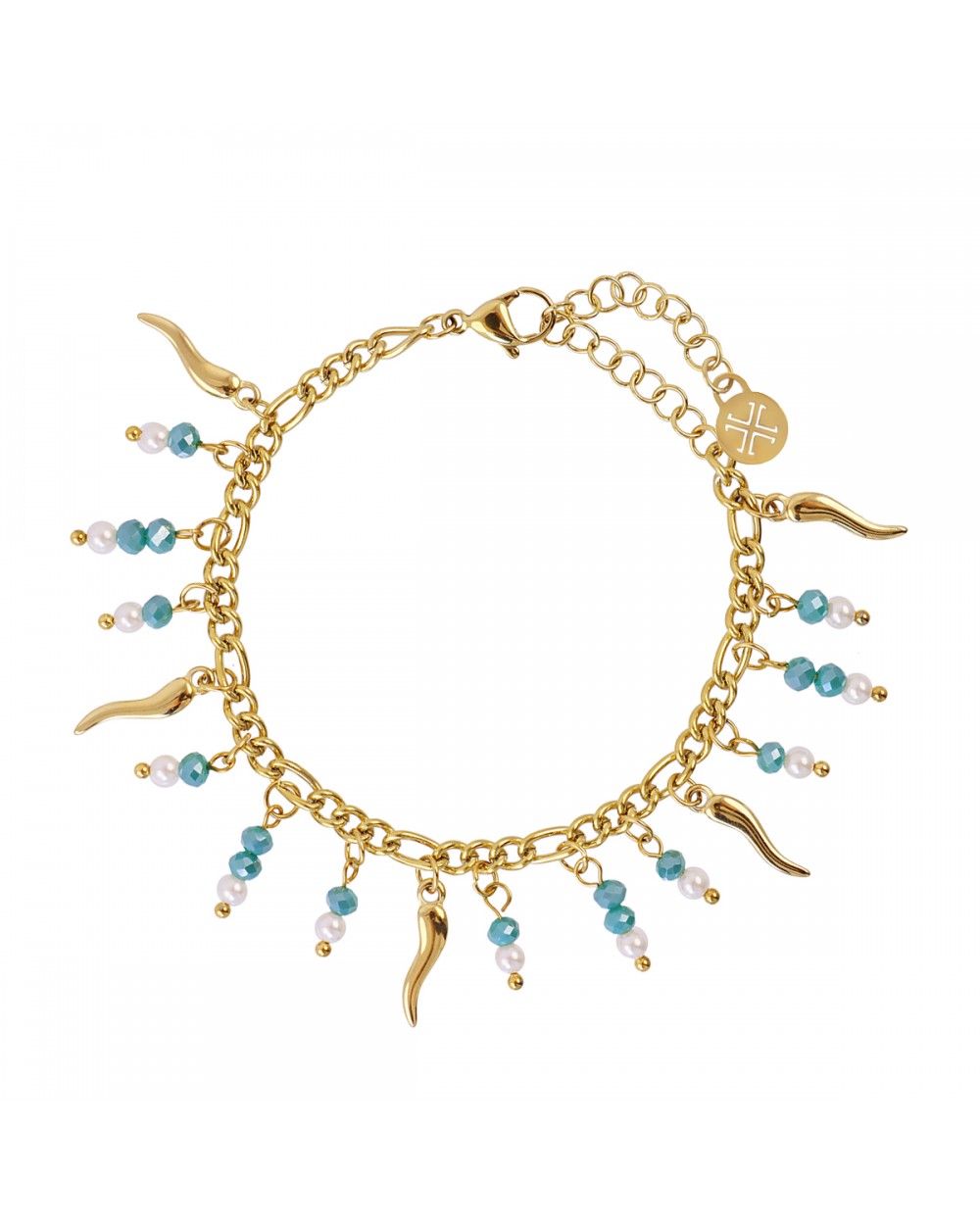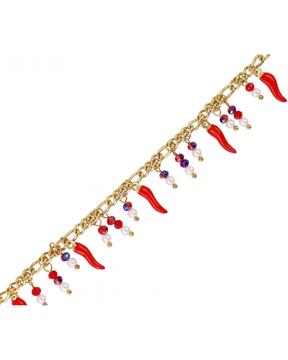 Pulsera Cornicello Serendipity: una pieza de joyería que fusiona tradición italiana con diseño contemporáneo. Confeccionada en acero quirúrgico hipoalergénico, presenta abalorios esmaltados, perlas y cristal. El icónico cornicello actúa como amuleto de protección, mientras que la cadena ajustable se adapta a tu muñeca con comodidad. Cada detalle refleja el compromiso de Anartxy con la calidad superior. Un accesorio versátil que trasciende lo cotidiano, llevando consigo símbolos ancestrales de buena fortuna.