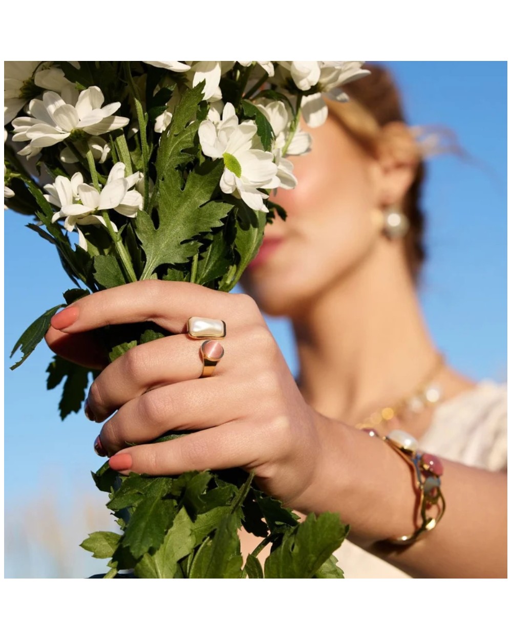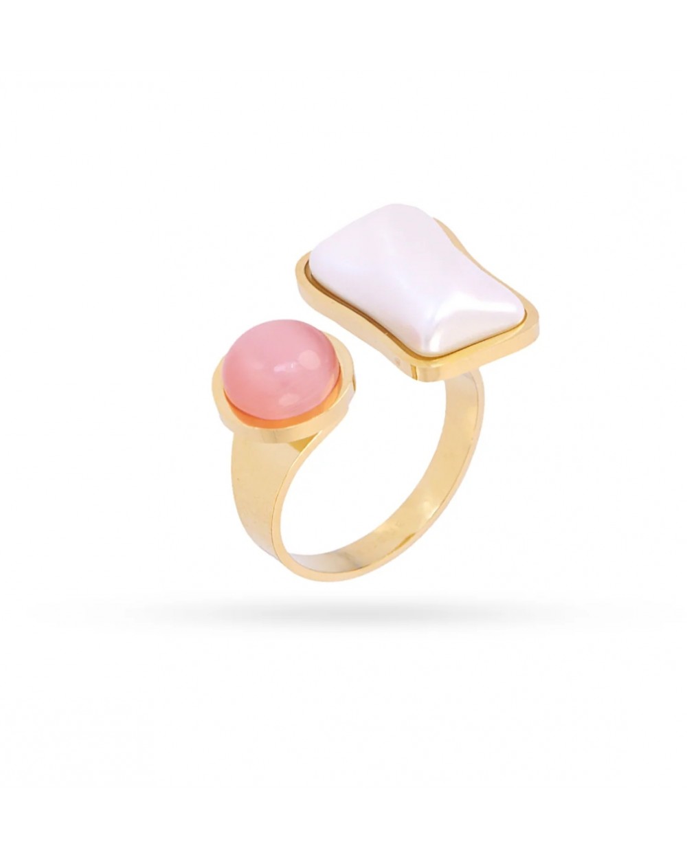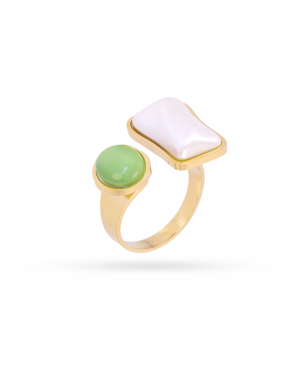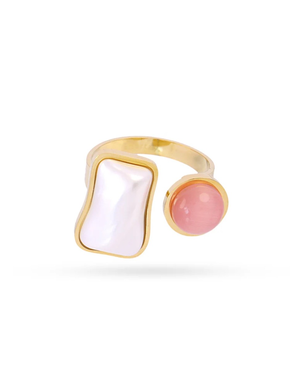 Anillo Mirage Lucid: audacia en cada detalle. Este diseño ajustable combina oro con una piedra rosa o verde pastel que captura la luz de forma hipnotizante, coronado por una perla cuadrada que desafía la geometría convencional. Un accesorio que no pide permiso, que abraza lo inesperado y transforma tu presencia en una declaración de estilo sin compromisos.