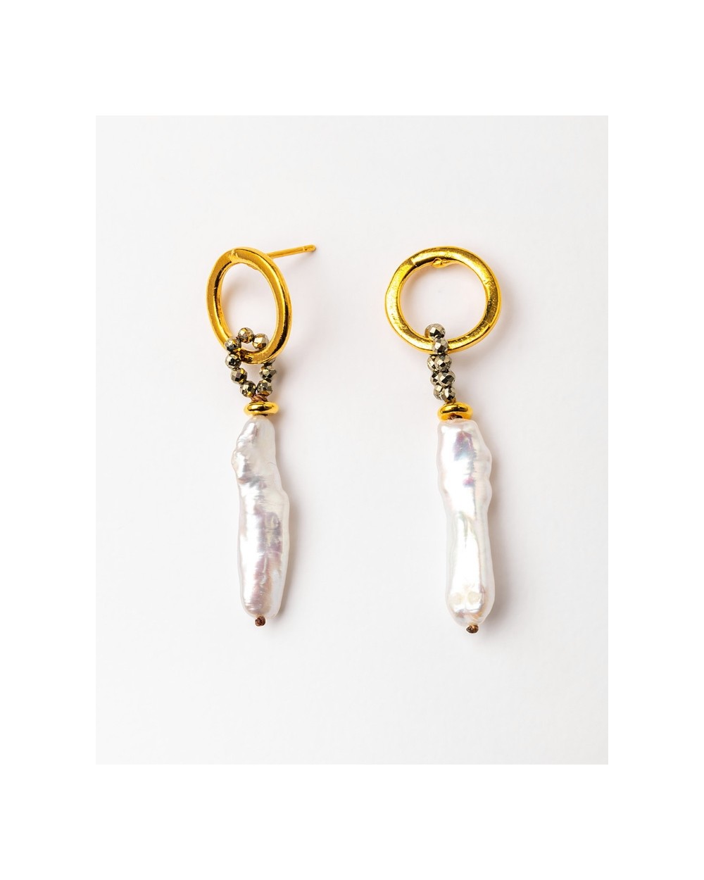 - Pendientes con piritas y perlas barrocas bañados en oro de 18 kt. y última capa de 24 kt. Tope XL con plato de 9,5mm. para una mejor sujeción. Hechos a mano 100% en España.