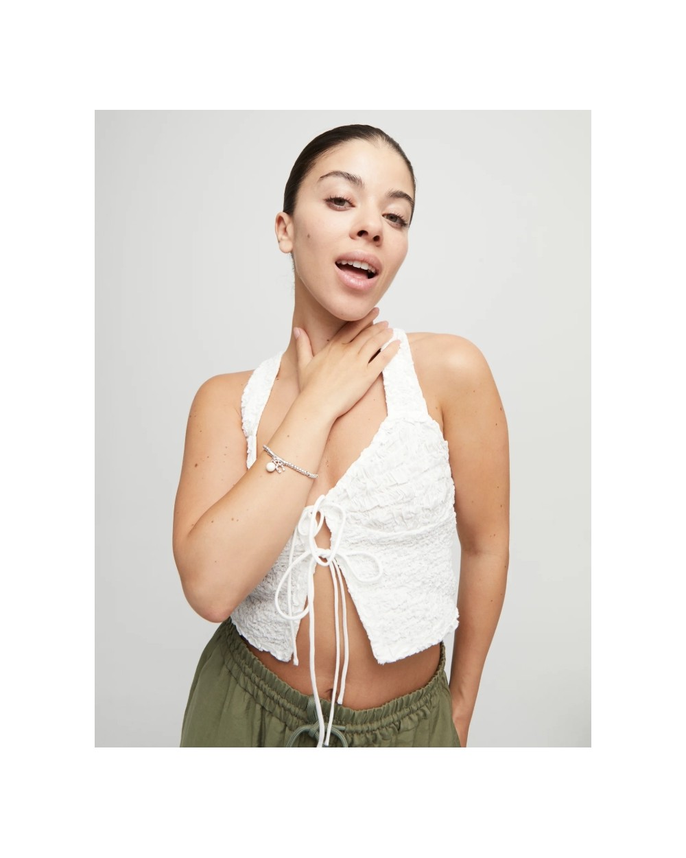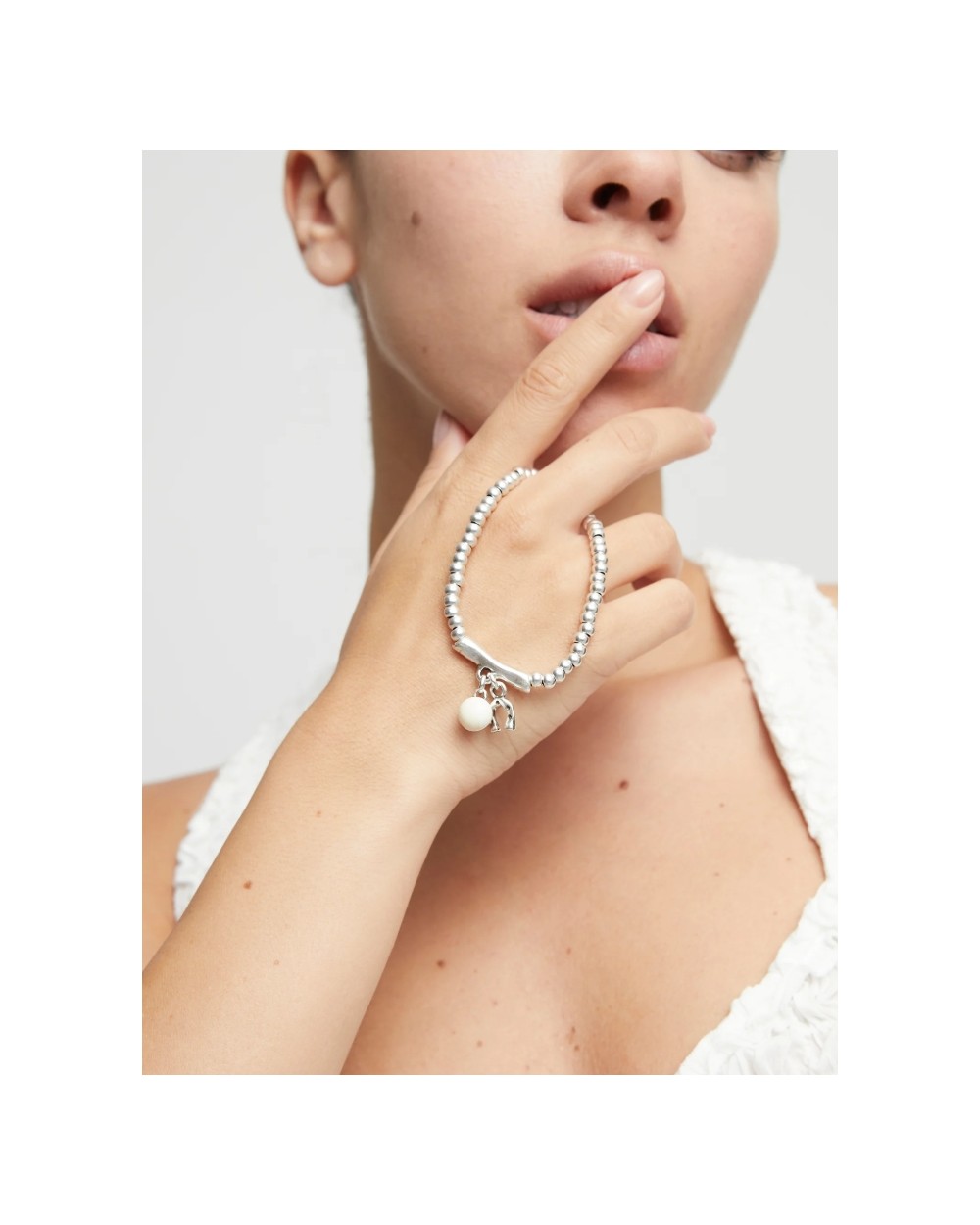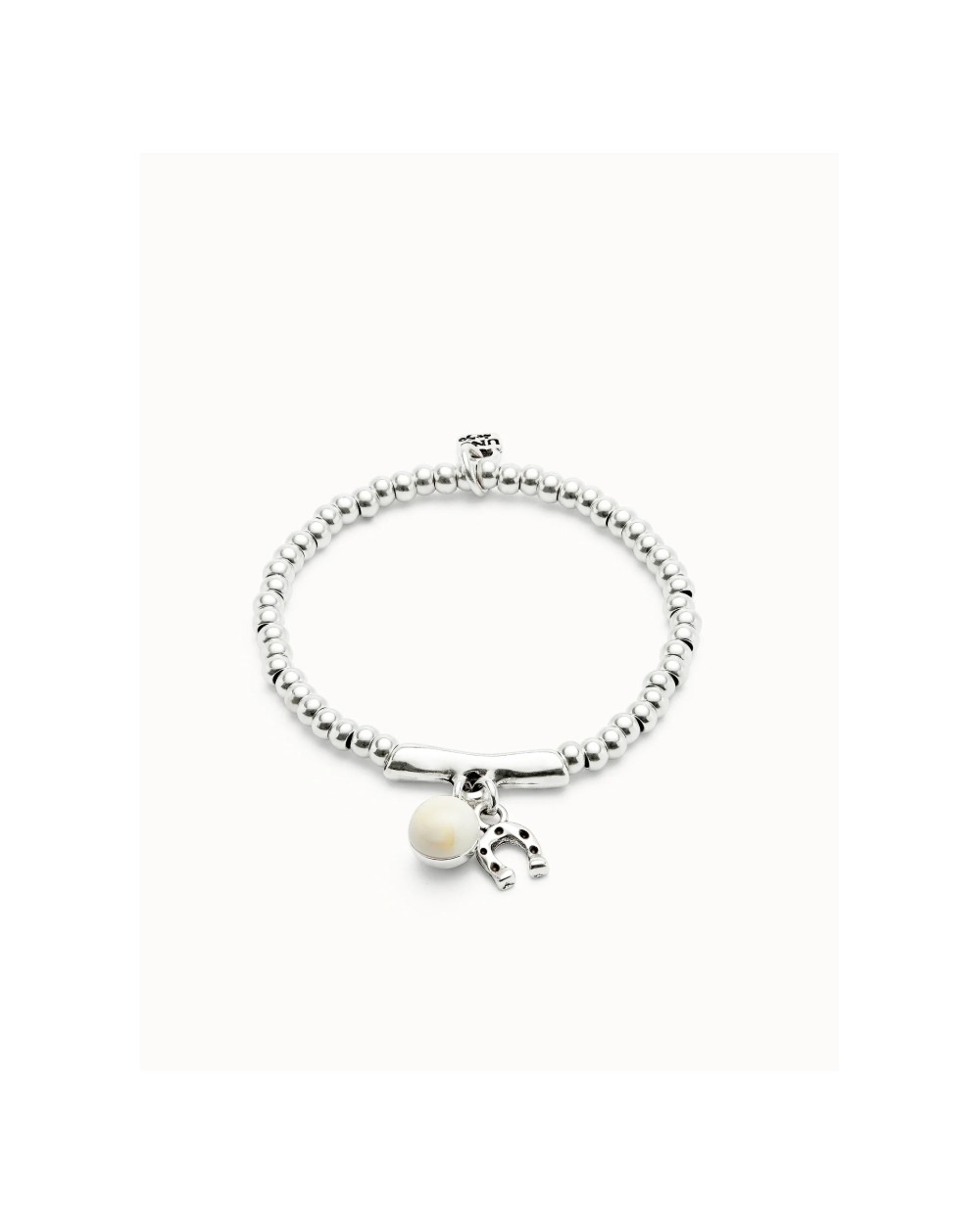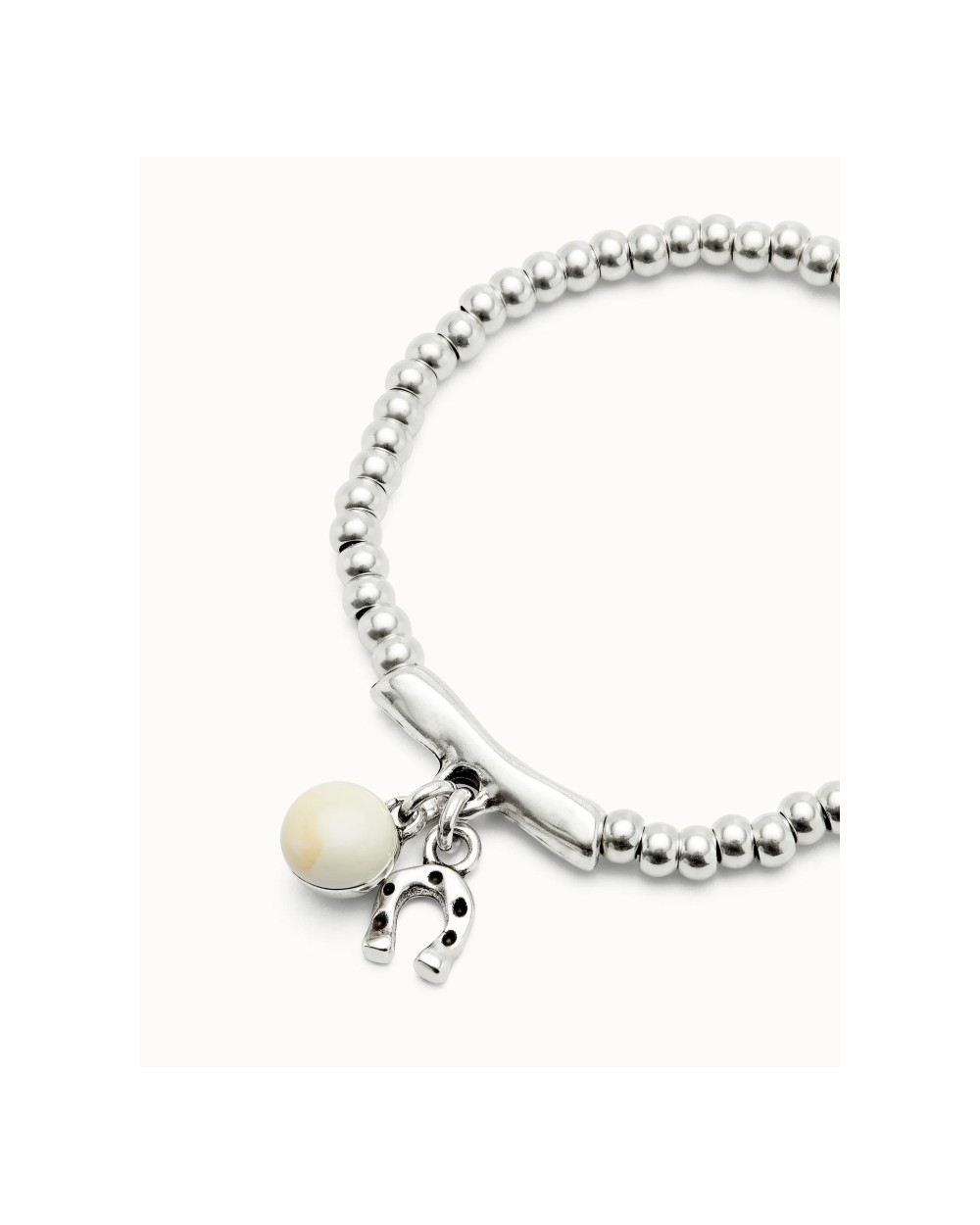 Esta pulsera bañada en plata combina cuentas redondeadas y una barra central de la que cuelgan dos charms con un mensaje claro: una herradura, símbolo universal de buena fortuna, y una gota de cristal de Murano en tono marfil, que aporta claridad y serenidad.
