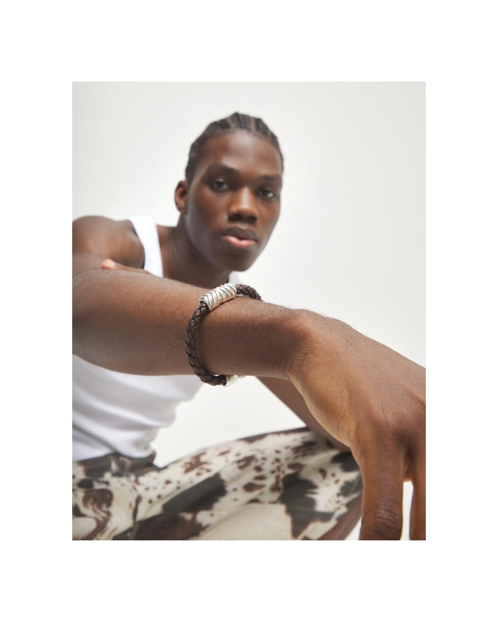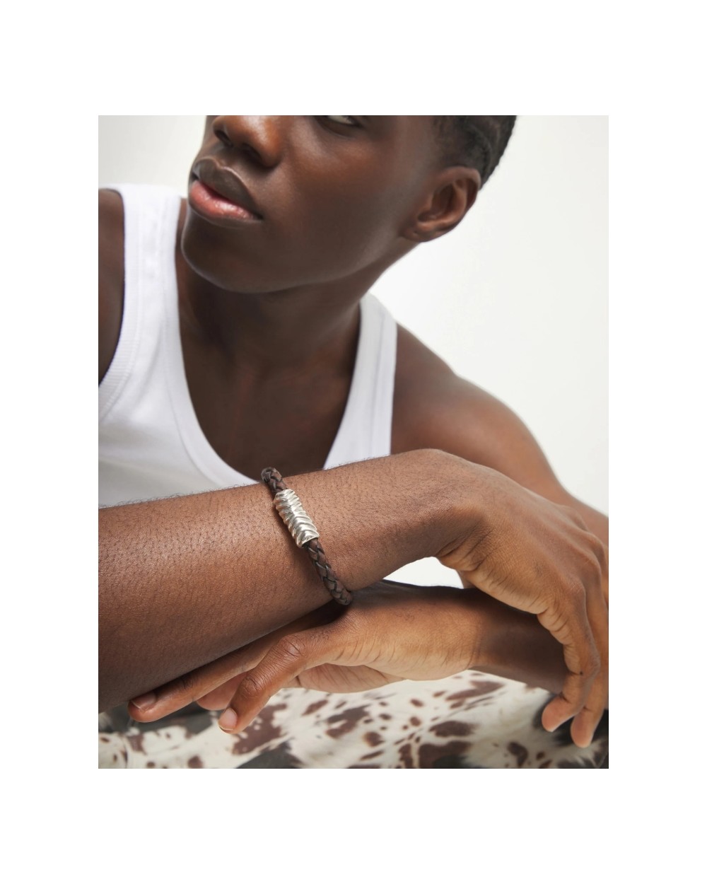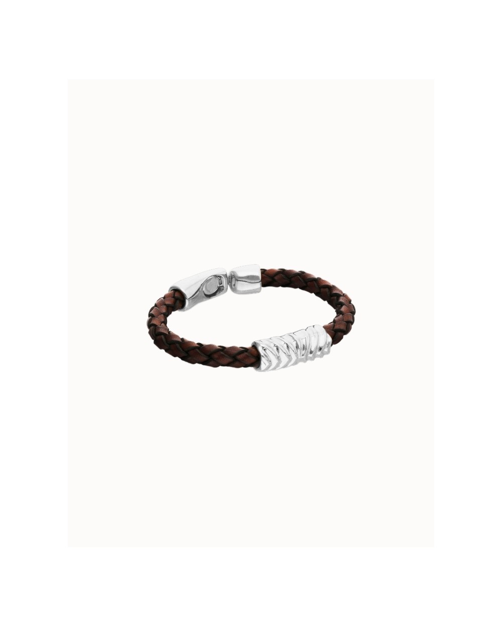 Pulsera de cuero trenzado en tono marrón con aplique central en forma orgánica bañado en plata de ley.