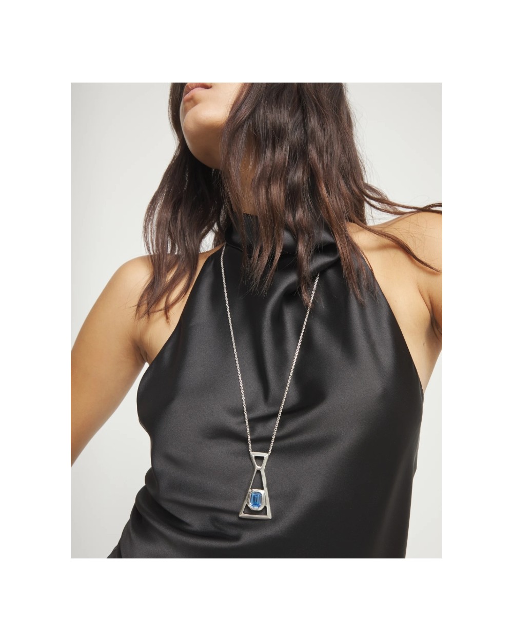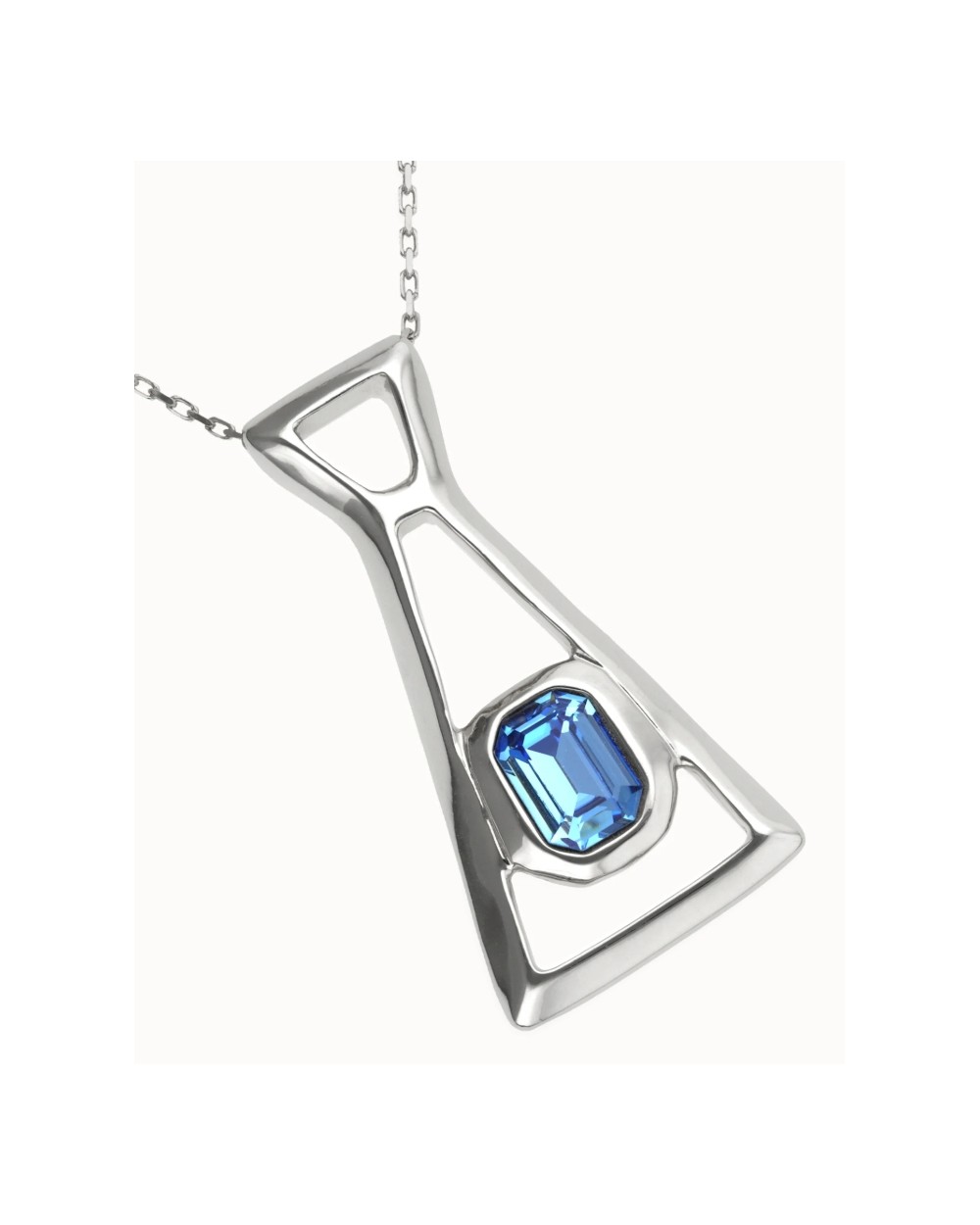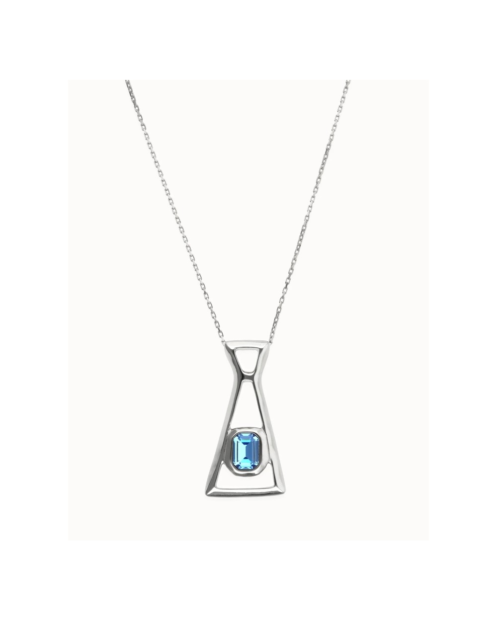 Collar bañado en plata de diseño alargado y estructura abierta, con un cristal facetado rectangular azul integrado en la parte inferior como punto focal.