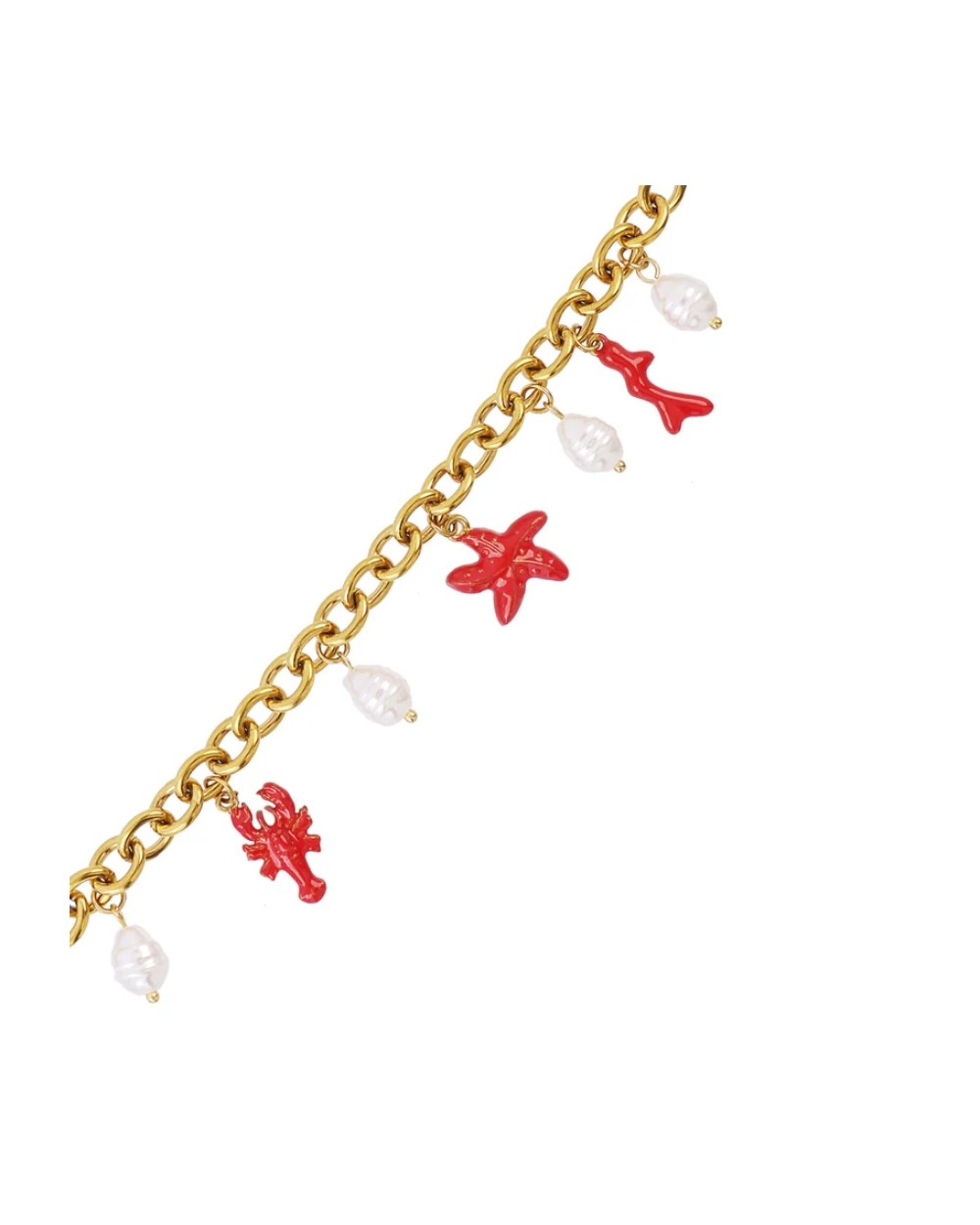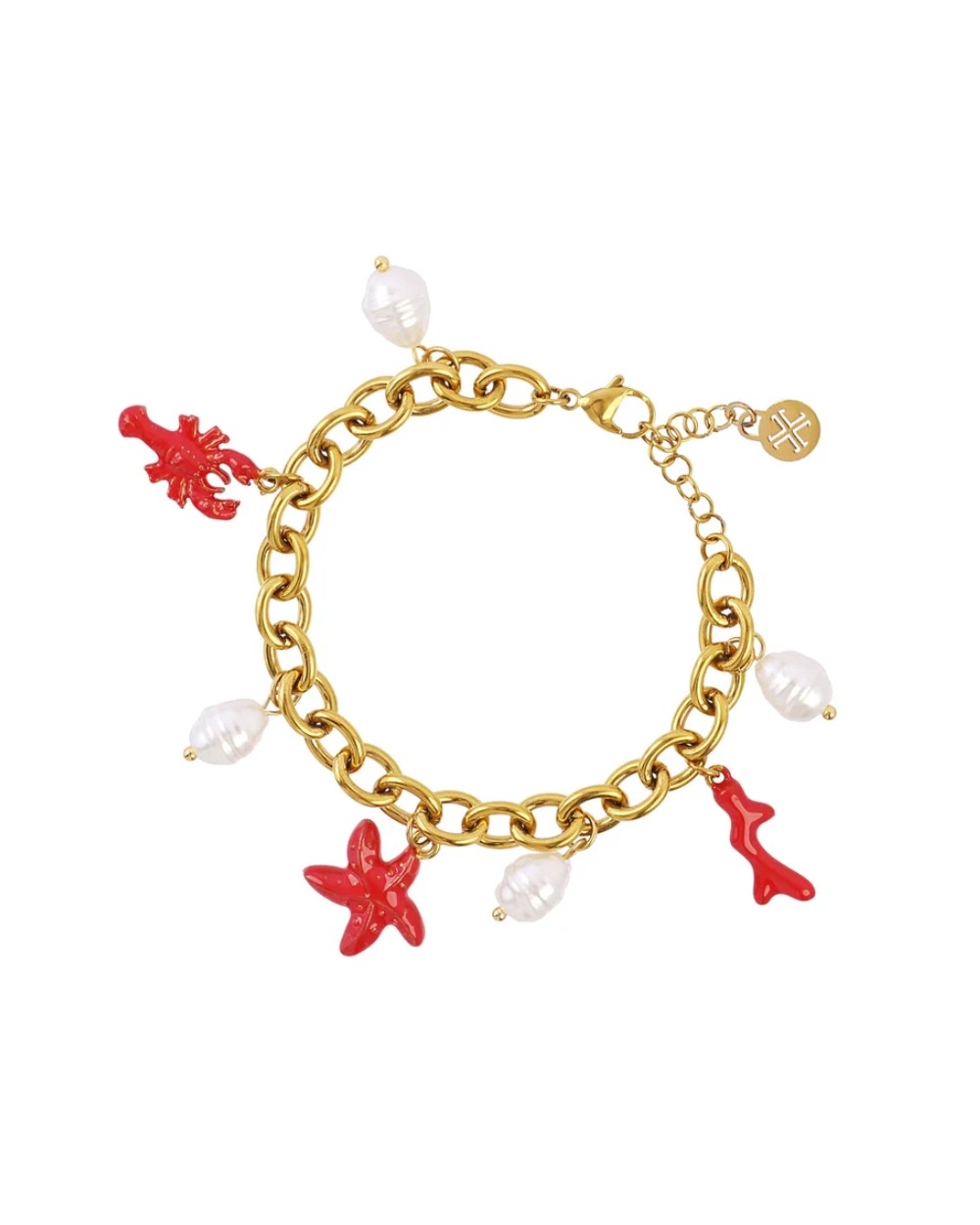 Pulsera Coast Saline con cadena dorada extensible en acero inoxidable hipoalergénico. Diseño elegante que combina detalles marinos de cerámica en tonos rojos con perlas delicadas. Perfecta para un look versátil que se adapta a cualquier ocasión. Material resistente y seguro para pieles sensibles. Combínala con su collar a juego.