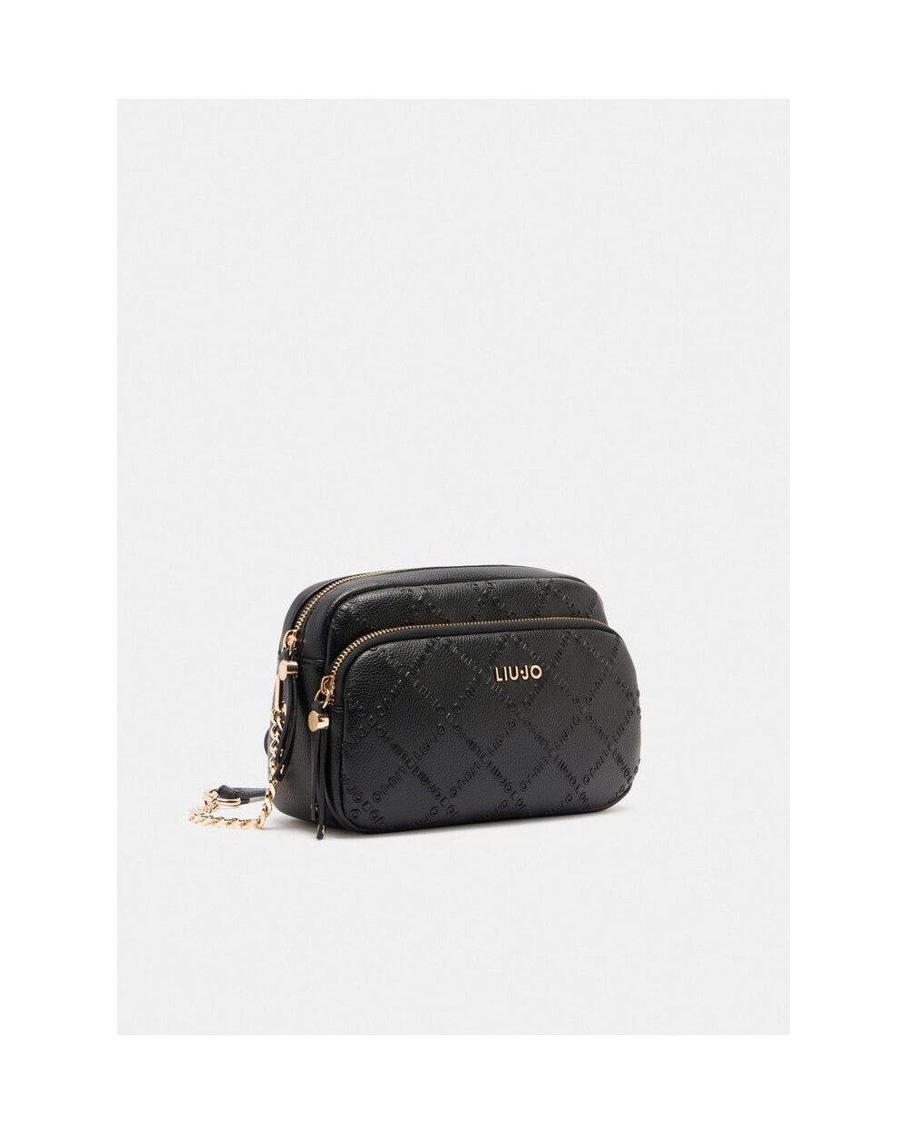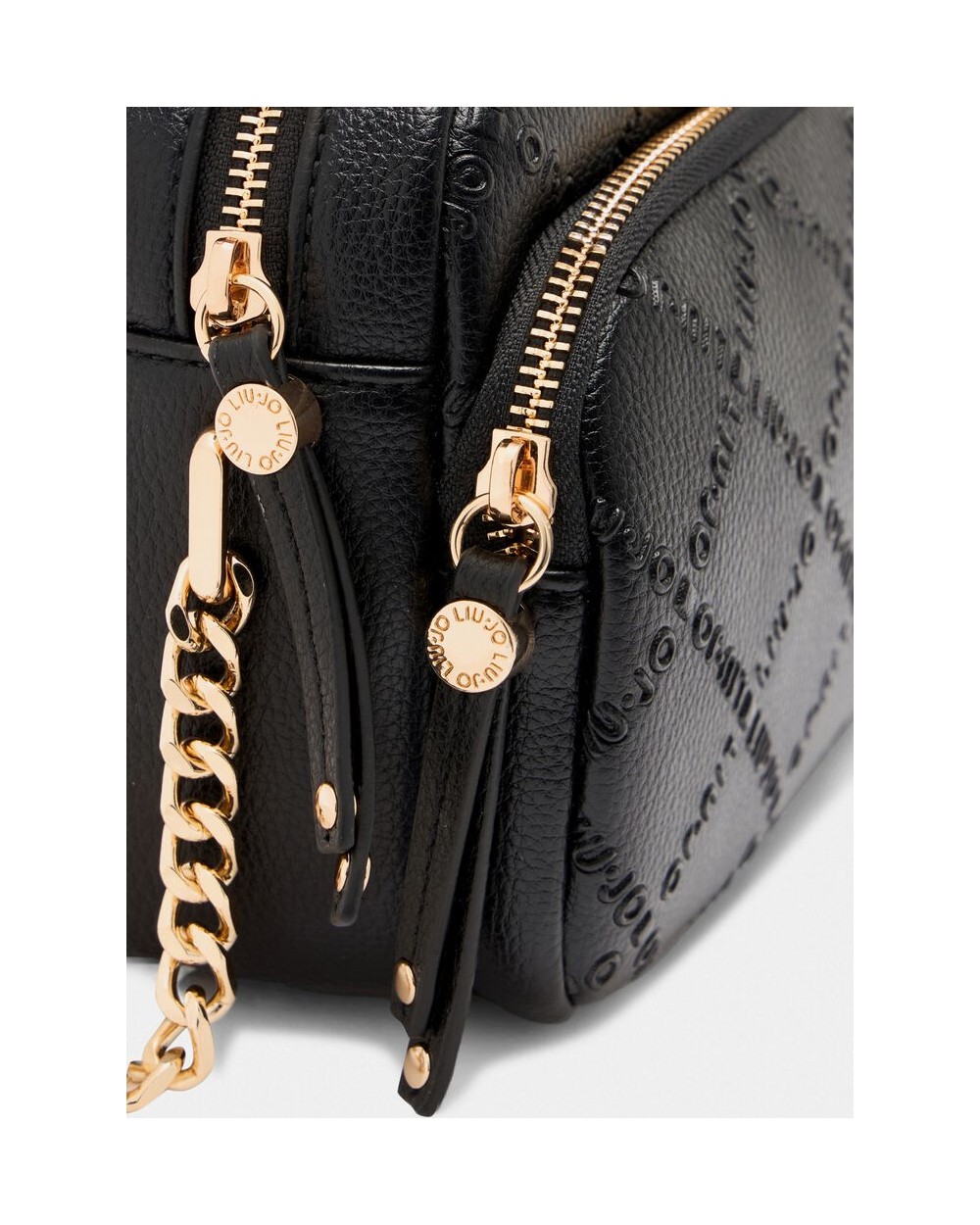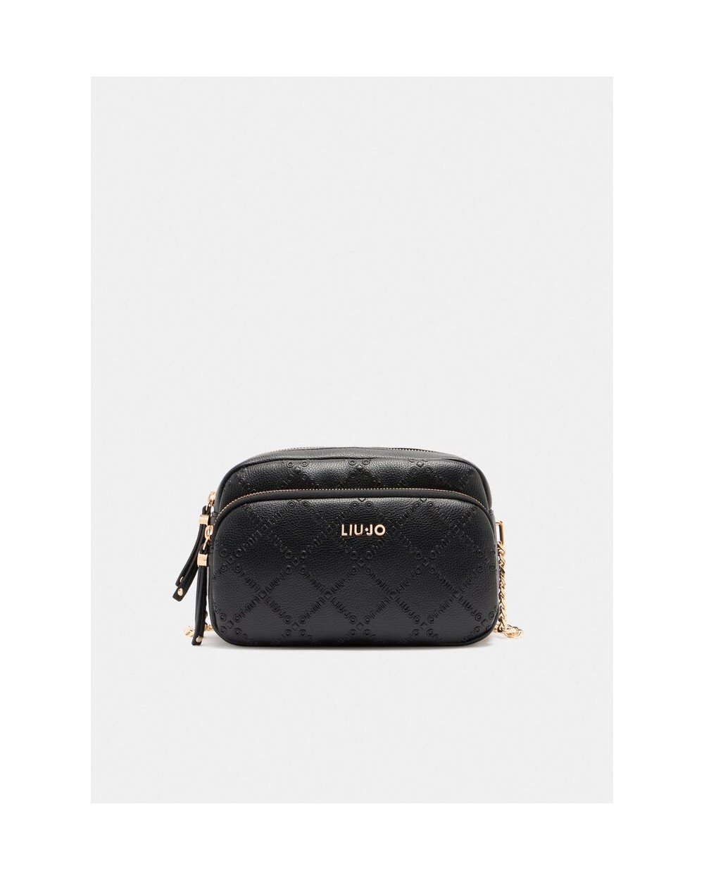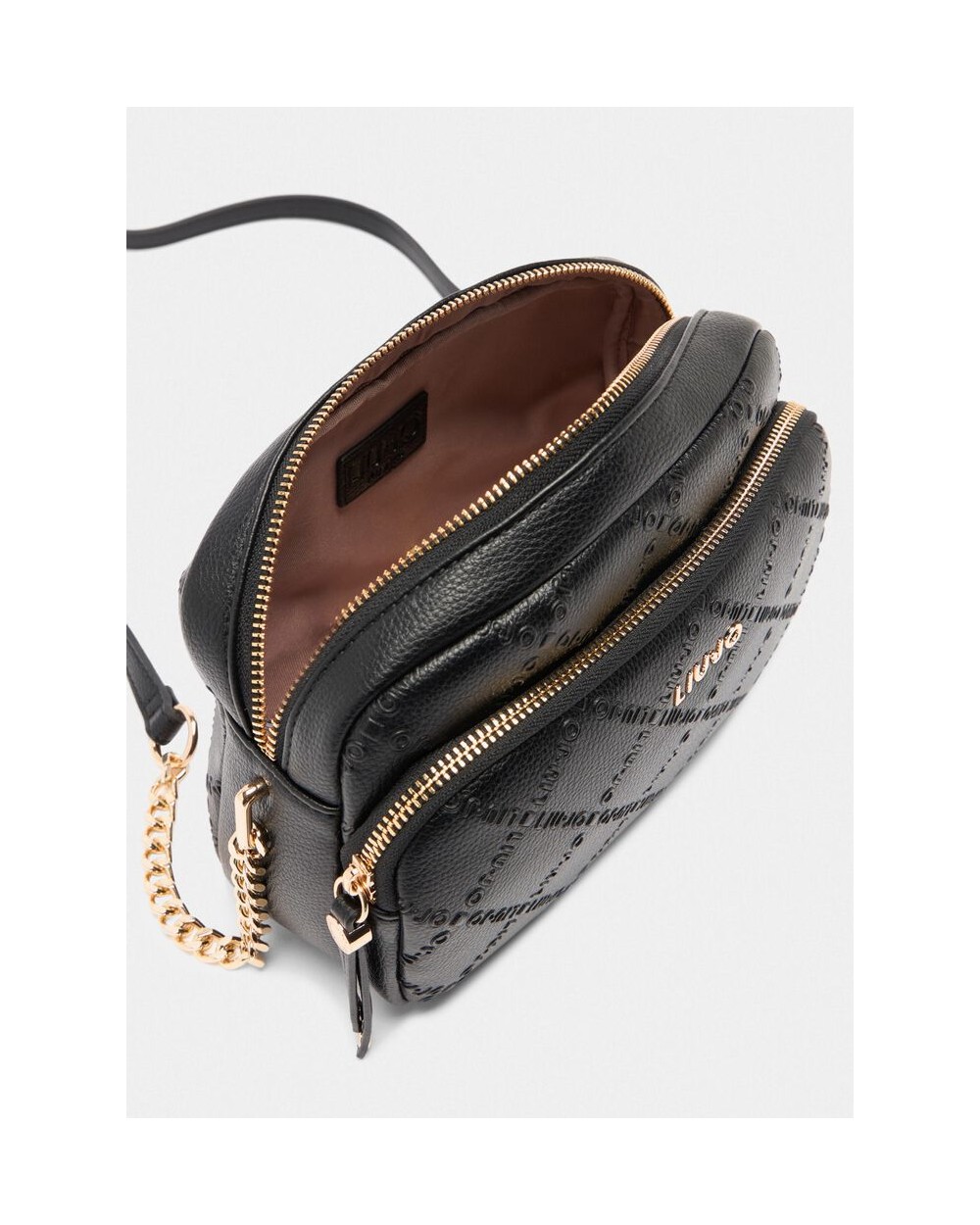 - Bolso bandolera negra con dos bolsillos, correa ajustable, estampado en relieve, logo en metal, colgante de adorno con logo, bolsillo delantero con cremallera, cierre con cremallera con forro interior.