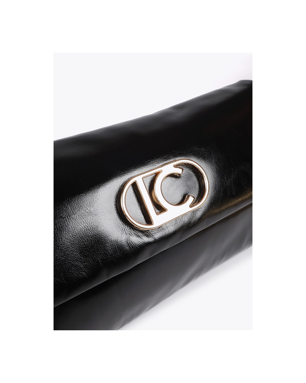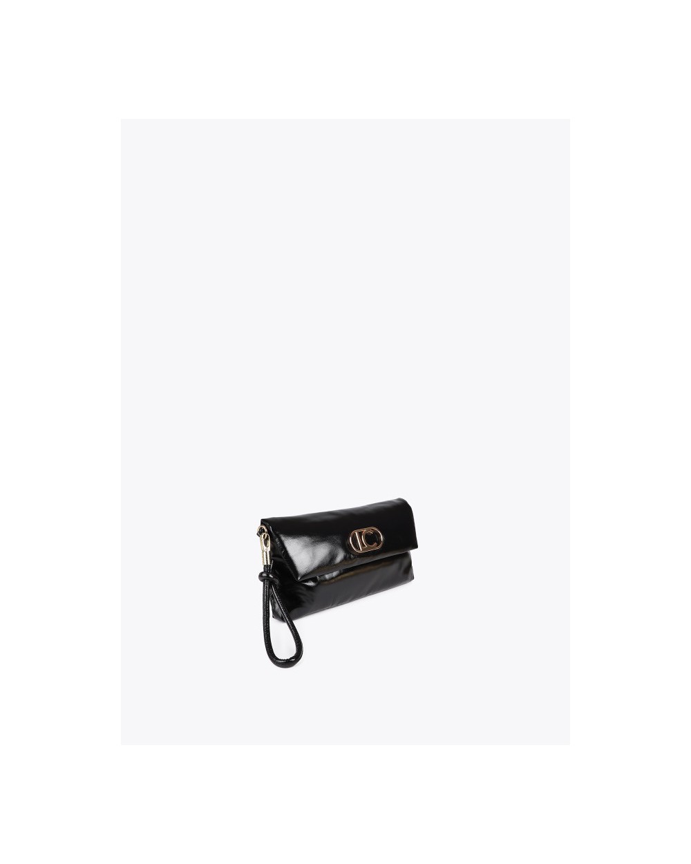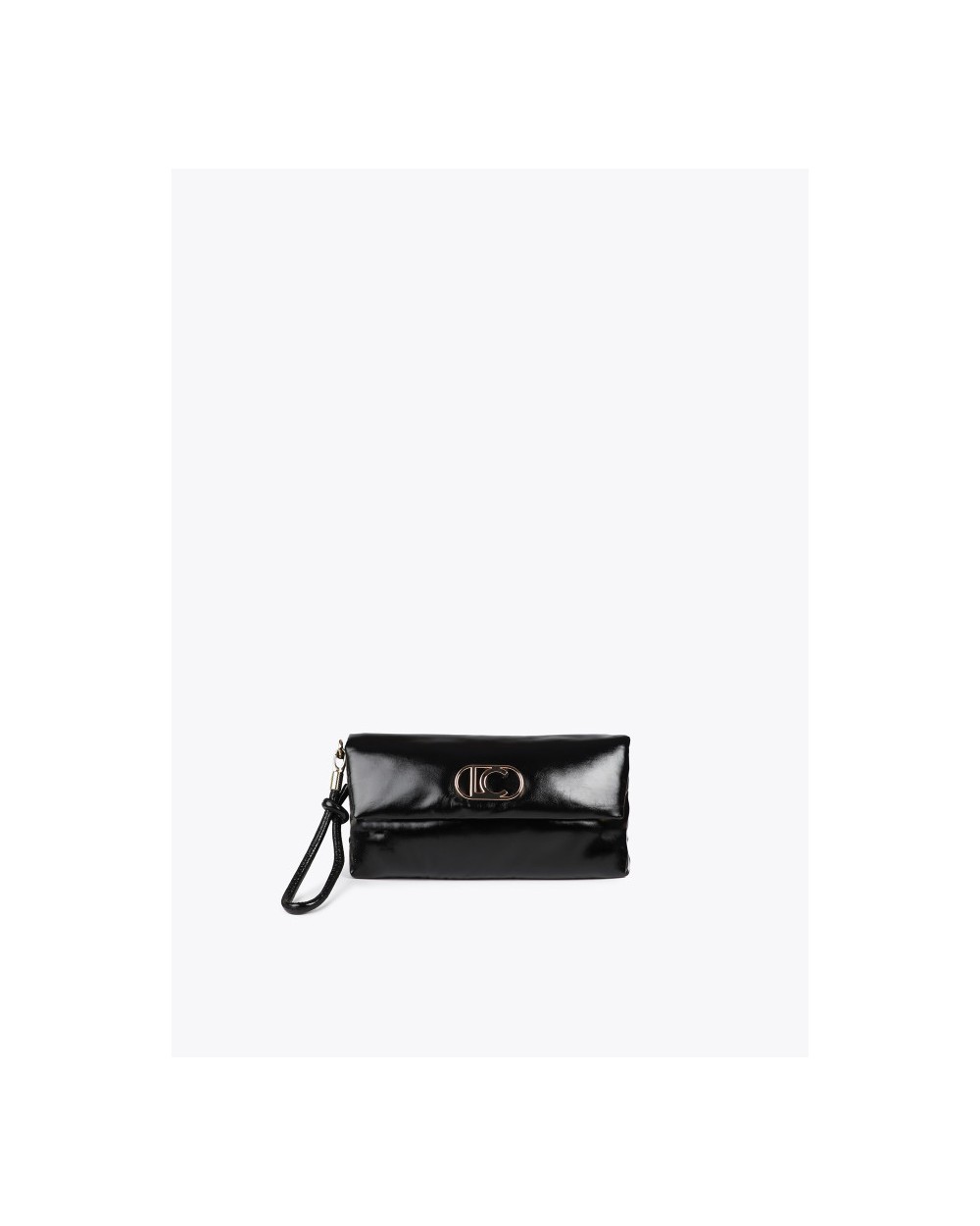 Cartera de mano negra, acolchada en efecto piel metalizada. Logo LC ovalado en metal dorado, Cierre imantado y correa de muñeca extraìble. Interior forrado y bolsillo con cremallera.