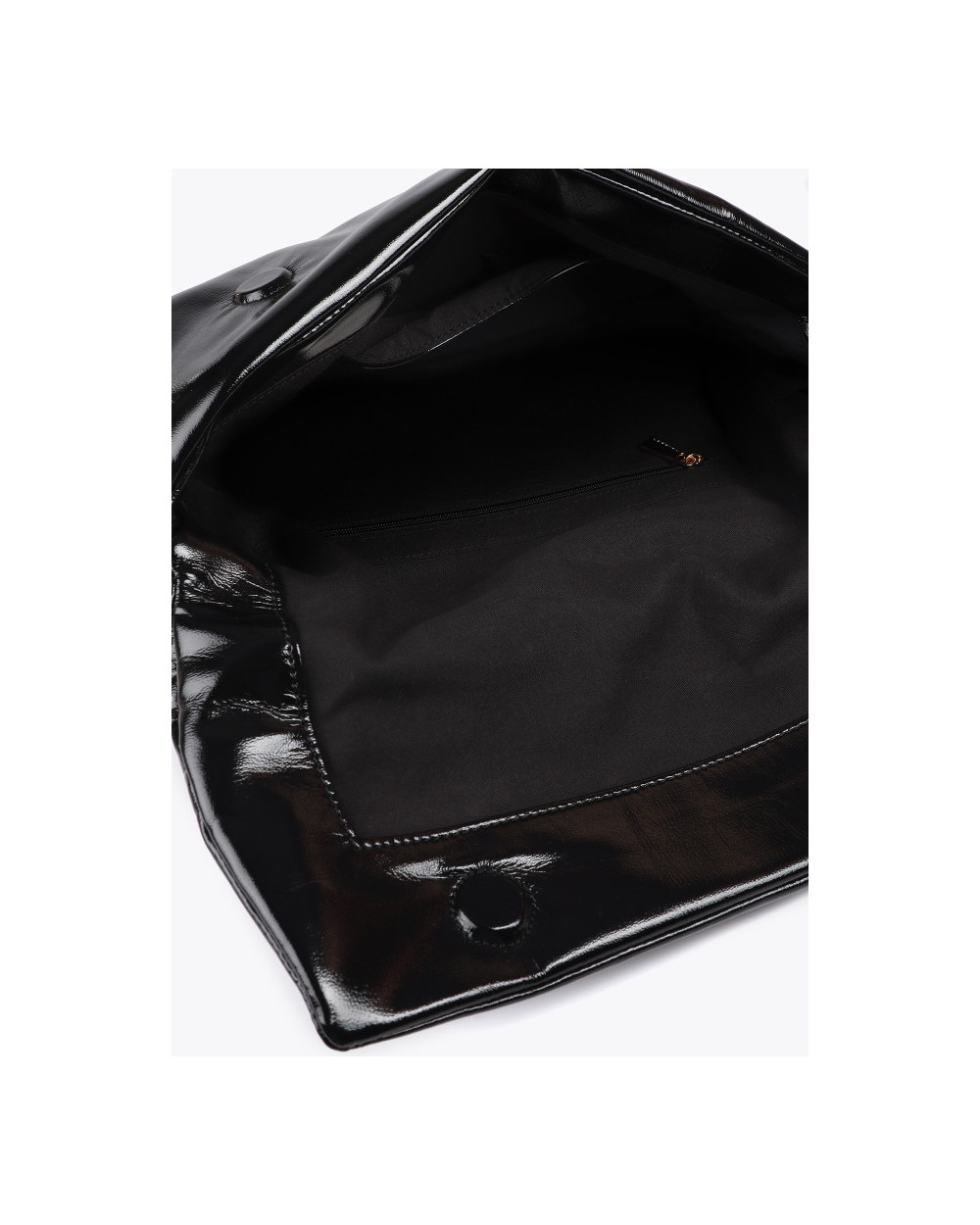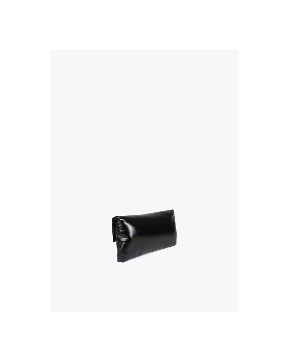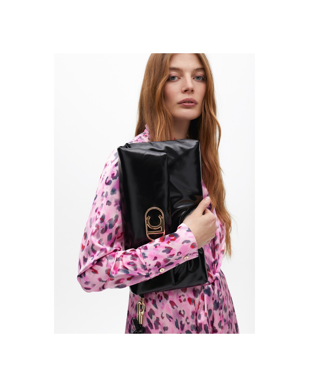 Cartera de mano negra, acolchada en efecto piel metalizada. Logo LC ovalado en metal dorado, Cierre imantado y correa de muñeca extraìble. Interior forrado y bolsillo con cremallera.
