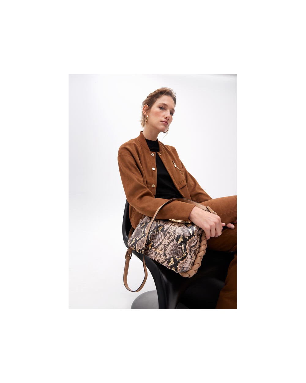 Bolso combinado en negro, marròn, y beige con estampado pitòn, asa de mano metalizada y asa larga para cruzar.