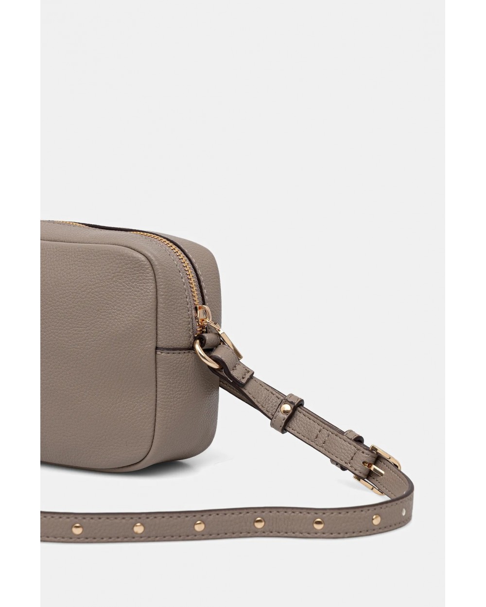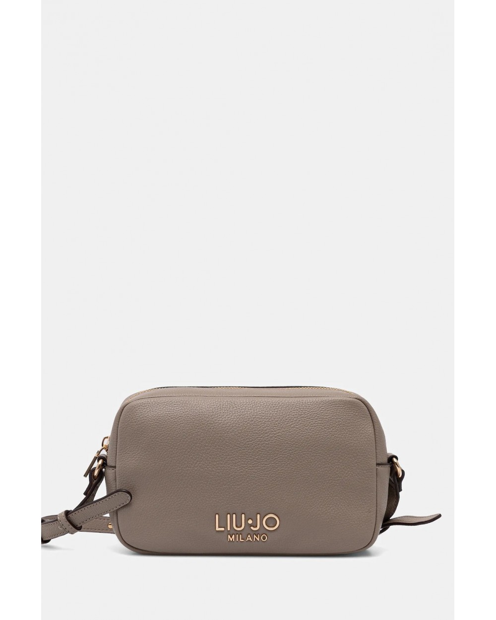 Bolso TAUPE de liujo, con logo en dorado, asa larga ajustable en altura con tachuelas. Forro con logo y cierre central con cremallera.