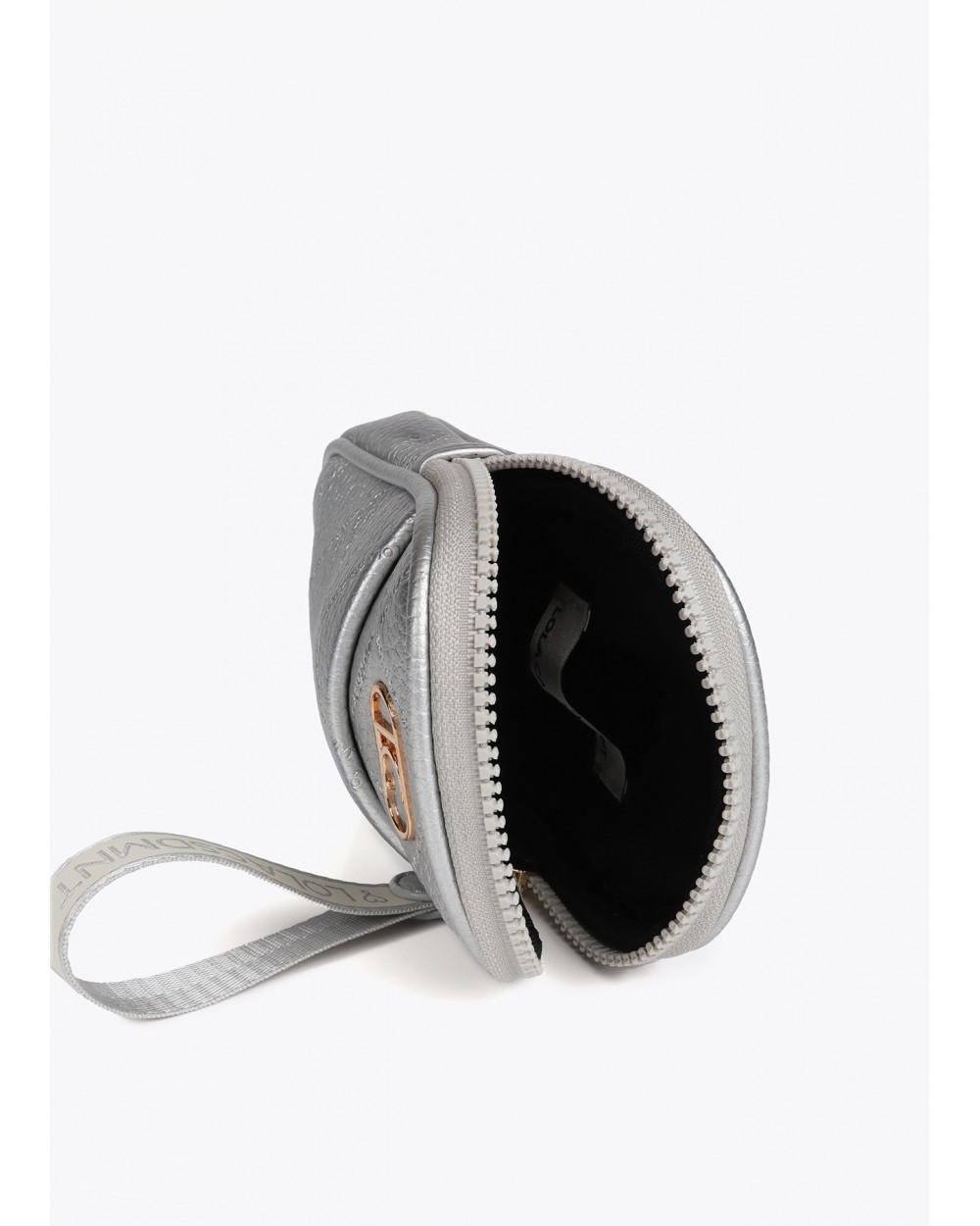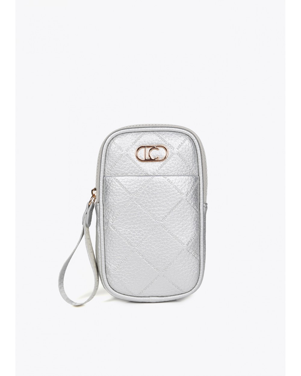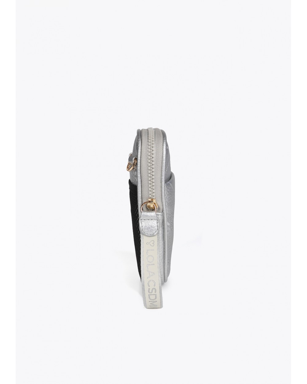 Bolso para mòvil con diseño de logo en forma de monograma en rombos. Con correa ajustable , en color plateado metalizado y cierre con cremallera. Logotipo en metal dorado.