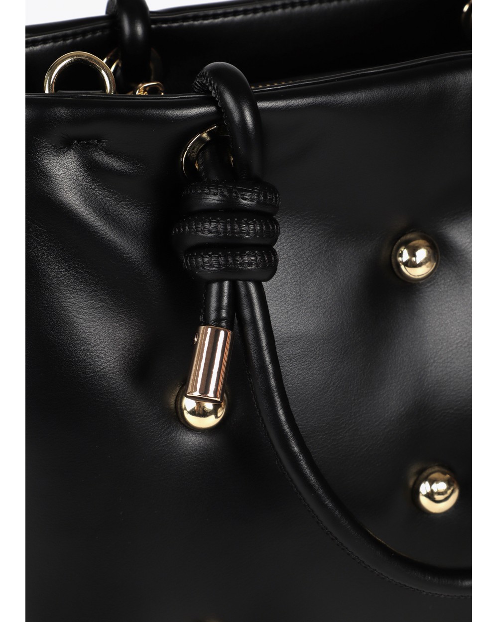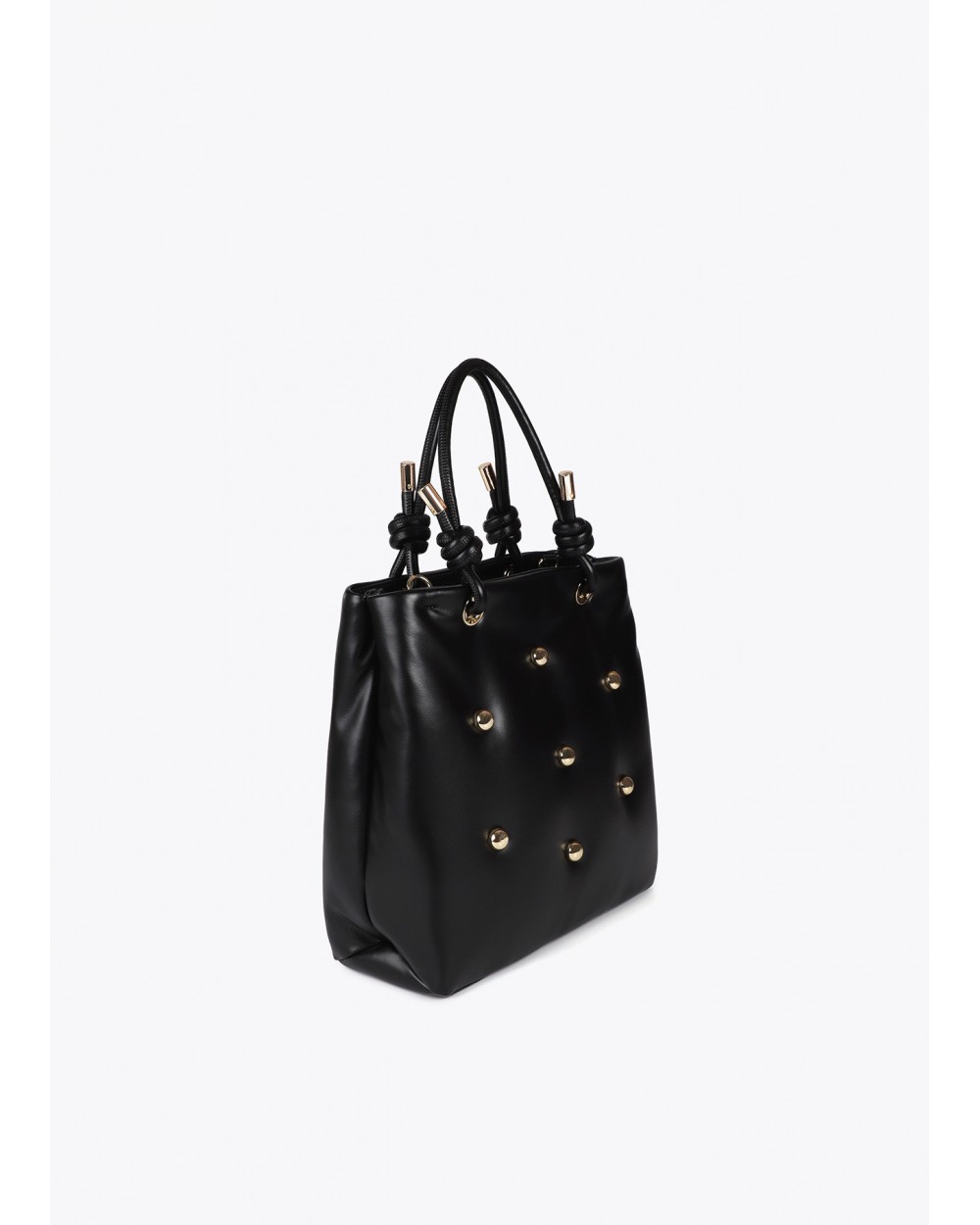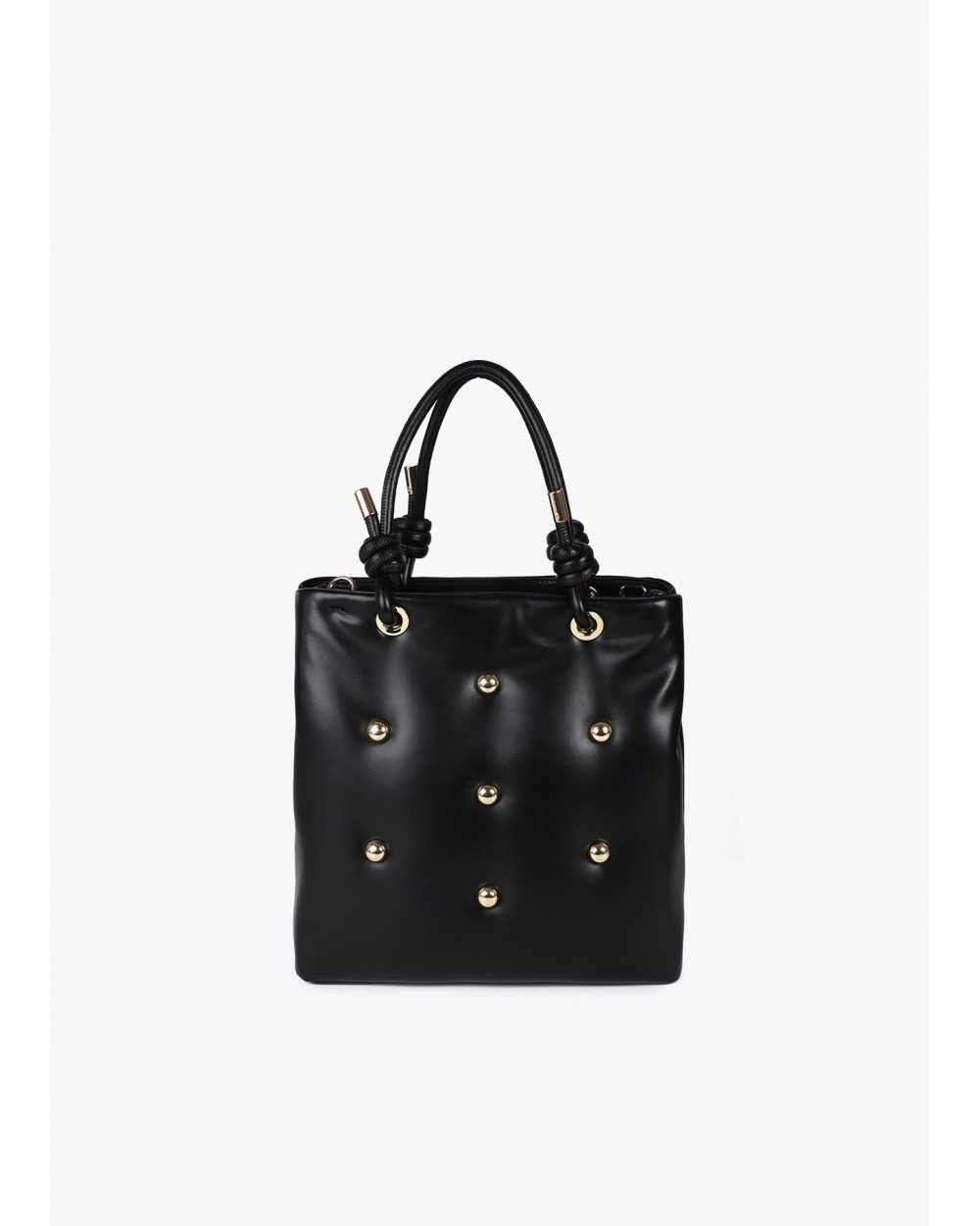Bolso grande acolchado en efecto piel y tachas. Con asas cortas fija y correa larga ajustable a tono con el bolso. Cierre con cremallera.