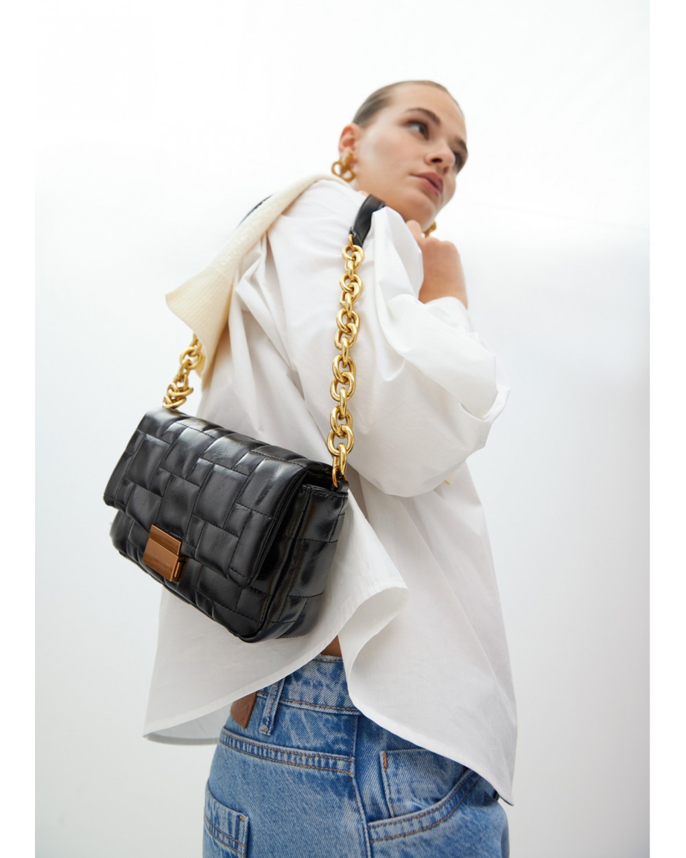 Bolso bandolera acolchado en simil piel con cierre automàtico con logotipo personalizado de Lola Casademunt. Asa larga con cadena y polipiel, interior forrado con varios compartimentos.