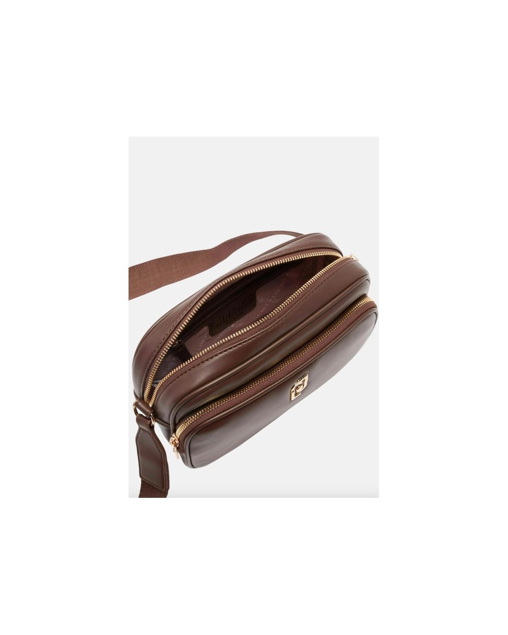 Bolso con doble compartimento, cerrado con cremallera,logo en metal dorado, correa ajustable y bolsillo interior, forro interior con logo