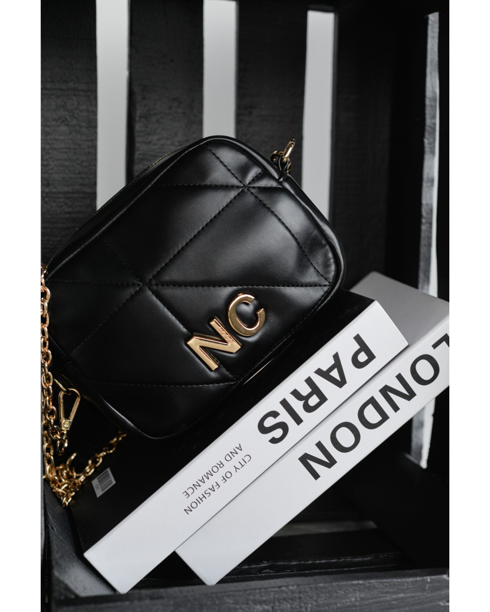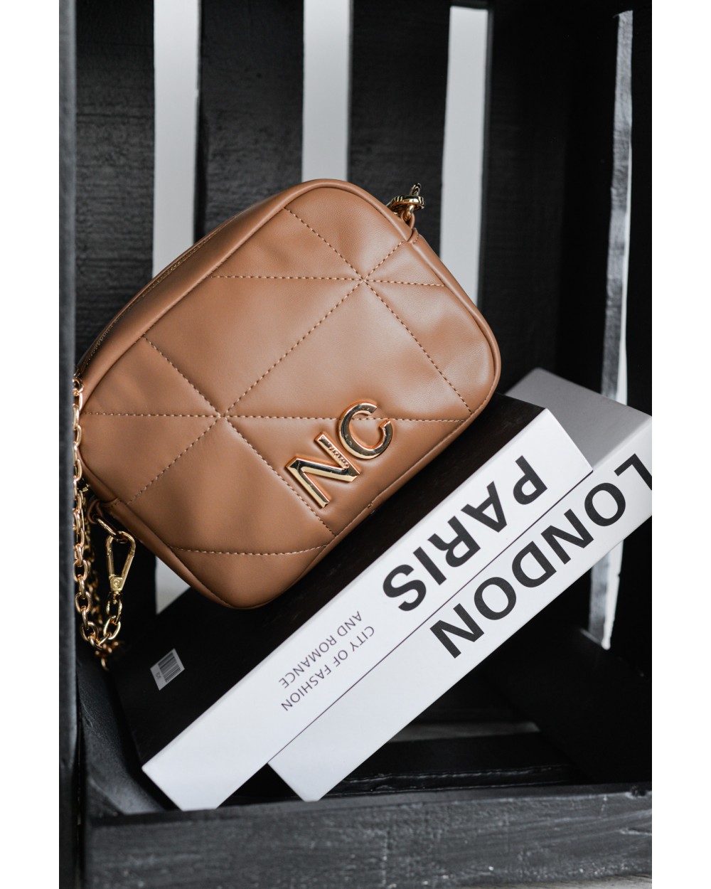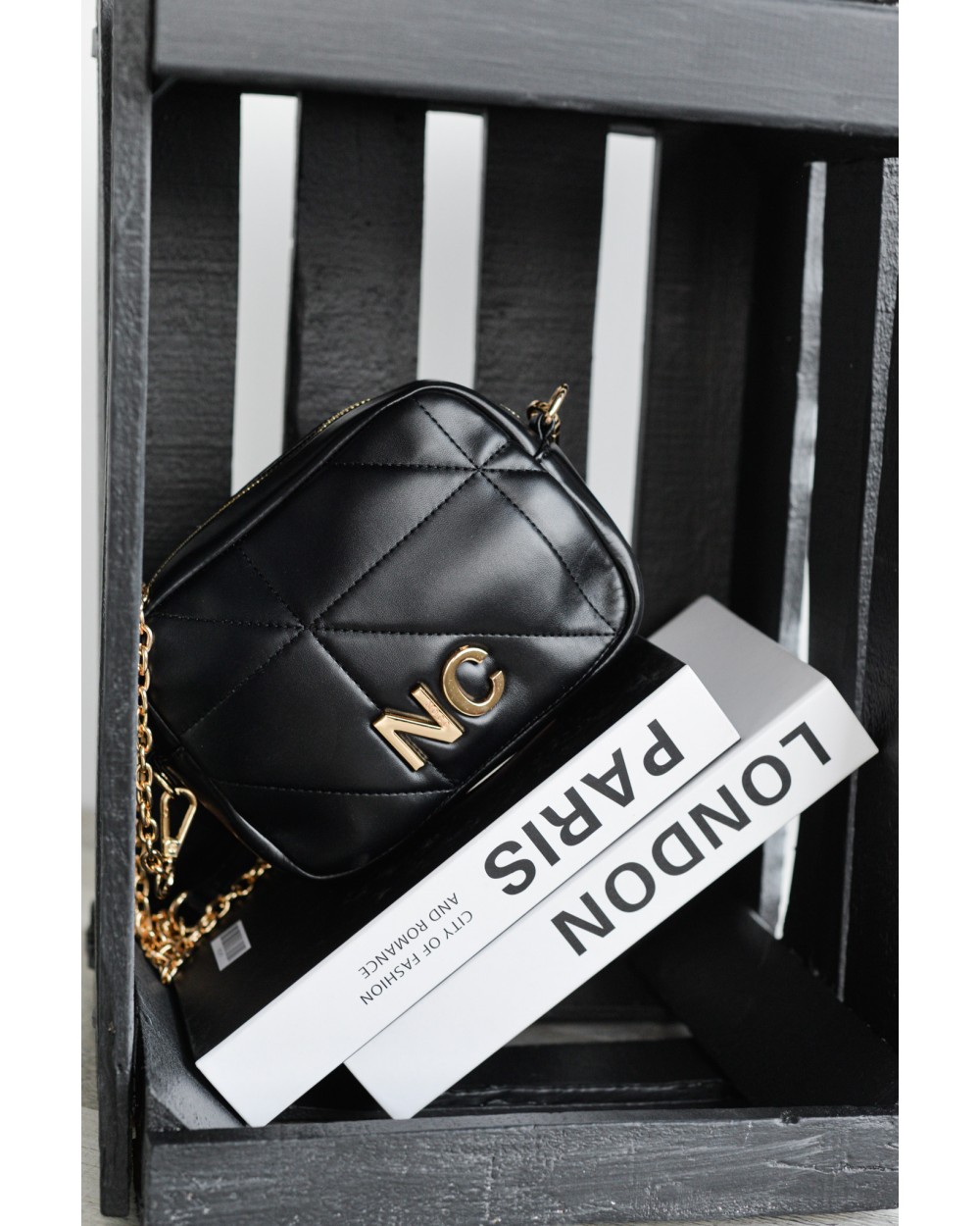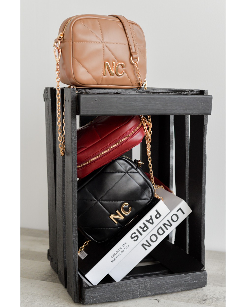 Bolso bandolera pequeña confeccionada en piel vegana lisa y suave, con cremallera superior y cadena dorada con detalle de aplique en piel vegana para el hombro.