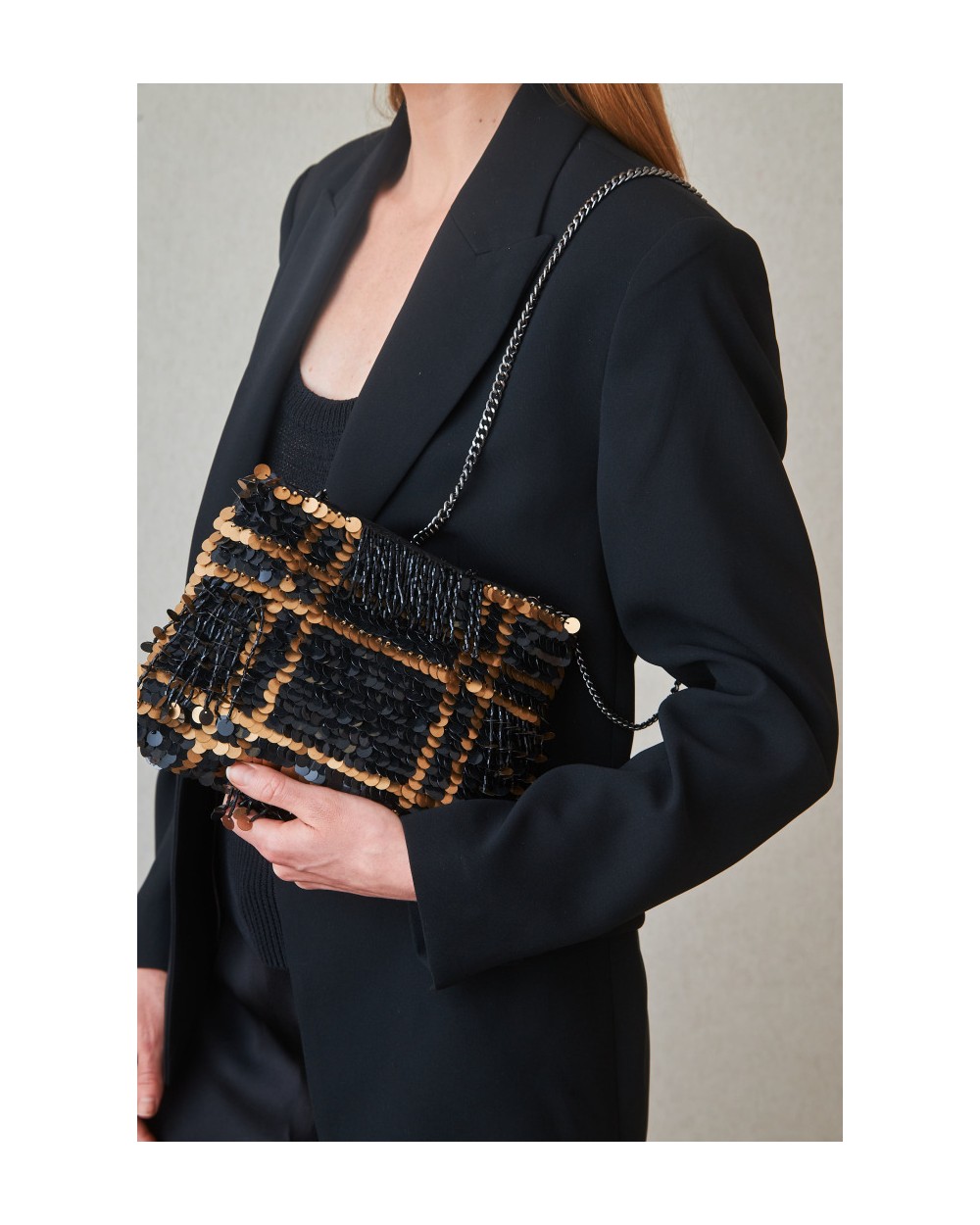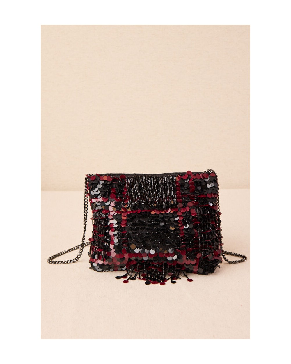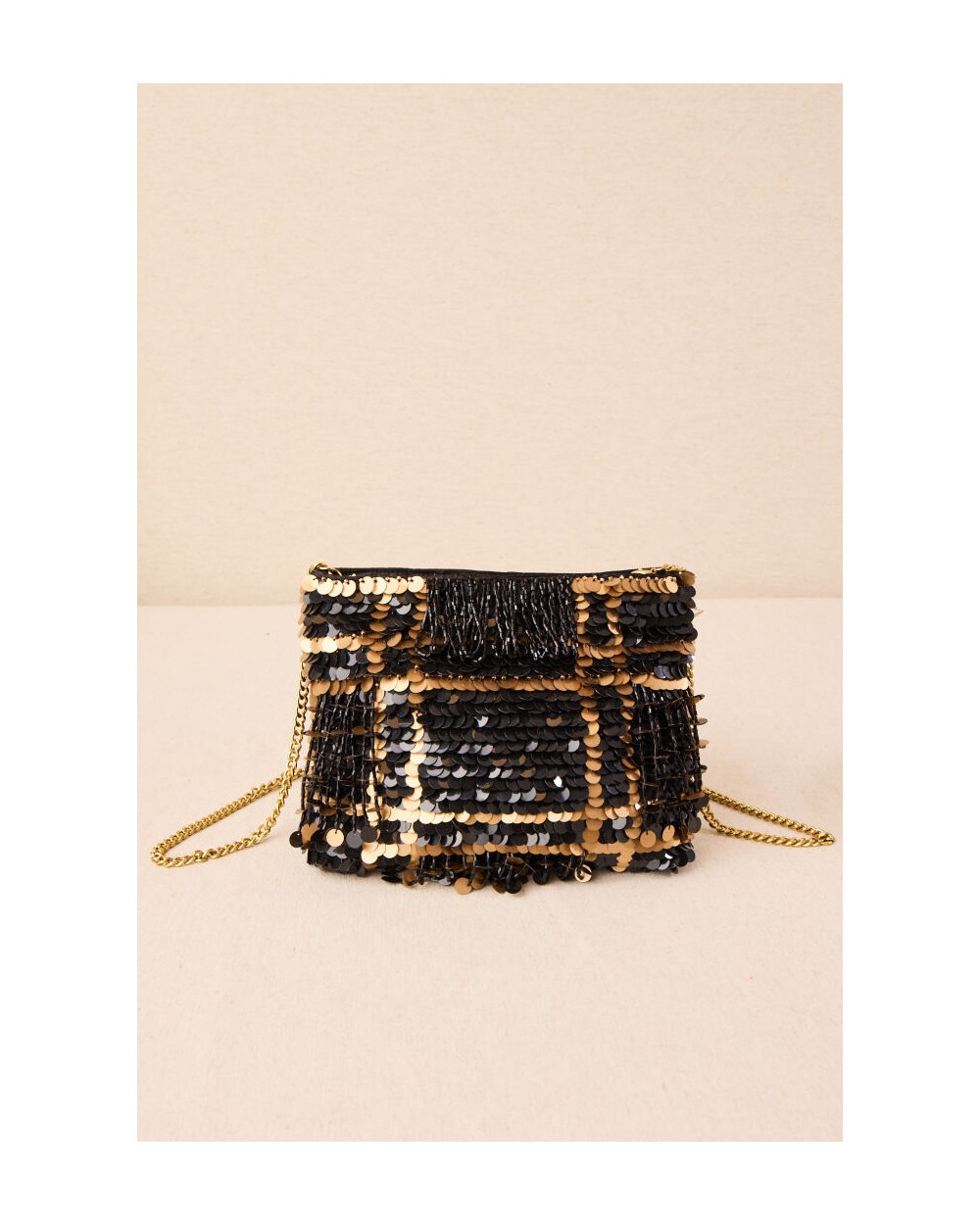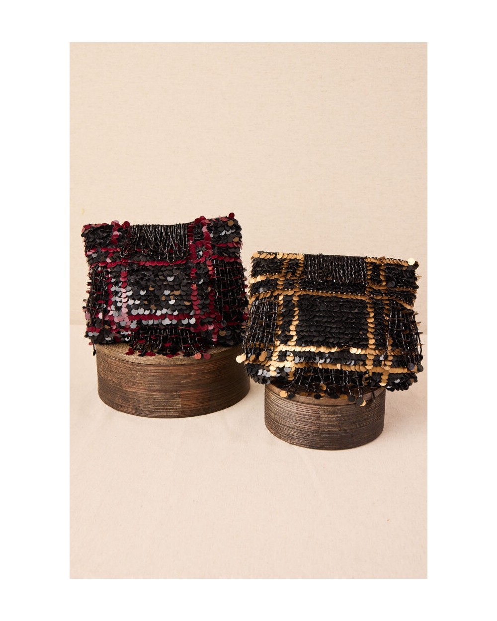 Cartera de lentejuelas negra de Latido, una con detalles de lentejuelas doradas y otra con lentejuelas granate.