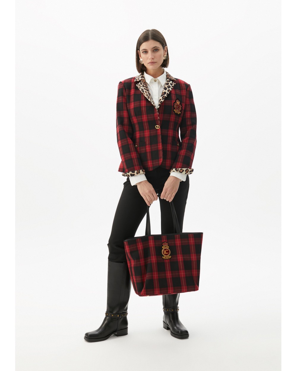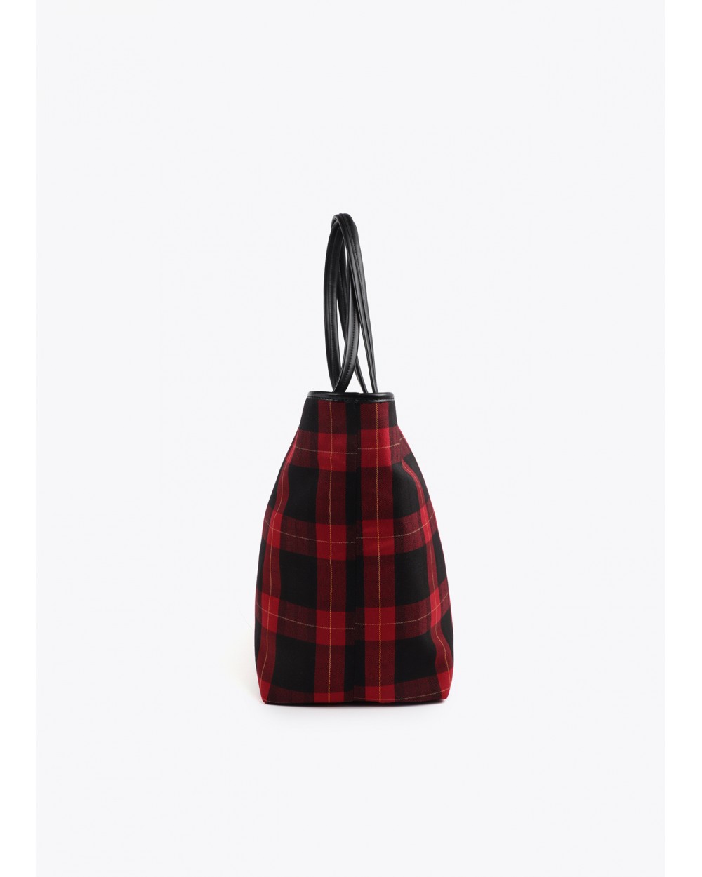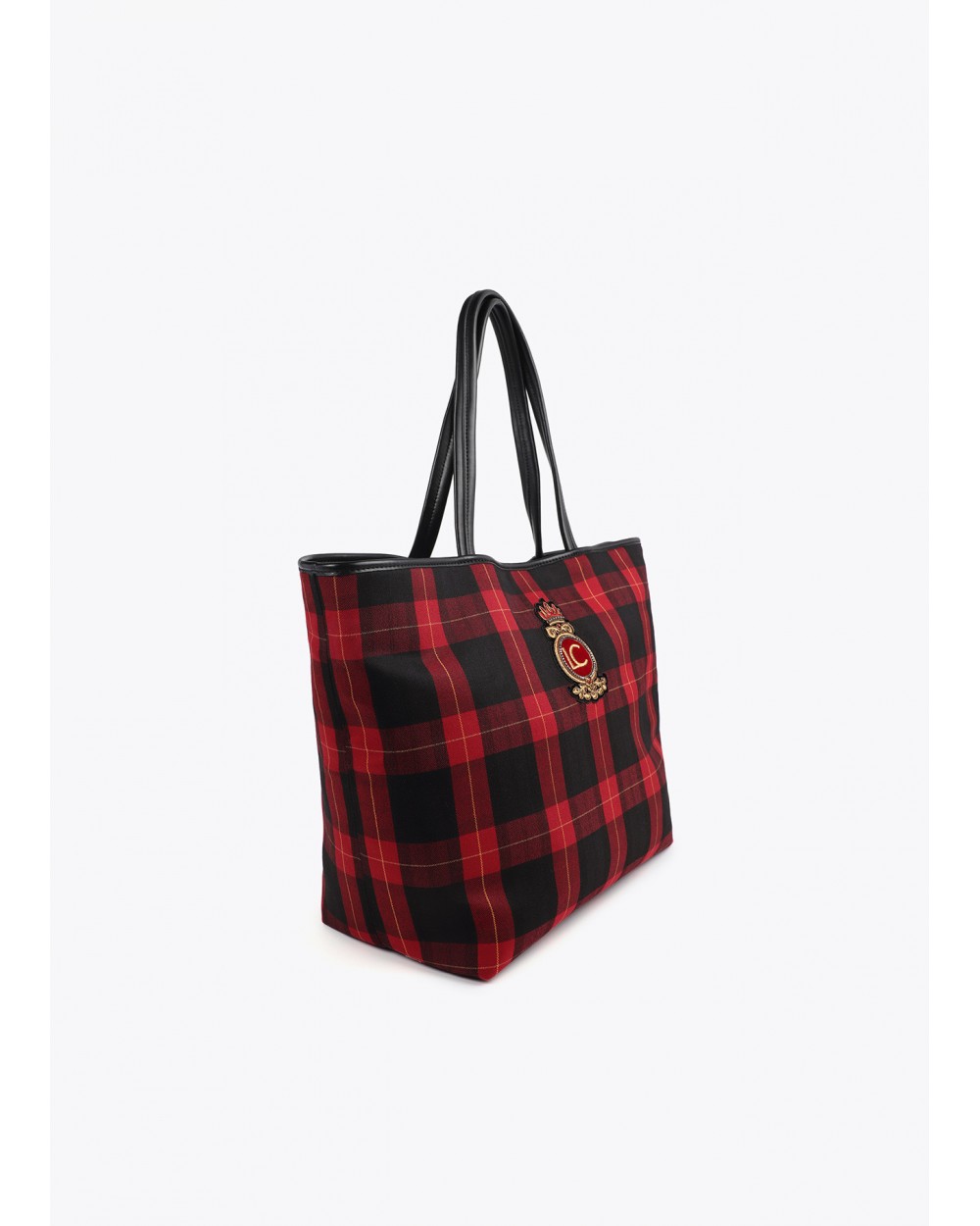 Bolso shopper con estampado de cuadros en tonos rojos y negros. Destaca el parche de escudo bordado en la parte frontal. Asa larga para mayor comodidad. Interior amplio y forro suave de terciopelo. Ideal para el día a día con estilo.