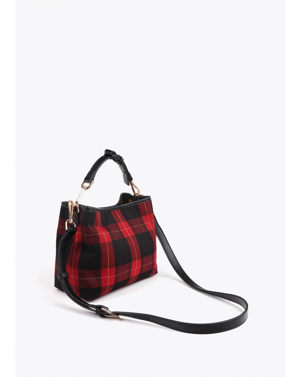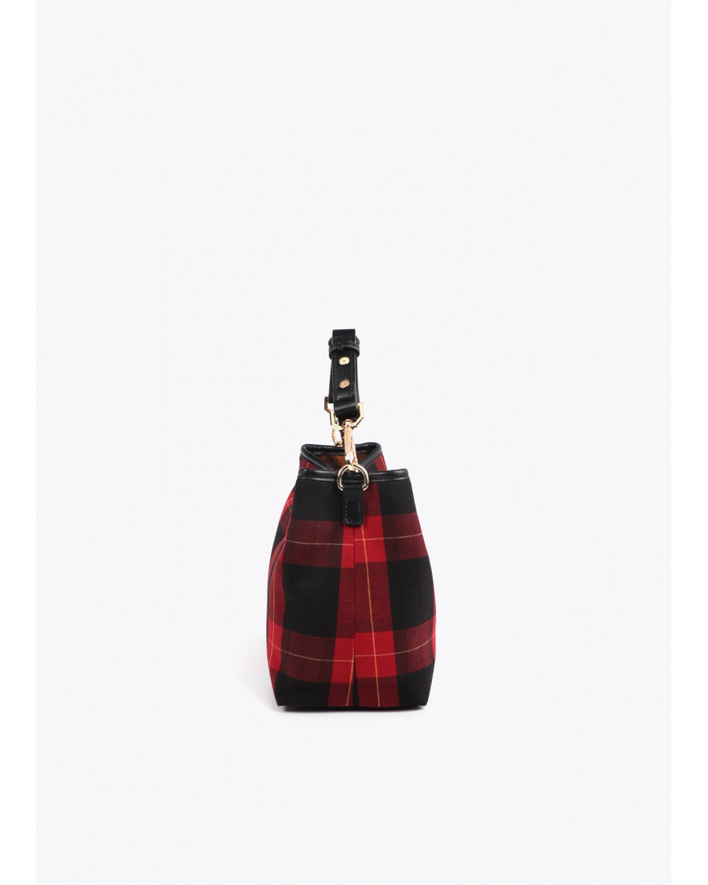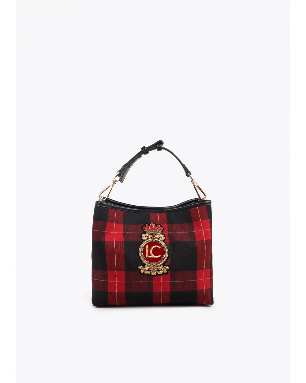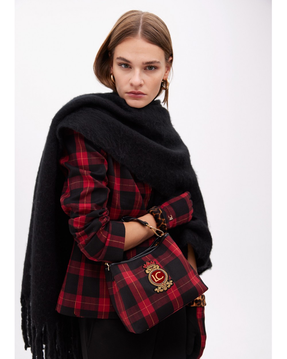 Bolsito tejido con diseño de cuadros, decorado con un parche de escudo . Correa ajustable y cierre de cremallera superior. Interior forrado con bolsillos prácticos.